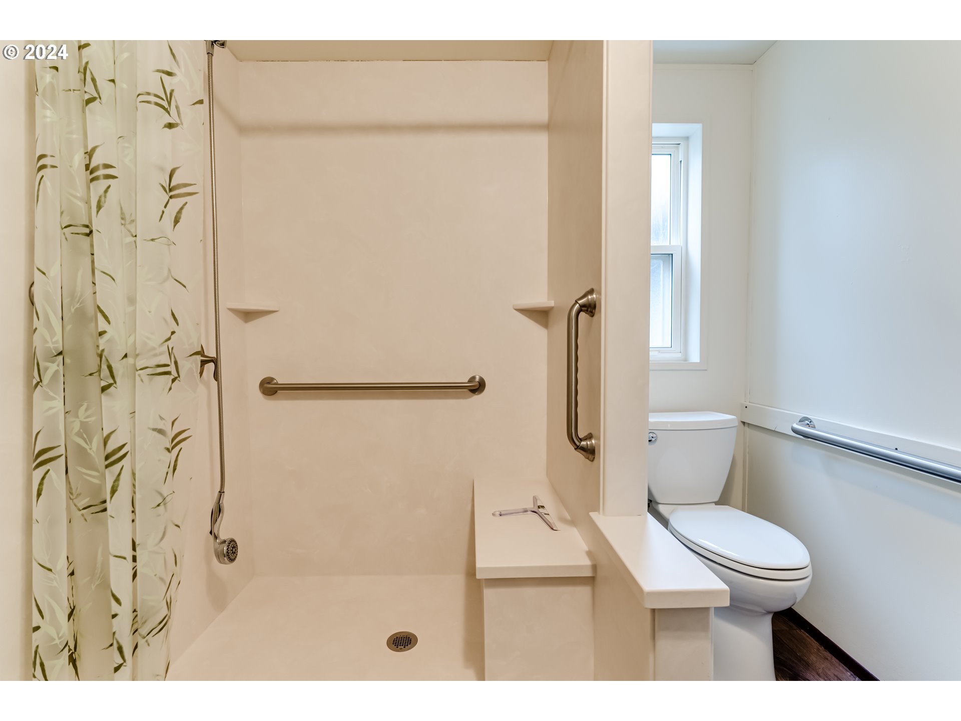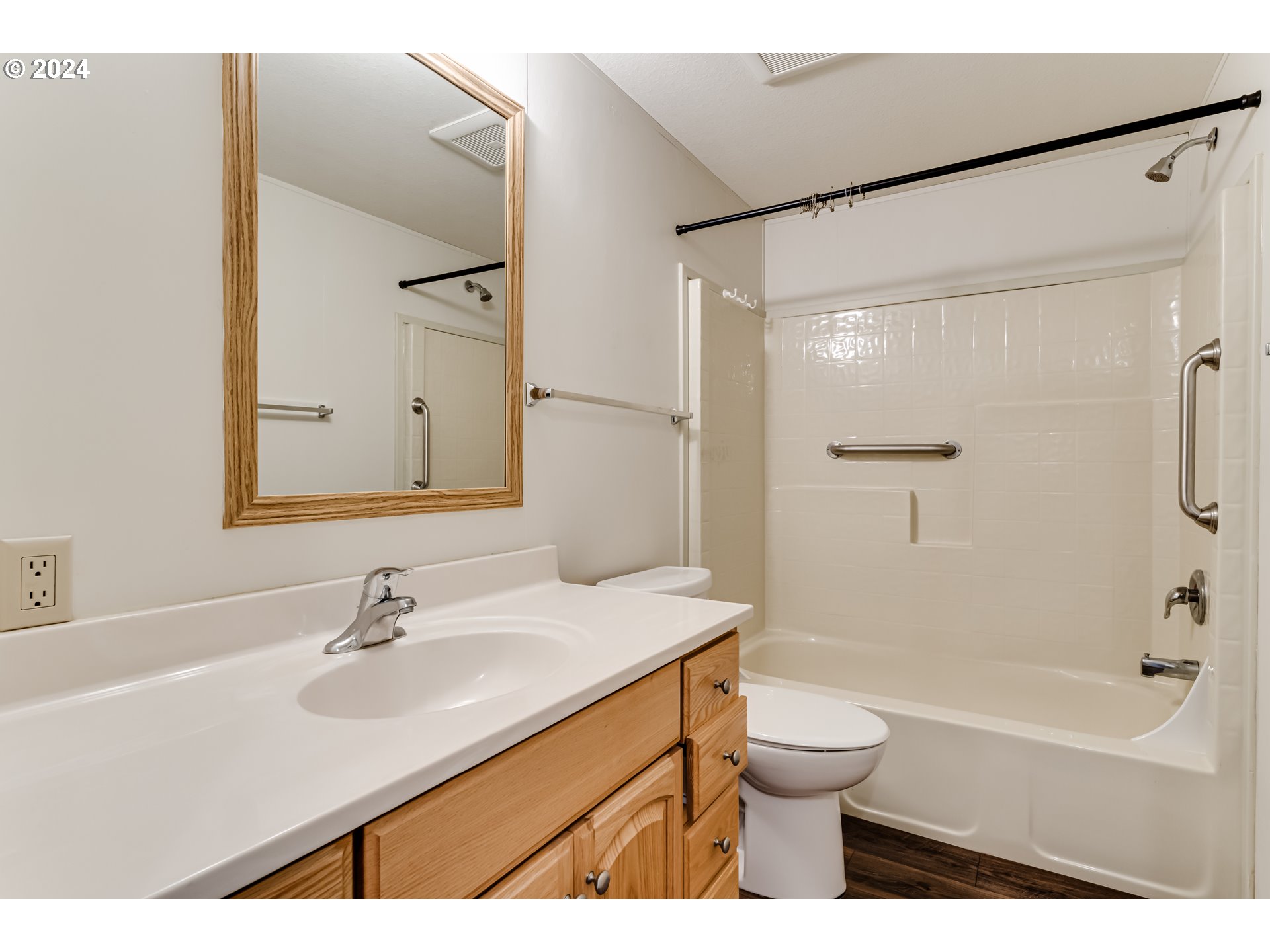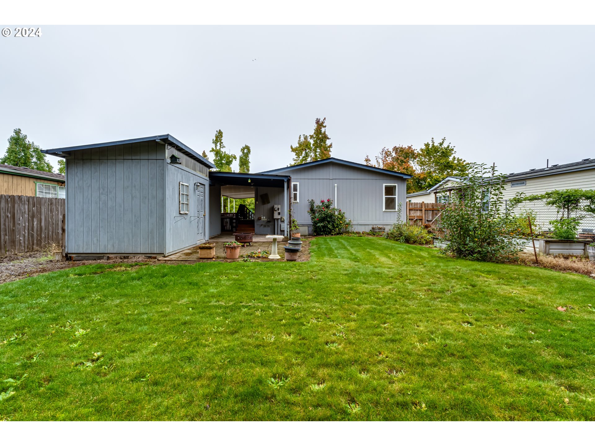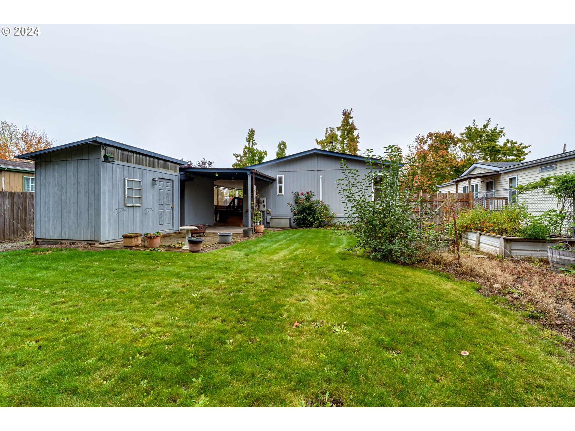 Clean and easy living. Brand new carpet in bedrooms and living room. Large primary bedroom with ensuite. Ductless heat pump with three units for cooling and efficient heating. New toilets. Accessibility options include wheel chair ramp and roll-in shower. All-ages park with affordable space rent. Conveniently located near shopping, bus lines and easy freeway access. Two storage sheds with electricity in addition to the carport and RV Parking pad.
