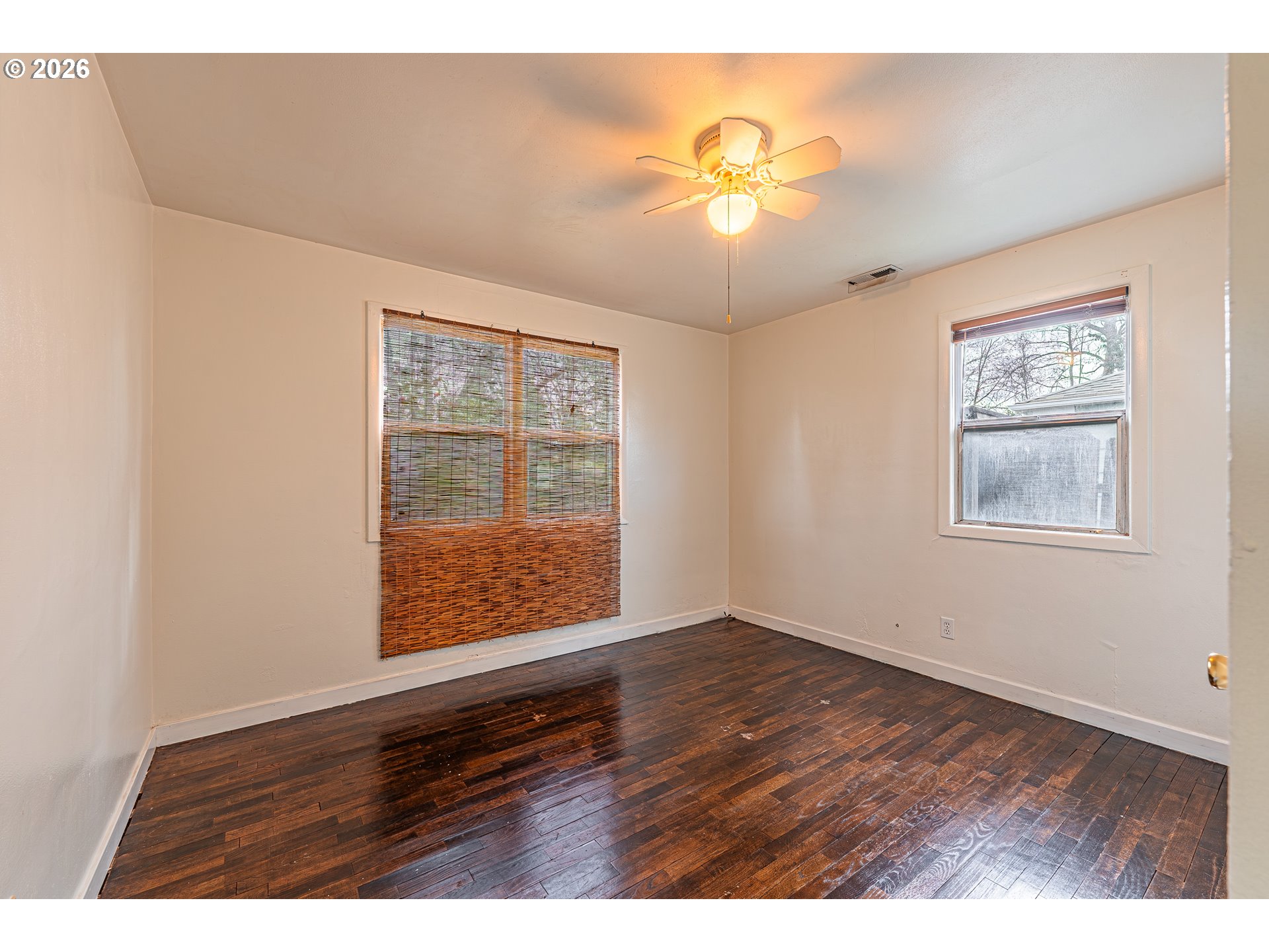 Charming bungalow with exciting potential! This 2 bedroom, 1 bath home sits on a spacious quarter acre lot with easy access to the backyard and plenty of room to spread out. Refurbished hardwood floors bring warmth and character to much of the living space. An unfinished sunroom just off the kitchen was previously used as an outdoor kitchen and grilling area and offers great potential as additional living space, such as a family room or even an extra bedroom. The property also features a two car garage and several useful outbuildings that provide extra space for hobbies, storage, or projects. A great opportunity to add your own touch and build equity in a charming home.