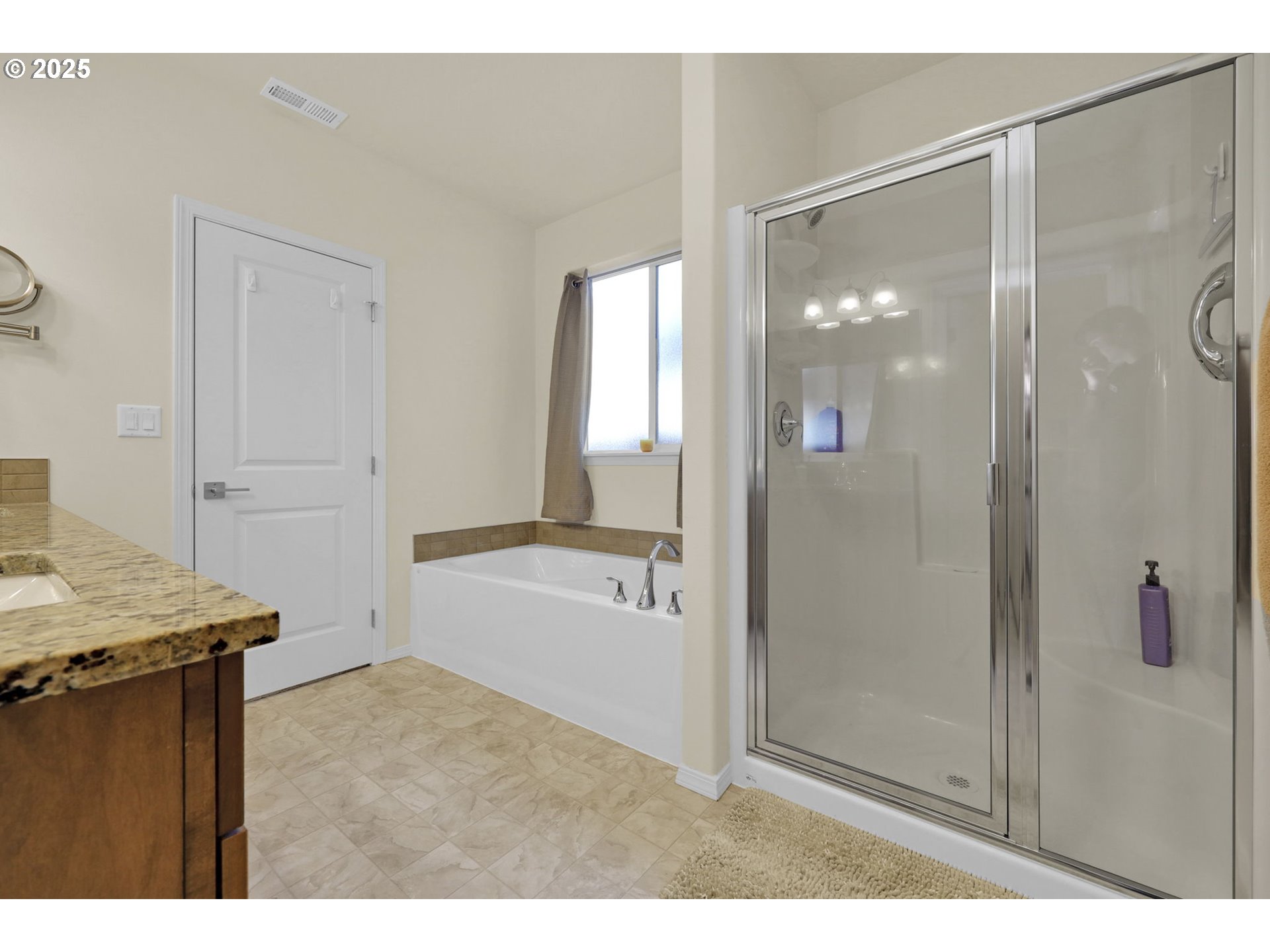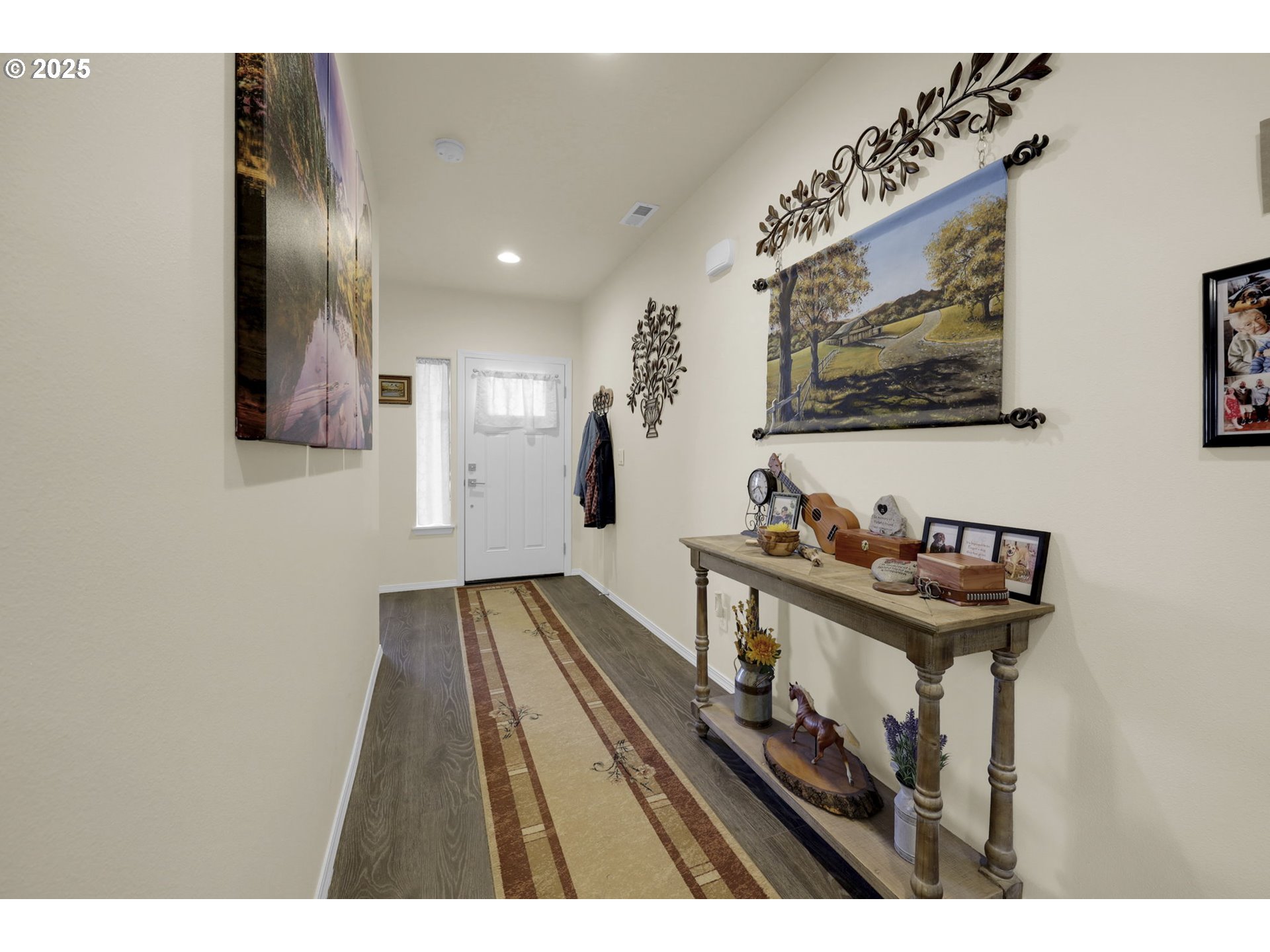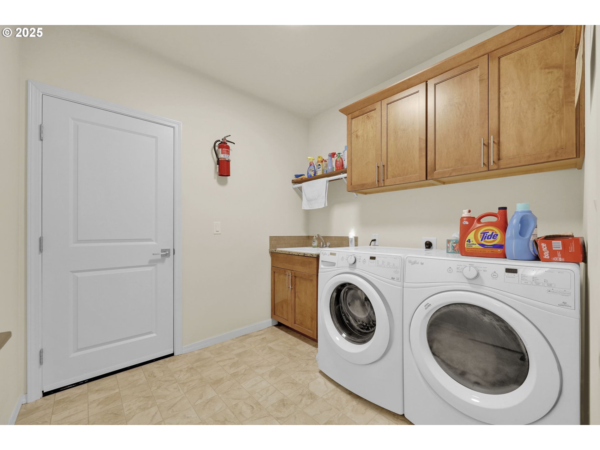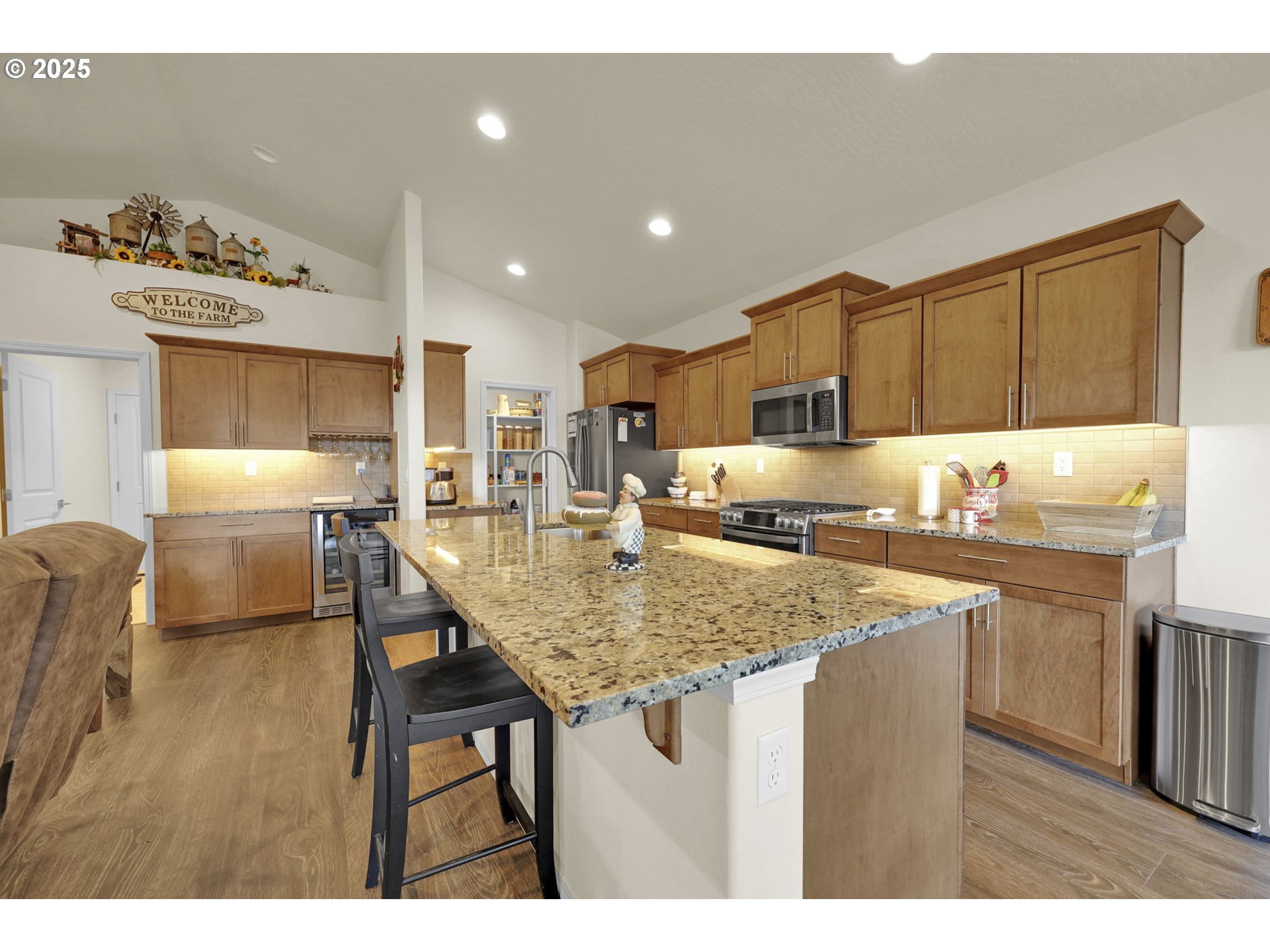 Built in 2022, this single-level 3 bed/2 bath home in the Woodland Ridge Community is the largest one-story home in the neighborhood! Upon arrival, you will notice a 12' x 20' gated concrete pad that can store an RV, boat, extra vehicles or toys. The hallway entry leads up to a spacious great room with laminate flooring, vaulted ceilings and a cozy gas-burning fireplace. The kitchen boasts stainless steel appliances, an island, walk-in pantry, and a 2' x 5' wine bar with built-in wine fridge. The dedicated dining nook flows right off the kitchen and has ample space for a large table. The primary bedroom has a spacious ensuite with double sinks, soaking tub, freestanding shower and walk-in closet. There are two additional guest bedrooms separated by a guest bathroom, and an added den that serves as the perfect flex space. Through the laundry room you'll find an extra deep 2-car garage, great for parking, working, storage and more. Step into the nicely landscaped backyard with a brand-new back deck and enjoy the sunshine of Oregon summers or keep dry from the rain under the covered patio and let the home's French drains do their work. Come see all this wonderful property has to offer, call now to schedule your tour today!