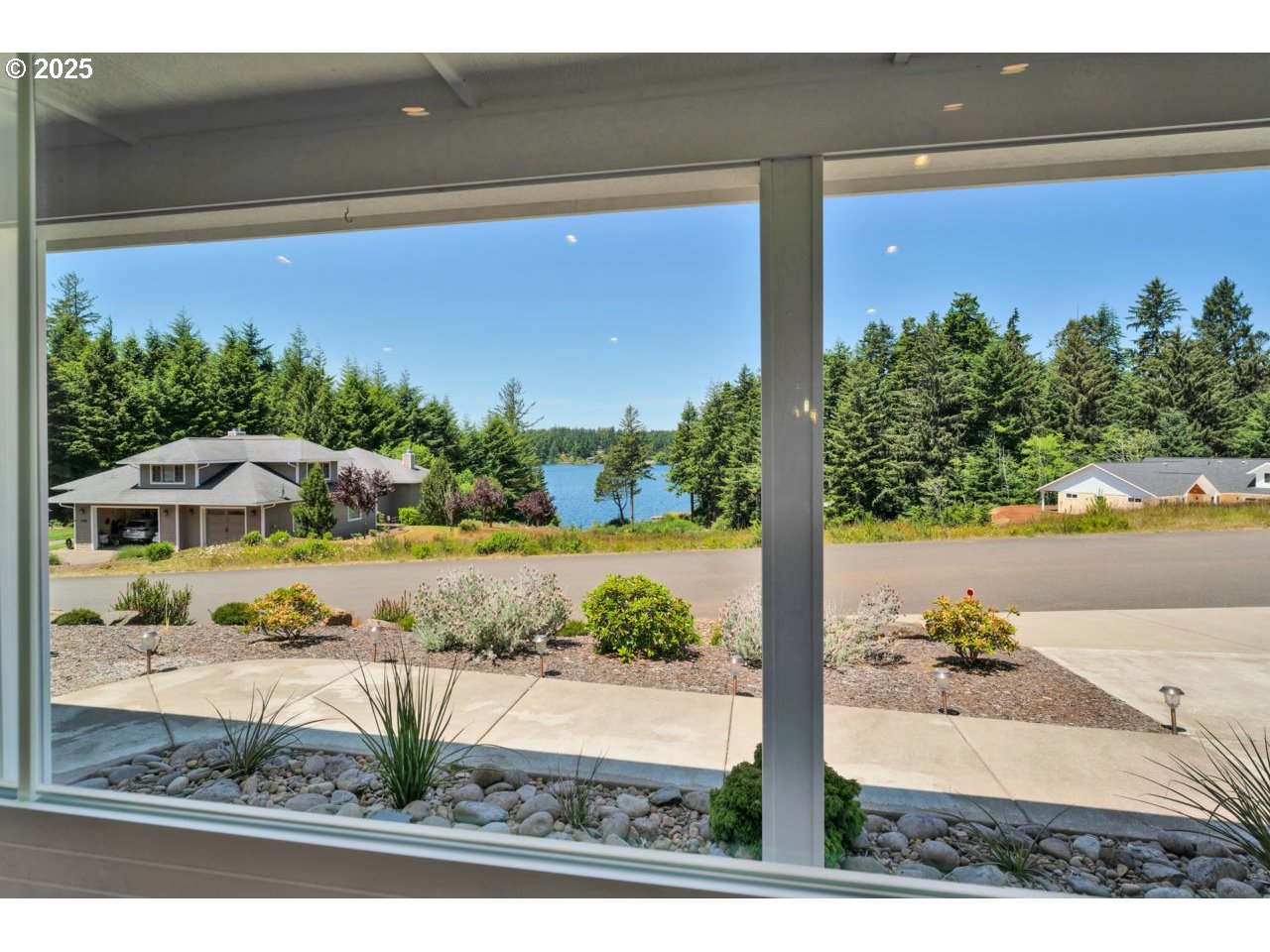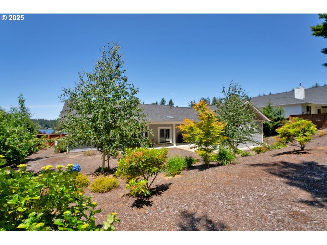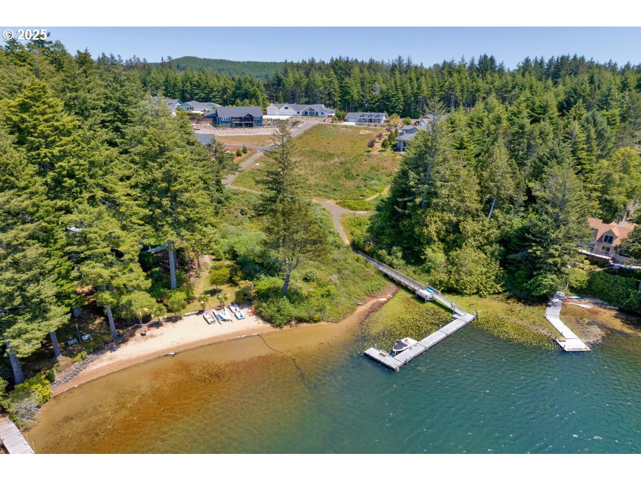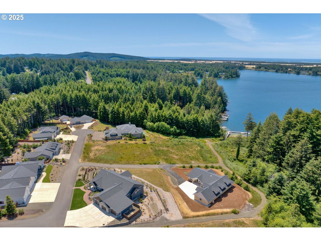 Like new home in the gated, private Woahink Lake neighborhood of Sunset Cove. Great views of the lake and a shared community dock give you endless opportunities to delight in one of Florence's most popular lakes, while only ten minutes from town. When you aren't at the lake, savor your half acre lot that includes Fuji apple trees, blueberry bushes and an array of quality landscaping. The privacy of the covered back patio will give you a space to enjoy all year long. Inside you'll find a fully furnished home that exudes a modern color scheme and consistent decor throughout. The open floor plan with vaulted ceilings and electric fireplace is the perfect setting for the end of a day on the lake or a cozy evening in on a rainy day. Spacious primary suite with patio access and roomy walk-in closet on one side of the house and two bedrooms and full bath on the opposite side. A kitchen made for cooking and entertaining with a sizable island that opens to the great room. Come & see why the lake areas of Florence are desired.