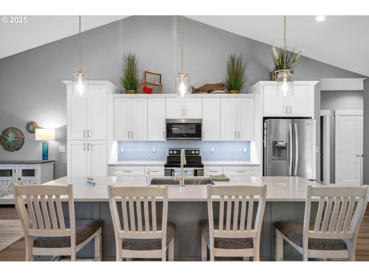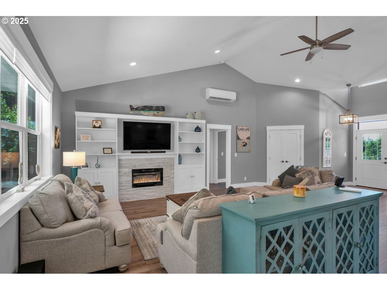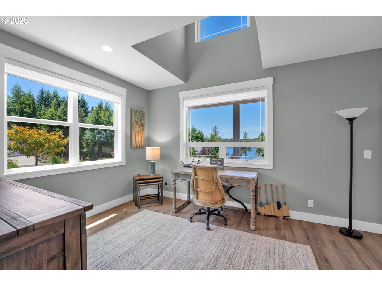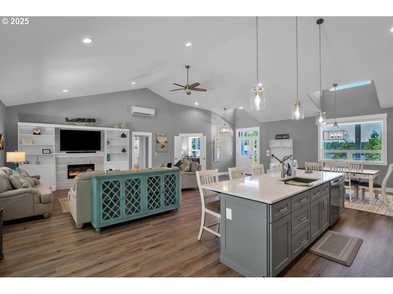 Like new home in the gated, private Woahink Lake neighborhood of Sunset Cove. Great views of the lake and a shared community dock give you endless opportunities to delight in one of Florence's most popular lakes, while only ten minutes from town. When you aren't at the lake, savor your half acre lot that includes Fuji apple trees, blueberry bushes and an array of quality landscaping. The privacy of the covered back patio will give you a space to enjoy all year long. Inside you'll find a fully furnished home that exudes a modern color scheme and consistent decor throughout. The open floor plan with vaulted ceilings and electric fireplace is the perfect setting for the end of a day on the lake or a cozy evening in on a rainy day. Spacious primary suite with patio access and roomy walk-in closet on one side of the house and two bedrooms and full bath on the opposite side. A kitchen made for cooking and entertaining with a sizable island that opens to the great room. Come & see why the lake areas of Florence are desired.