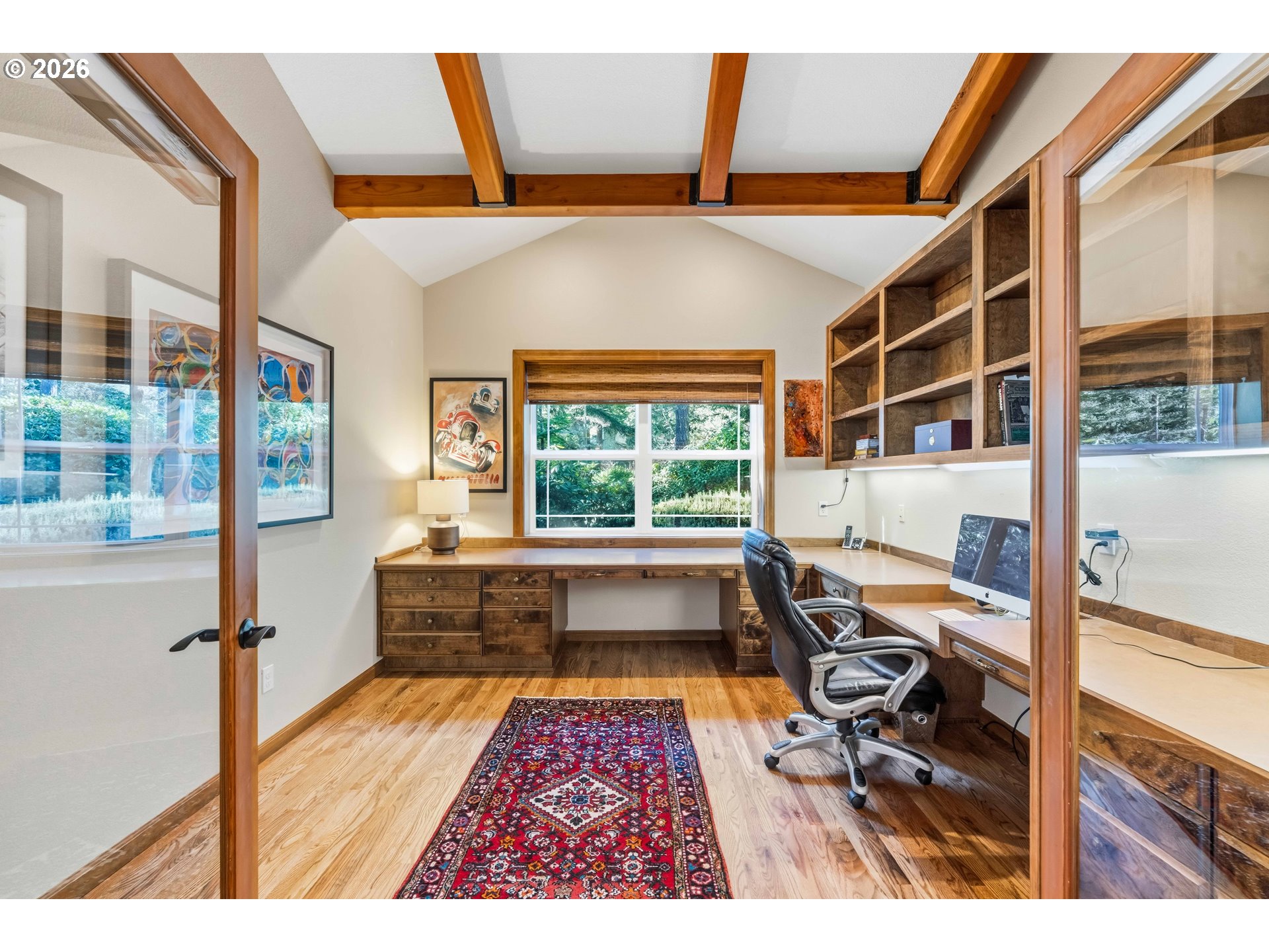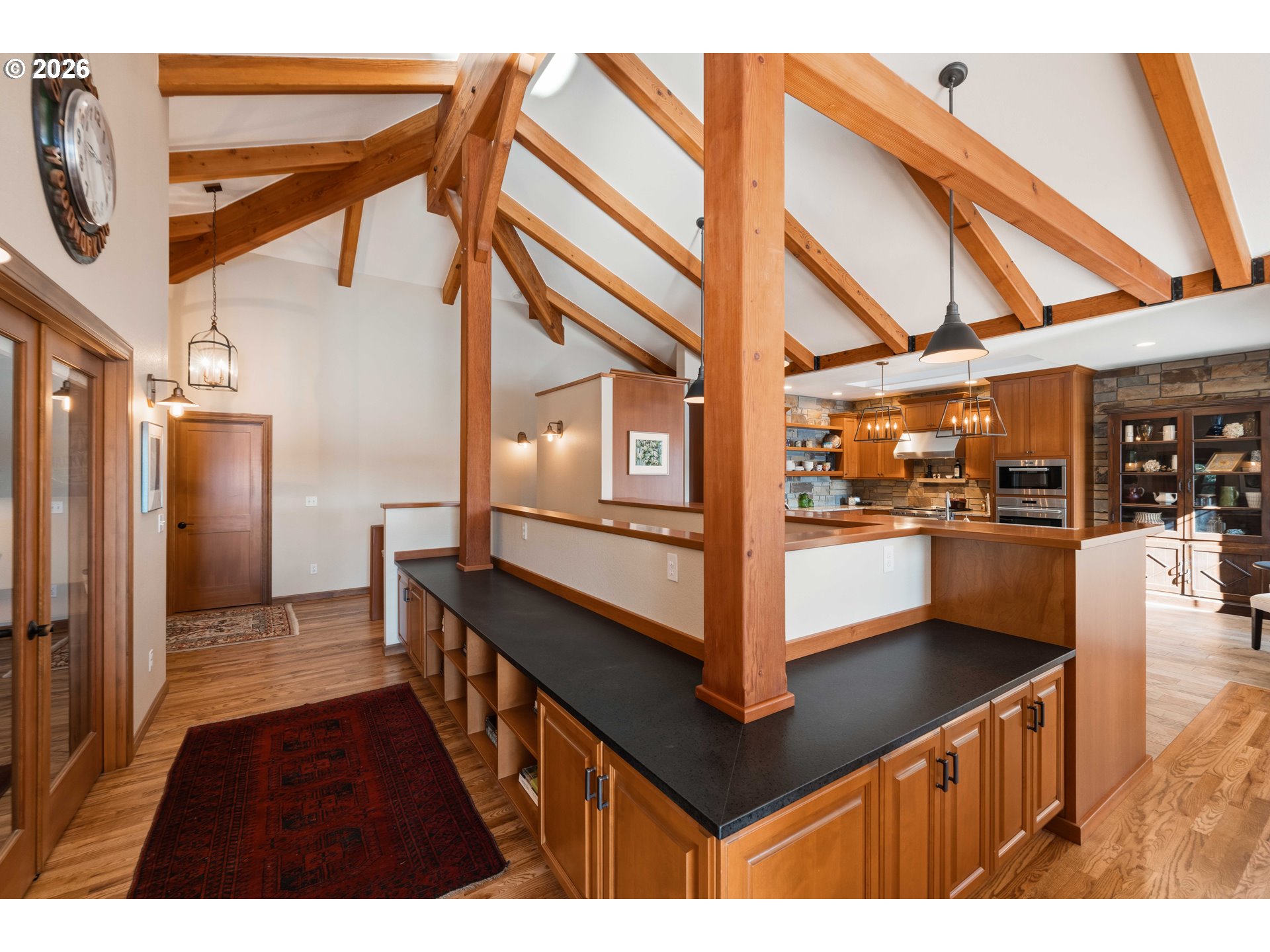 Behind a private gated entrance and sitting on 387 feet of pristine Woahink Lake shoreline, this extraordinary waterfront estate captures the kind of sunrise views that redefine mornings. Extensively remodeled in 2016 by the talented Neil Kelly Design, the timber-frame residence was fully remodeled with uncompromising attention to quality. Insulated concrete form construction provides exceptional strength and energy efficiency, while hand-finished wood floors, vaulted ceilings, and architectural beams create warmth and scale throughout. Walls of glass frame panoramic lake views from the moment you enter. The great room is both dramatic and inviting, anchored by custom cherry built-ins and leathered granite accents — every detail designed to complement the water beyond. The kitchen is a true culinary statement, featuring a Wolf gas range with griddle, Sub-Zero refrigeration, dual Asko dishwashers, Liebherr wine storage, convection ovens, custom dual sinks, and walk-in pantry. It flows seamlessly onto an expansive deck, offering effortless indoor-outdoor living against a breathtaking lake backdrop. The main-level primary suite provides privacy, convenience, and serene views and refined single-level living. A dedicated office with double glass doors is located off the main living area. Downstairs you'll enjoy 2 very spacious guest bedrooms (one currently being used as a family room) along with a spa-like full bath, access to covered patio and abundant storage. A detached finished studio adds flexibility for creative or wellness space. The dock and full boathouse invite endless days on the water, while a whole-home Generac generator ensures uninterrupted comfort. This is more than a lakefront home — it is a stunning property where craftsmanship, privacy, and setting converge in remarkable harmony.