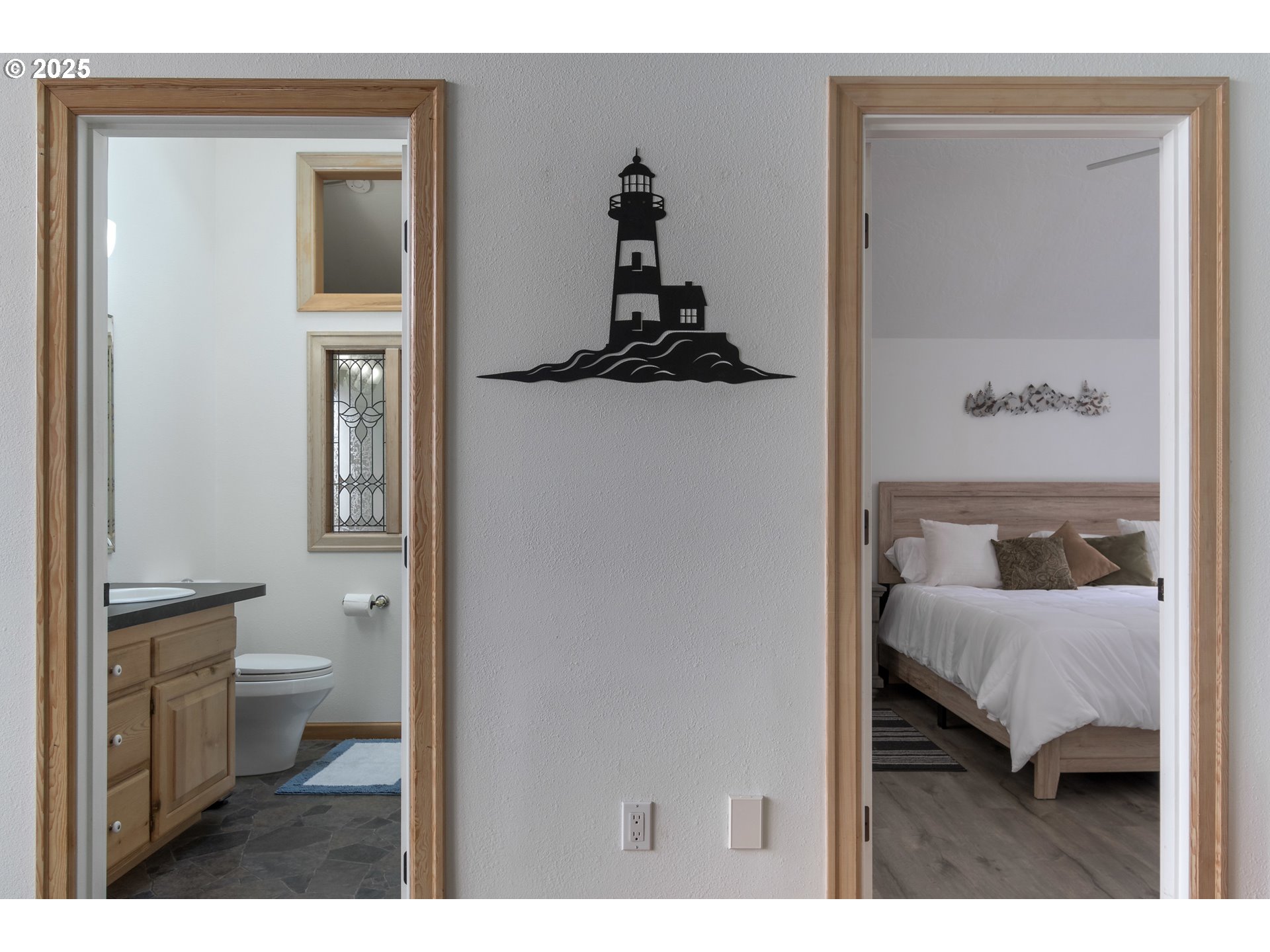 Discover the ultimate in privacy and tranquility with this secluded, end-of-the-road lakefront custom home with approximately 76 feet of coveted Woahink Lake frontage and your very own private dock. Wake up to spectacular uninterrupted views of the lake and Honeyman State Park, with breathtaking panoramic sunsets to the west. The property includes a boat dock with ramp, storage shed, and covered electric boat hoist—ideal for water enthusiasts. This beautifully remodeled home features luxury vinyl planking in the living area and on the stairs leading to the lower level. Recent upgrades include a new house roof (April 2016), garage roof (September 2018), and fresh exterior professional paint (2023). Ten west-facing windows were installed in 2023, complete with motorized shades for convenience and energy efficiency. The main level offers a bright bedroom and a convenient half bath. Downstairs, the spacious primary suite boasts two generous closets, a cozy retreat area, and direct access outside—perfect for unwinding in your private hot tub. A third guest room ensuite features extensive built-in storage, making it ideal as a bedroom or flexible office/hobby room. The oversized, fully insulated, and climate-controlled double garage includes 220v power and a half bath, and is currently used as a game room. Above the second double garage, a finished office/hobby room (used as an additional bedroom) provides even more versatility. Ample attic storage adds to the home’s practicality. Currently operated as a permitted Airbnb with Dunes City, fully furnished for your convenience, this exceptional property promises both a serene private retreat or a savvy investment opportunity—offering a rare blend of luxury, functionality, and income potential on the shores of Woahink Lake.