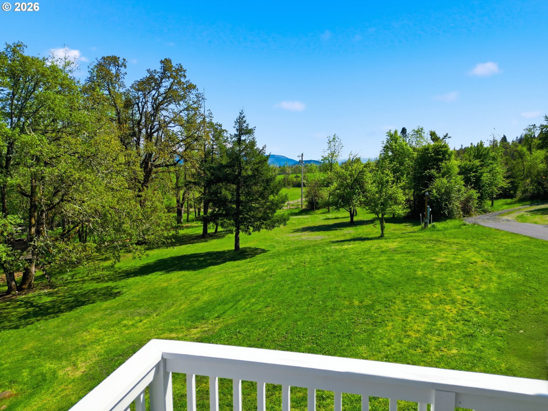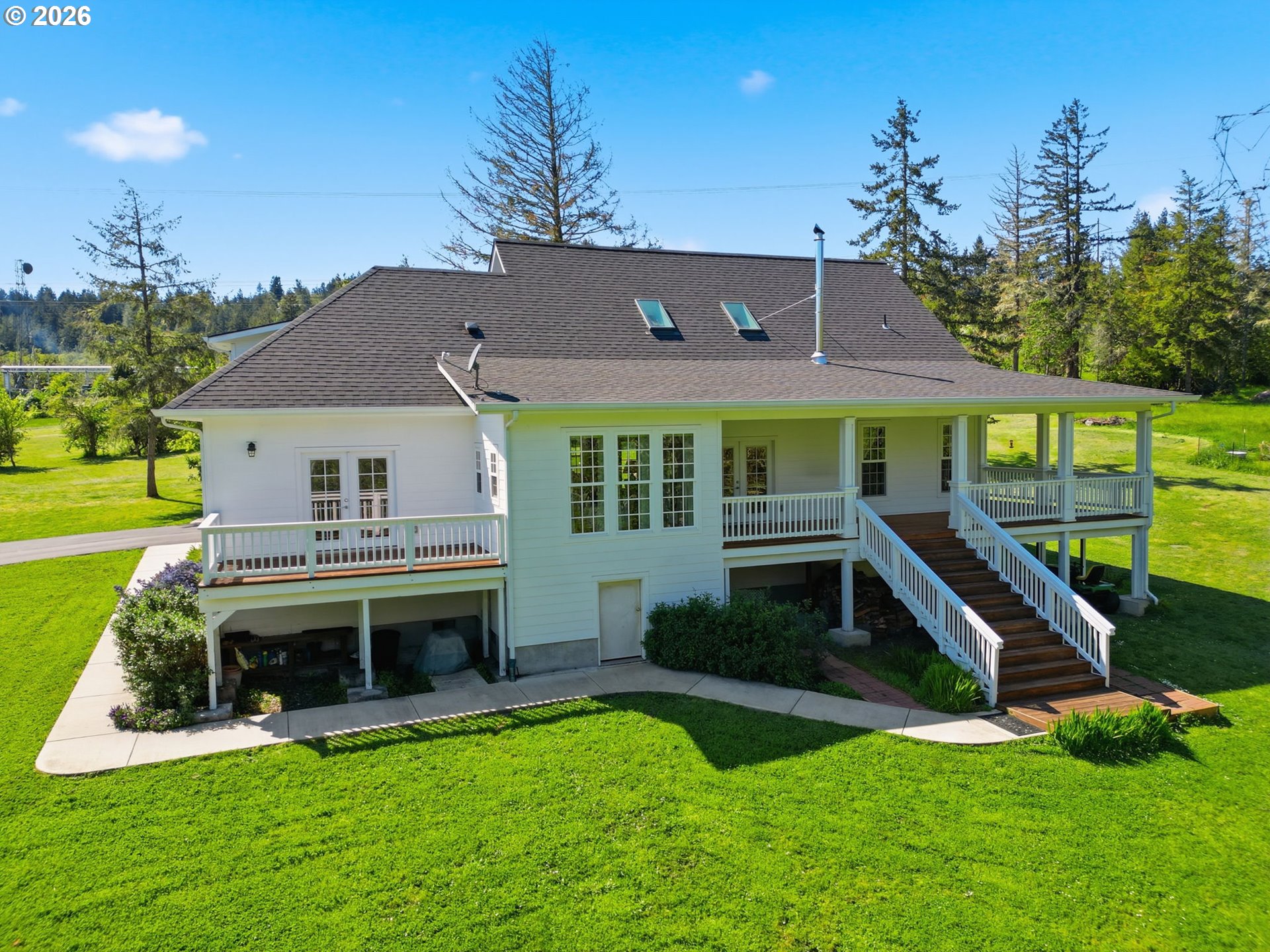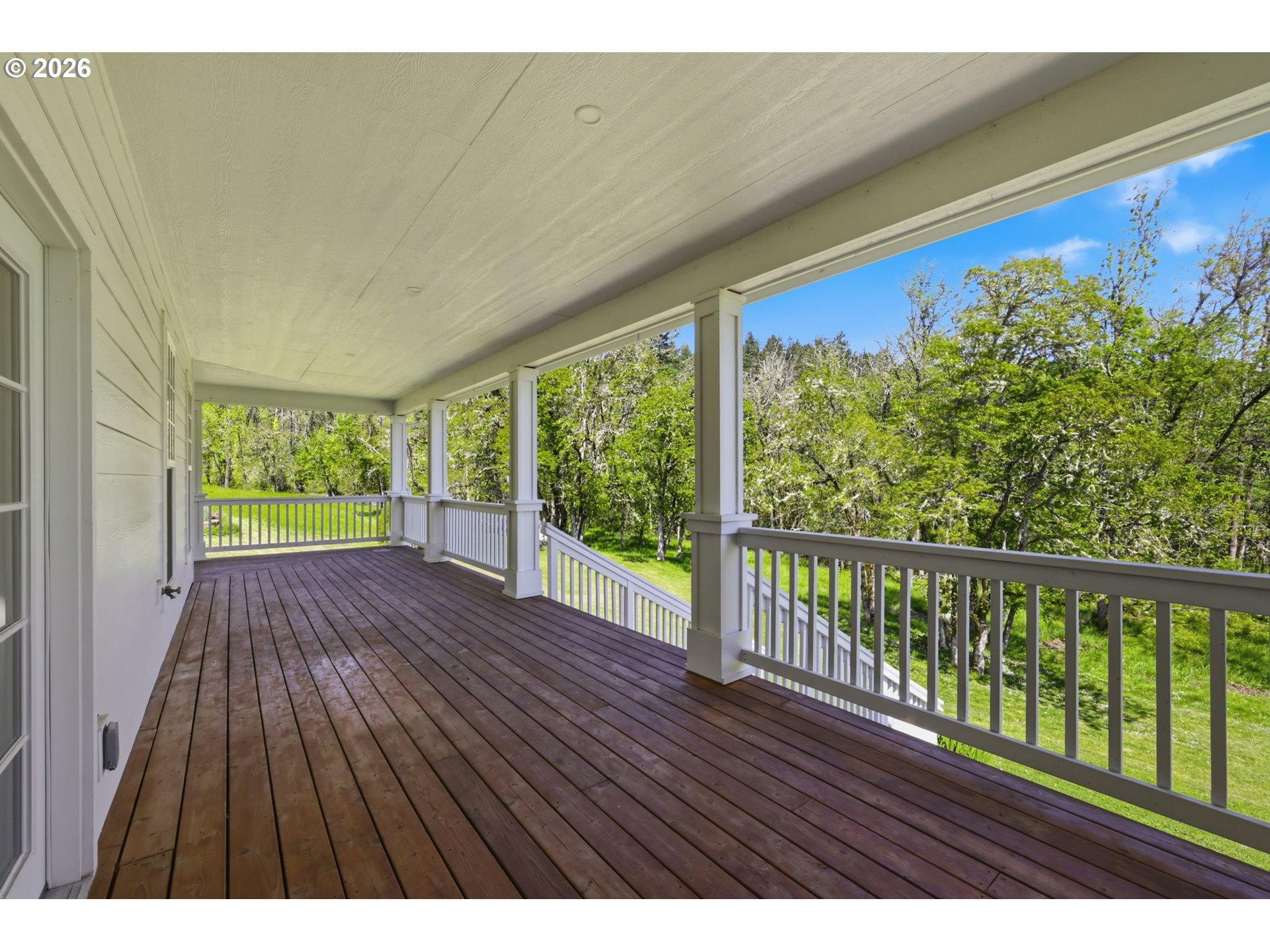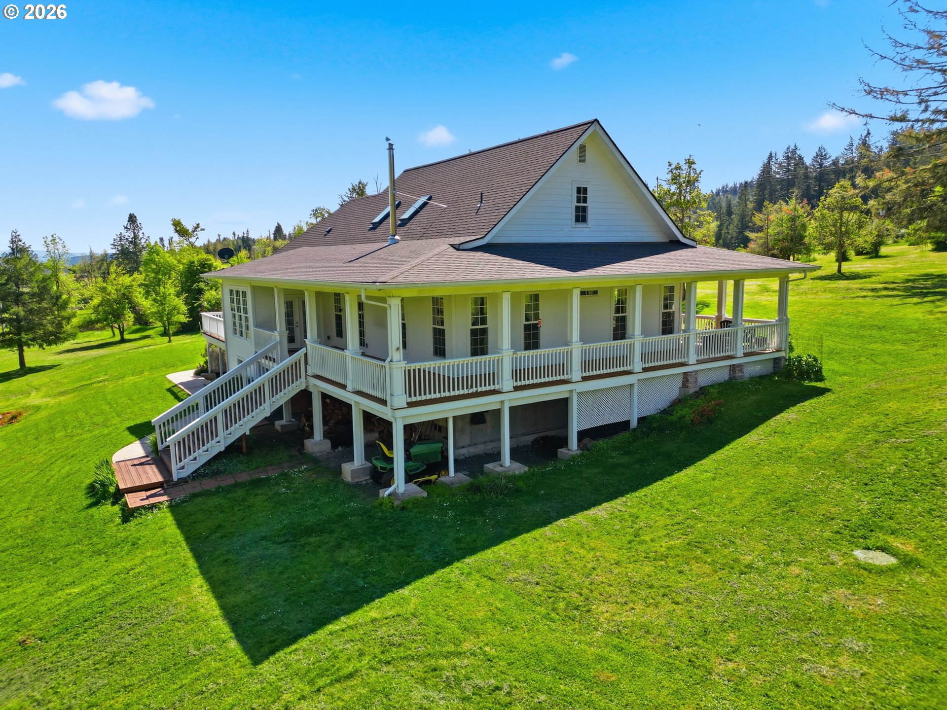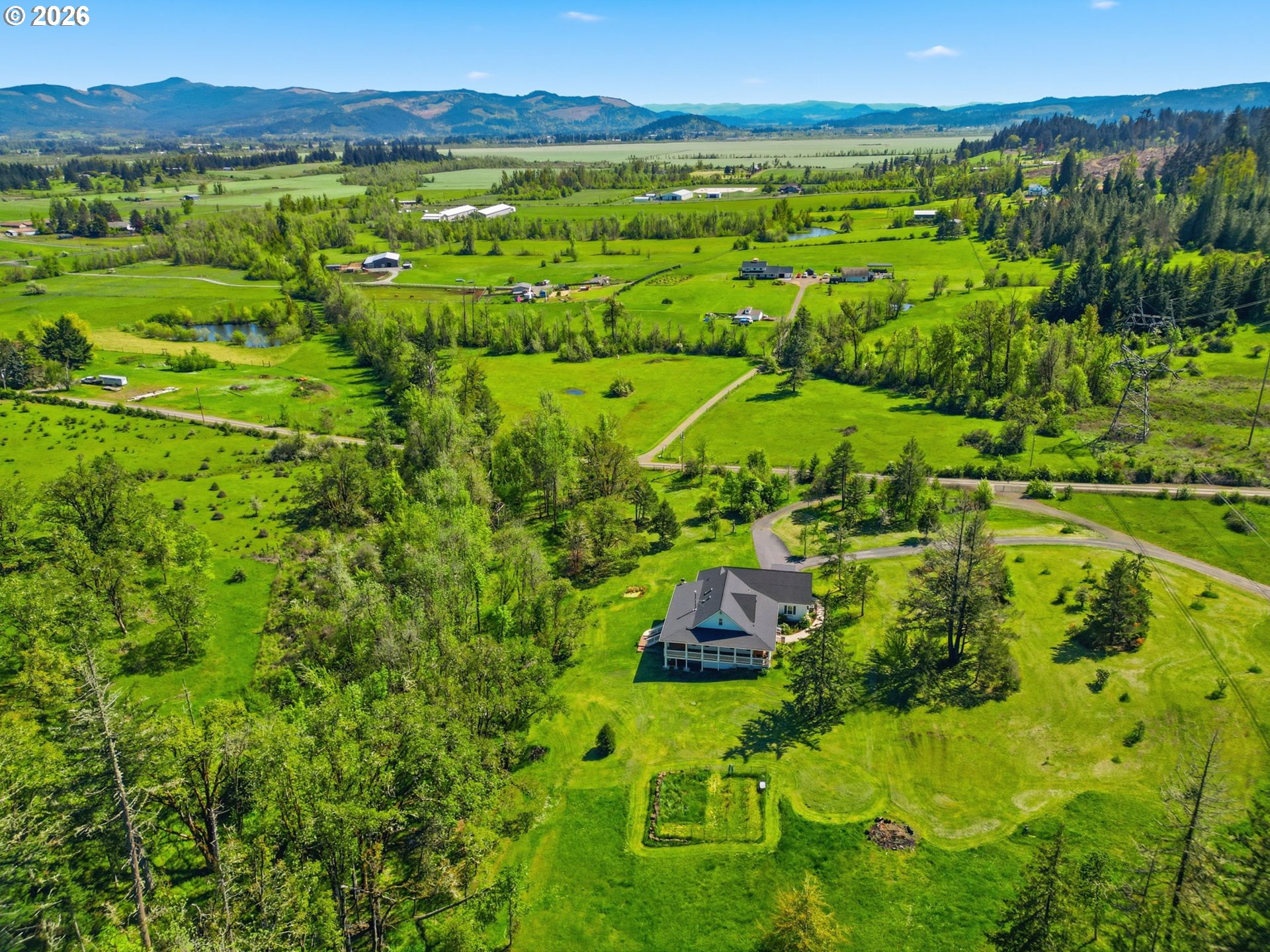 (503) 893-8874Stunning Modern Farmhouse features a classic wrap-around porch and light-filled interior. Mostly main-level living showcases exquisite acacia wood flooring, complemented by detailed molding on abundant windows and doors. The thoughtfully designed floor plan offers excellent separation between the guest rooms and the primary suite. The gourmet kitchen features a leathered granite peninsula, extra deep farm sink, timeless subway tile backsplash, and a convenient pantry with pull-out shelves. Adjacent to the kitchen, the bright breakfast room catches the morning sun and includes soft-close cabinetry, an extended granite counter, hill views, and French doors for easy outdoor access. The generous family room adds drama with a vaulted ceiling, skylights, tall windows, French doors, and woodstove. The Primary suite boasts a separate bathtub and shower, dual sinks, walk-in closet with built-ins, and French doors leading to its own deck with views of the nearby creek and hills. Each of the 2 1/2 bathrooms and the laundry room have porcelain tile flooring and granite counters. Up the wide staircase, enjoy the very private den/office which could easily function as a large 4th bedroom, if a closet was added. The 466 square foot unfinished stand-up attic offers wonderful storage and/or expansion possibilities. Architectural amenities include an Arched Window, Front Shutters, Attached Flower Boxes, Mature Landscaping, Fruit Trees, and a Fenced Garden. Walk-in storage space, approximately 40'x 11' under the home, has electricity, plywood "floor", small shop space, and insulation. There is even more storage space under the side and back of the wrap-around decks. Additional abutting 5.44-acre parcel, Ridgetop Lot 15, RMLS #24641325, is available, for a total of more than 11 acres. Don't miss this opportunity to experience life in a truly beautiful home in one of South Eugene's premier neighborhoods! Contact your broker today to view.