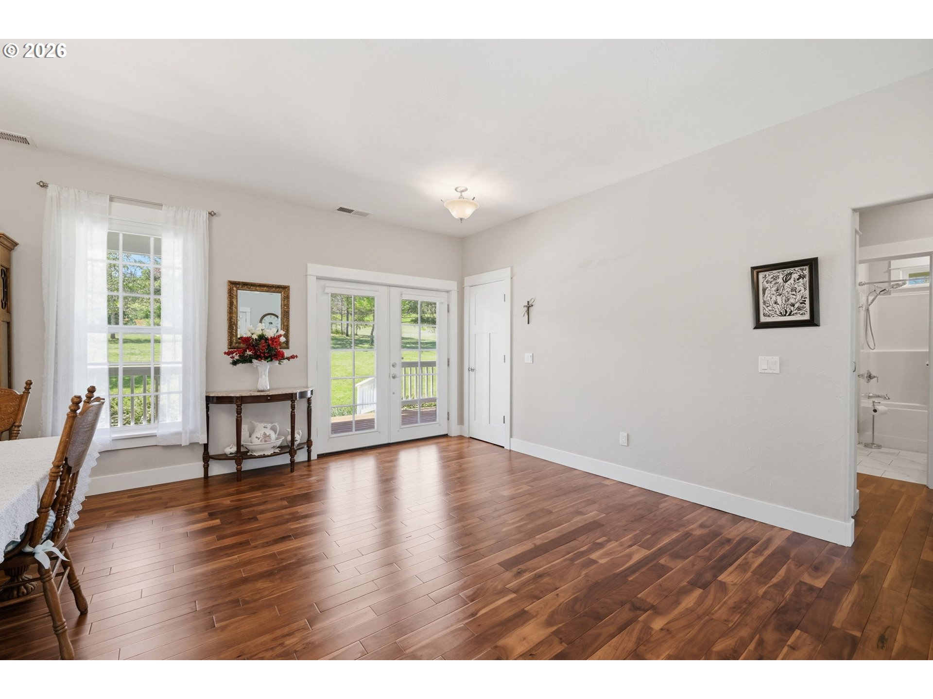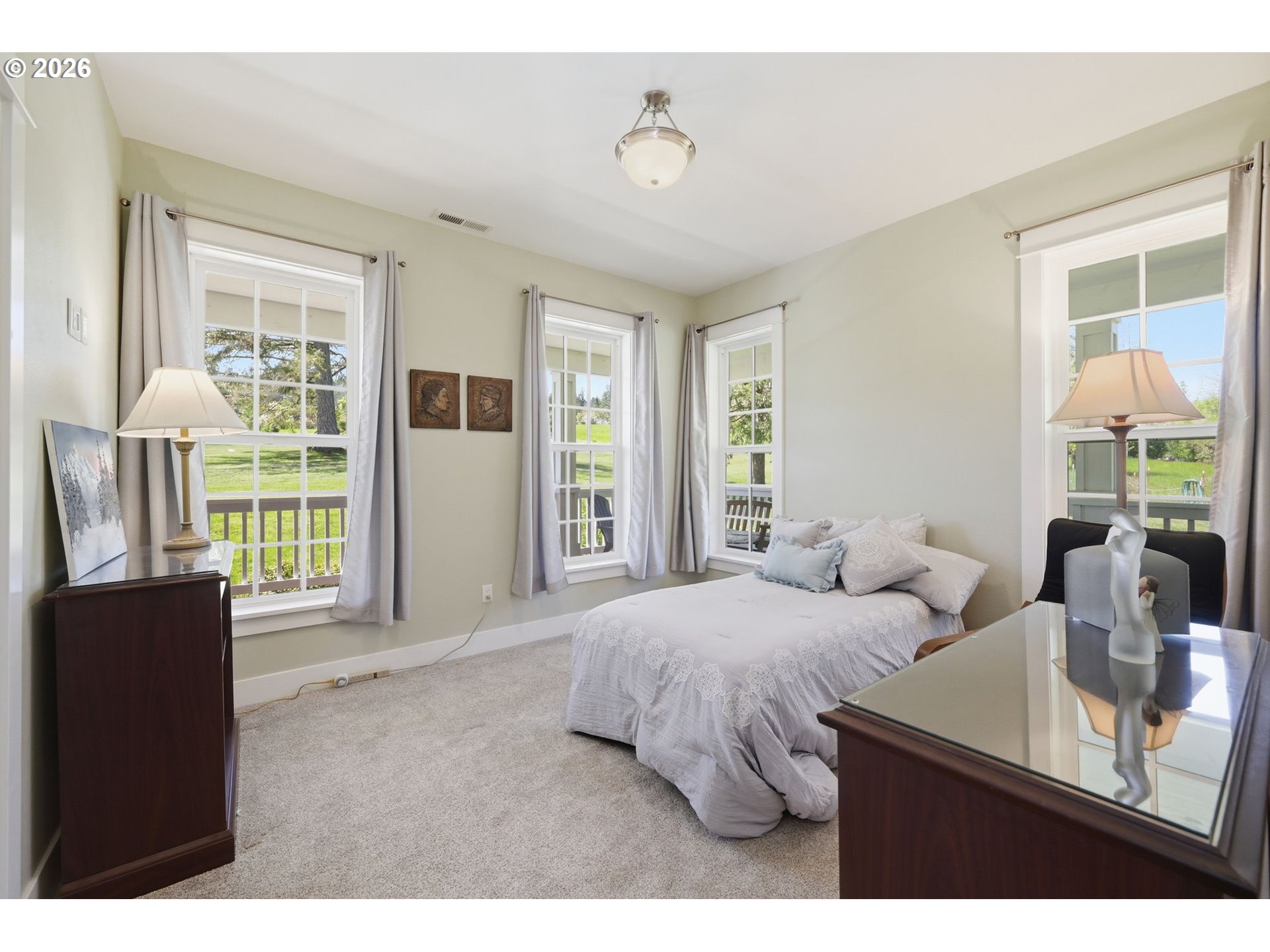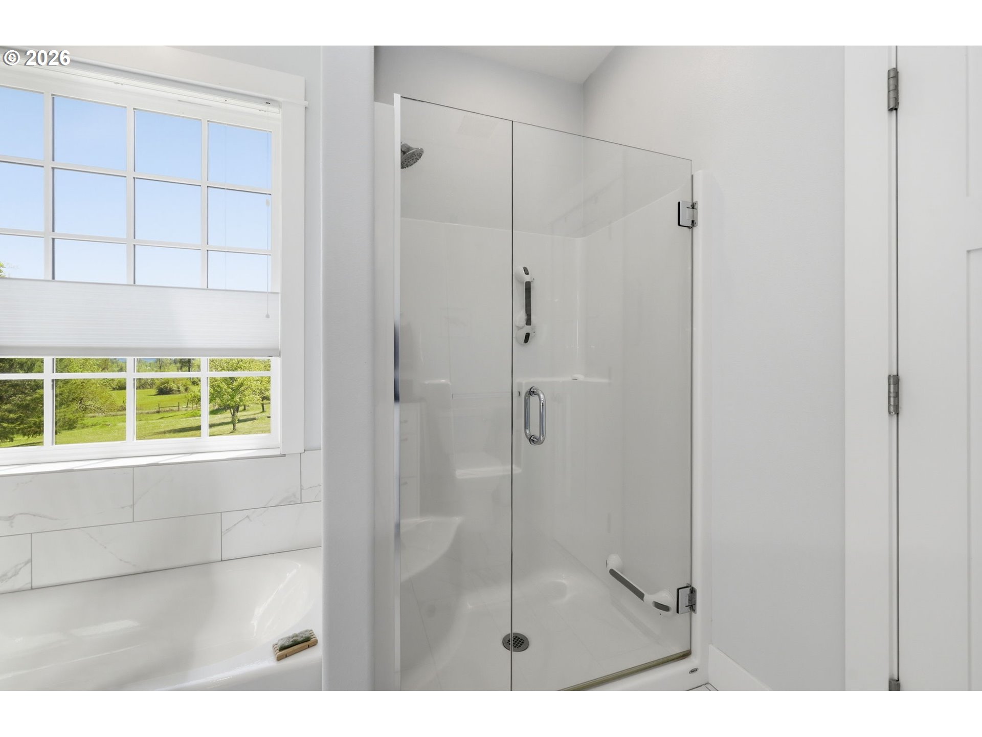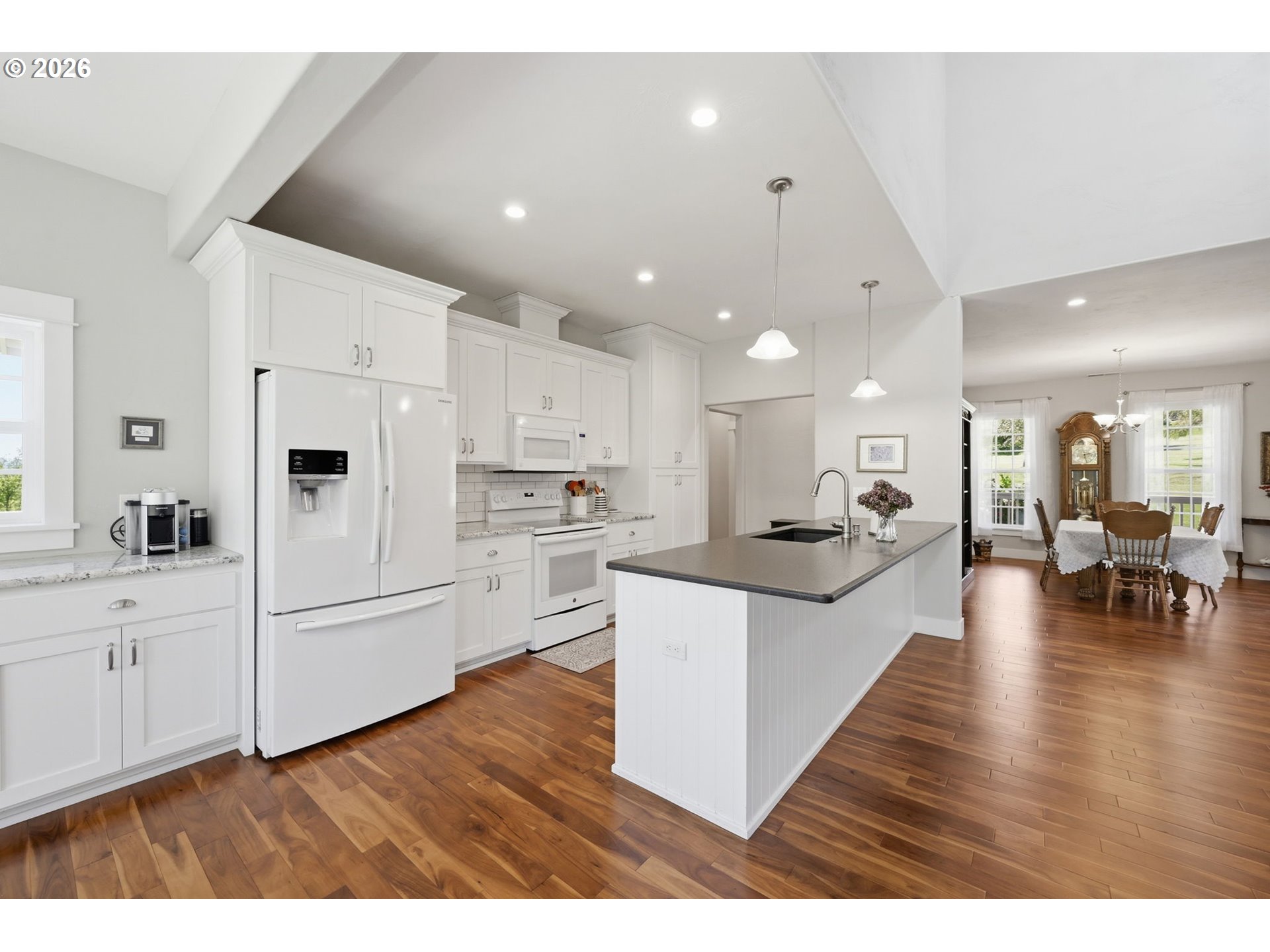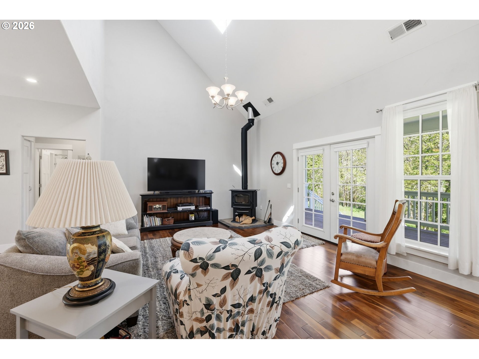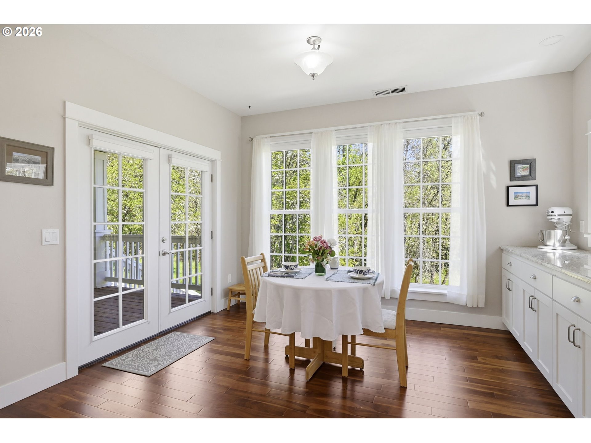 (503) 893-8874Stunning Modern Farmhouse features a classic wrap-around porch and light-filled interior. Mostly main-level living showcases exquisite acacia wood flooring, complemented by detailed molding on abundant windows and doors. The thoughtfully designed floor plan offers excellent separation between the guest rooms and the primary suite. The gourmet kitchen features a leathered granite peninsula, extra deep farm sink, timeless subway tile backsplash, and a convenient pantry with pull-out shelves. Adjacent to the kitchen, the bright breakfast room catches the morning sun and includes soft-close cabinetry, an extended granite counter, hill views, and French doors for easy outdoor access. The generous family room adds drama with a vaulted ceiling, skylights, tall windows, French doors, and woodstove. The Primary suite boasts a separate bathtub and shower, dual sinks, walk-in closet with built-ins, and French doors leading to its own deck with views of the nearby creek and hills. Each of the 2 1/2 bathrooms and the laundry room have porcelain tile flooring and granite counters. Up the wide staircase, enjoy the very private den/office which could easily function as a large 4th bedroom, if a closet was added. The 466 square foot unfinished stand-up attic offers wonderful storage and/or expansion possibilities. Architectural amenities include an Arched Window, Front Shutters, Attached Flower Boxes, Mature Landscaping, Fruit Trees, and a Fenced Garden. Walk-in storage space, approximately 40'x 11' under the home, has electricity, plywood "floor", small shop space, and insulation. There is even more storage space under the side and back of the wrap-around decks. Additional abutting 5.44-acre parcel, Ridgetop Lot 15, RMLS #24641325, is available, for a total of more than 11 acres. Don't miss this opportunity to experience life in a truly beautiful home in one of South Eugene's premier neighborhoods! Contact your broker today to view.