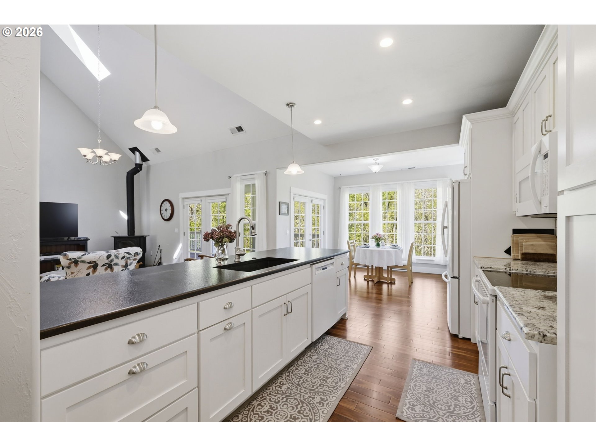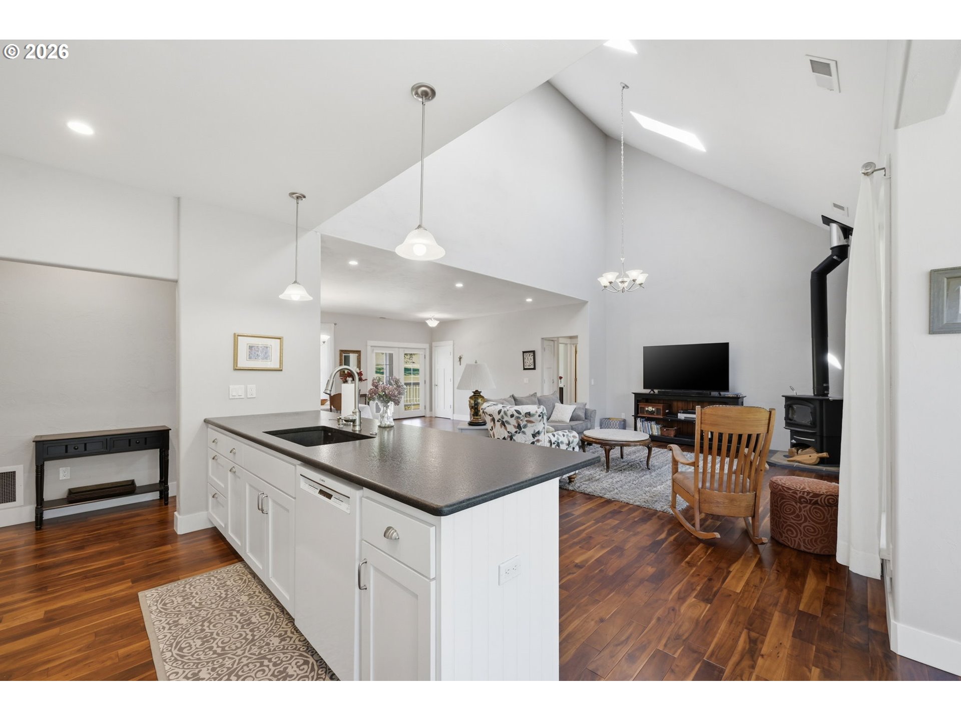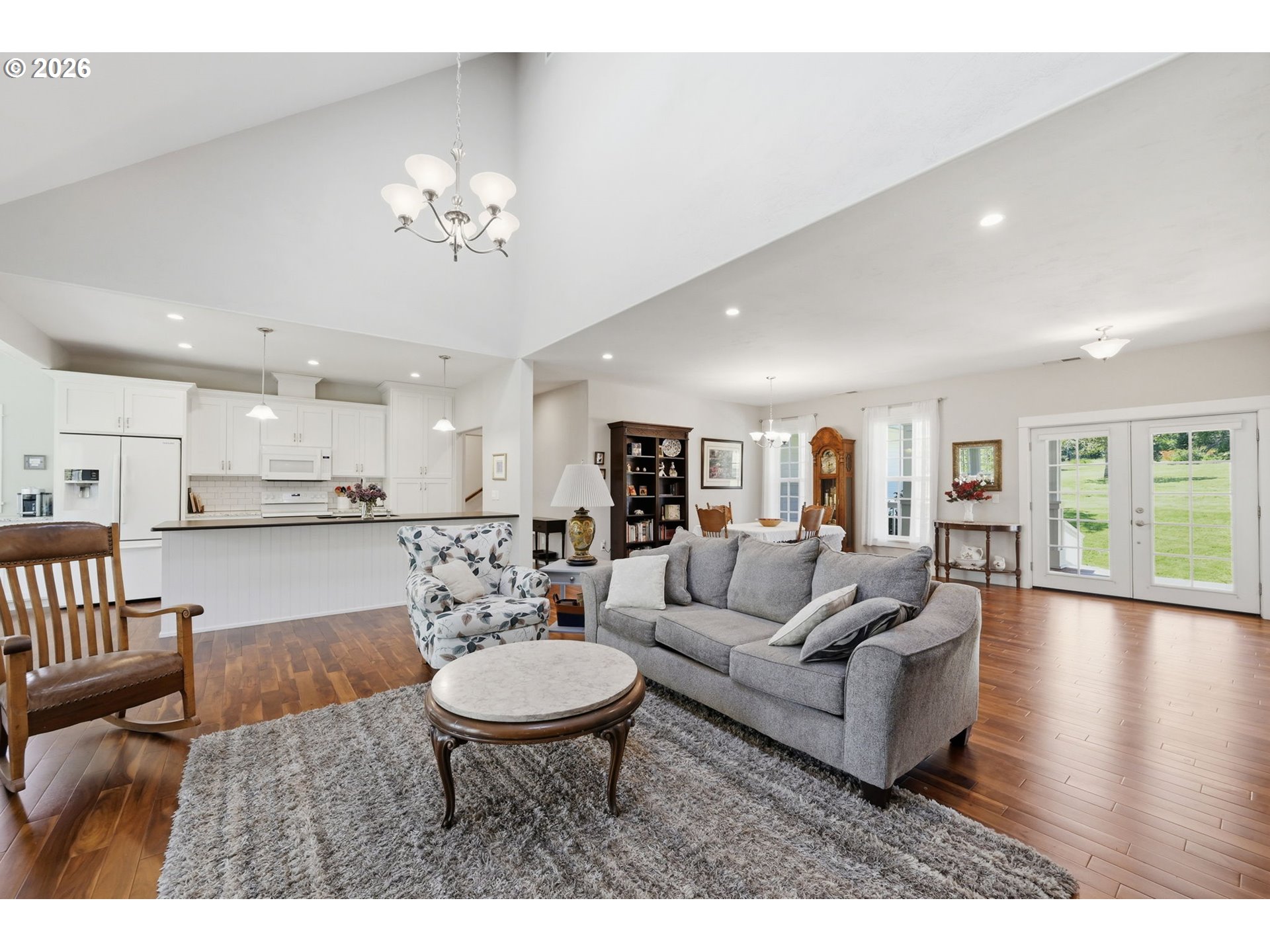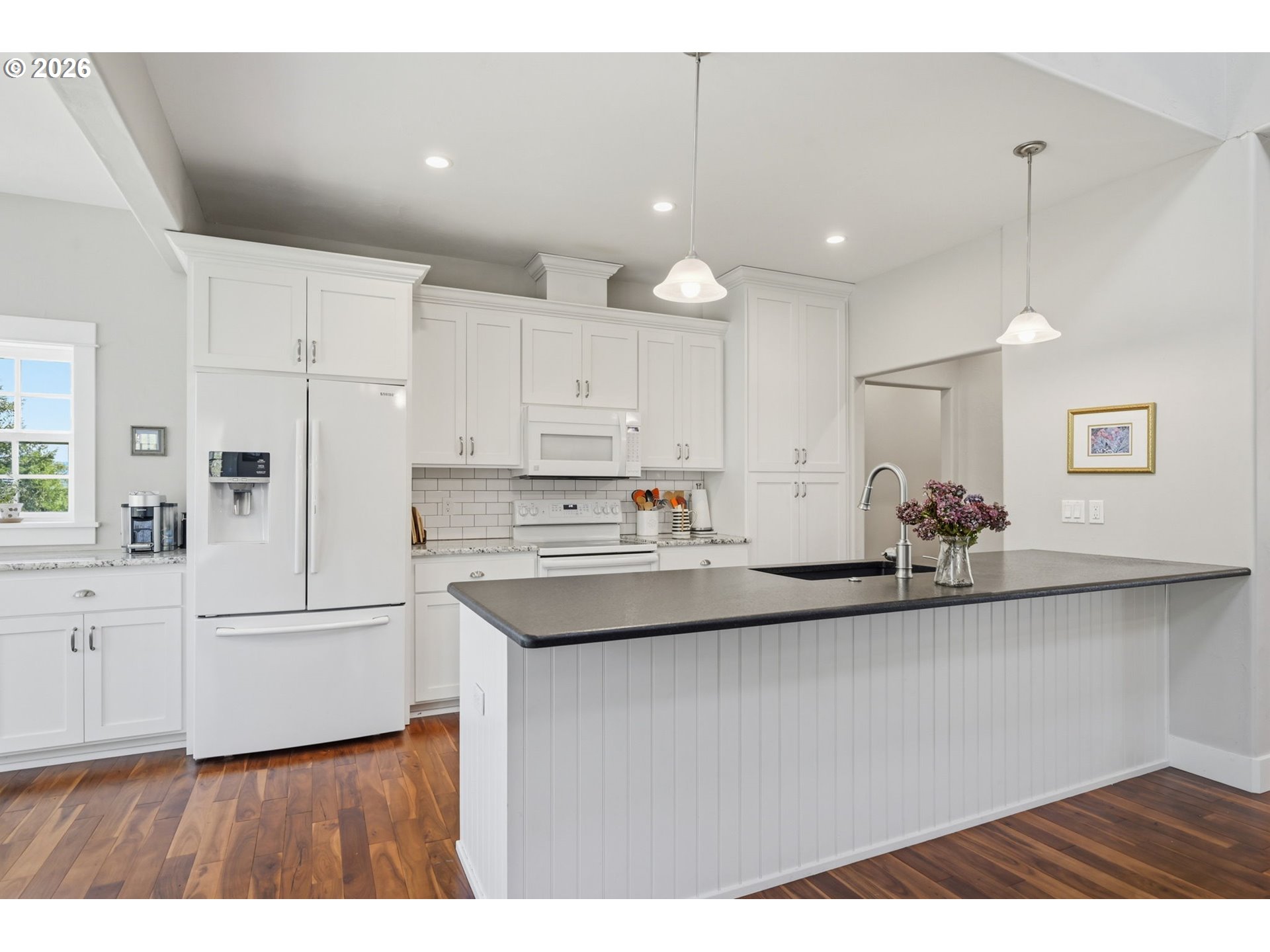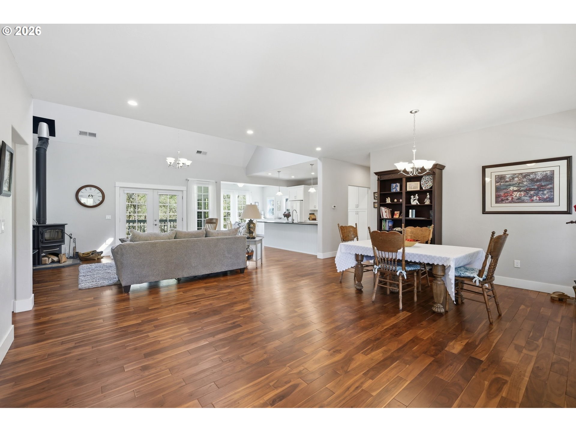 (503) 893-8874Stunning Modern Farmhouse features a classic wrap-around porch and light-filled interior. Mostly main-level living showcases exquisite acacia wood flooring, complemented by detailed molding on abundant windows and doors. The thoughtfully designed floor plan offers excellent separation between the guest rooms and the primary suite. The gourmet kitchen features a leathered granite peninsula, extra deep farm sink, timeless subway tile backsplash, and a convenient pantry with pull-out shelves. Adjacent to the kitchen, the bright breakfast room catches the morning sun and includes soft-close cabinetry, an extended granite counter, hill views, and French doors for easy outdoor access. The generous family room adds drama with a vaulted ceiling, skylights, tall windows, French doors, and woodstove. The Primary suite boasts a separate bathtub and shower, dual sinks, walk-in closet with built-ins, and French doors leading to its own deck with views of the nearby creek and hills. Each of the 2 1/2 bathrooms and the laundry room have porcelain tile flooring and granite counters. Up the wide staircase, enjoy the very private den/office which could easily function as a large 4th bedroom, if a closet was added. The 466 square foot unfinished stand-up attic offers wonderful storage and/or expansion possibilities. Architectural amenities include an Arched Window, Front Shutters, Attached Flower Boxes, Mature Landscaping, Fruit Trees, and a Fenced Garden. Walk-in storage space, approximately 40'x 11' under the home, has electricity, plywood "floor", small shop space, and insulation. There is even more storage space under the side and back of the wrap-around decks. Additional abutting 5.44-acre parcel, Ridgetop Lot 15, RMLS #24641325, is available, for a total of more than 11 acres. Don't miss this opportunity to experience life in a truly beautiful home in one of South Eugene's premier neighborhoods! Contact your broker today to view.