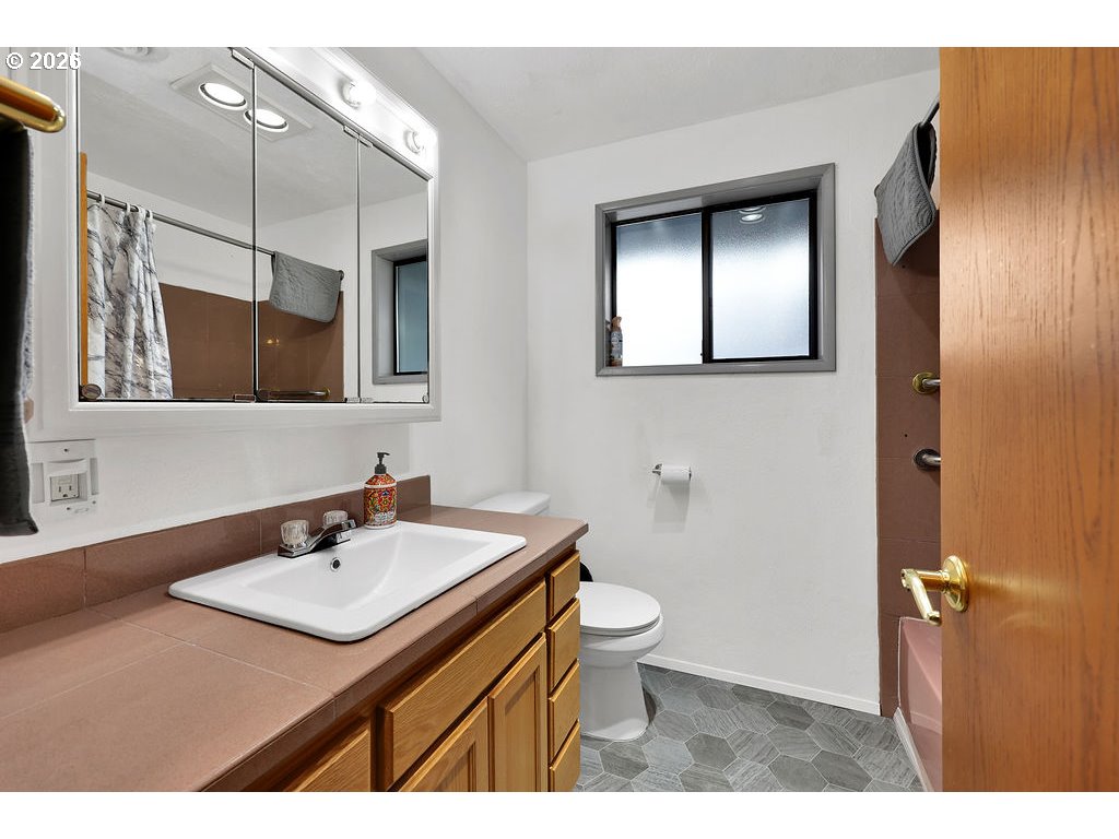 Nestled in the tranquil Southwest Eugene hills on a dead end road, this multi-level home offers a rare combination of rural serenity and urban convenience, situated just ten minutes from the shops and markets in Southeast Eugene and ten minutes from the major amenities of West Eugene. Set on a sprawling 9.86 acre lot surrounded by trees and mature landscaping, the home is accessed via a private gated driveway that leads up to the home and a nostalgic red barn, which has been used for equipment storage, but that has potential as a small shop. Inside, the heart of the home features a galley-style kitchen with warm oak cabinetry, granite countertops, and stainless steel appliances, complemented by a vintage breakfast nook and an abundance of storage. The expansive living room is anchored by a traditional brick fireplace with built-in shelving, while massive windows throughout the home frame picturesque treehouse views. The versatile floor plan includes 3 bedrooms and 2 bathrooms on the main level, 2 bedrooms upstairs, and a massive lower-level recreation room capable of suiting a variety of uses. Outdoor living is elevated by a tiered concrete fire pit area perfect for summer gatherings, and frequent visits from local wildlife. With an oversized attached garage for your workshop or equipment and ample room for RV or boat parking, this Southwest Eugene sanctuary provides the ultimate Pacific Northwest lifestyle without sacrificing proximity to the city. With some work on the fencing this property holds great potential to keep horses, cows, and other livestock. New roof and exterior paint 2026. New carpet in downstairs family room 11/2025. This is the first time this home has been on the market in 60 years so don't miss this opportunity to own this beautiful home and make it your own.