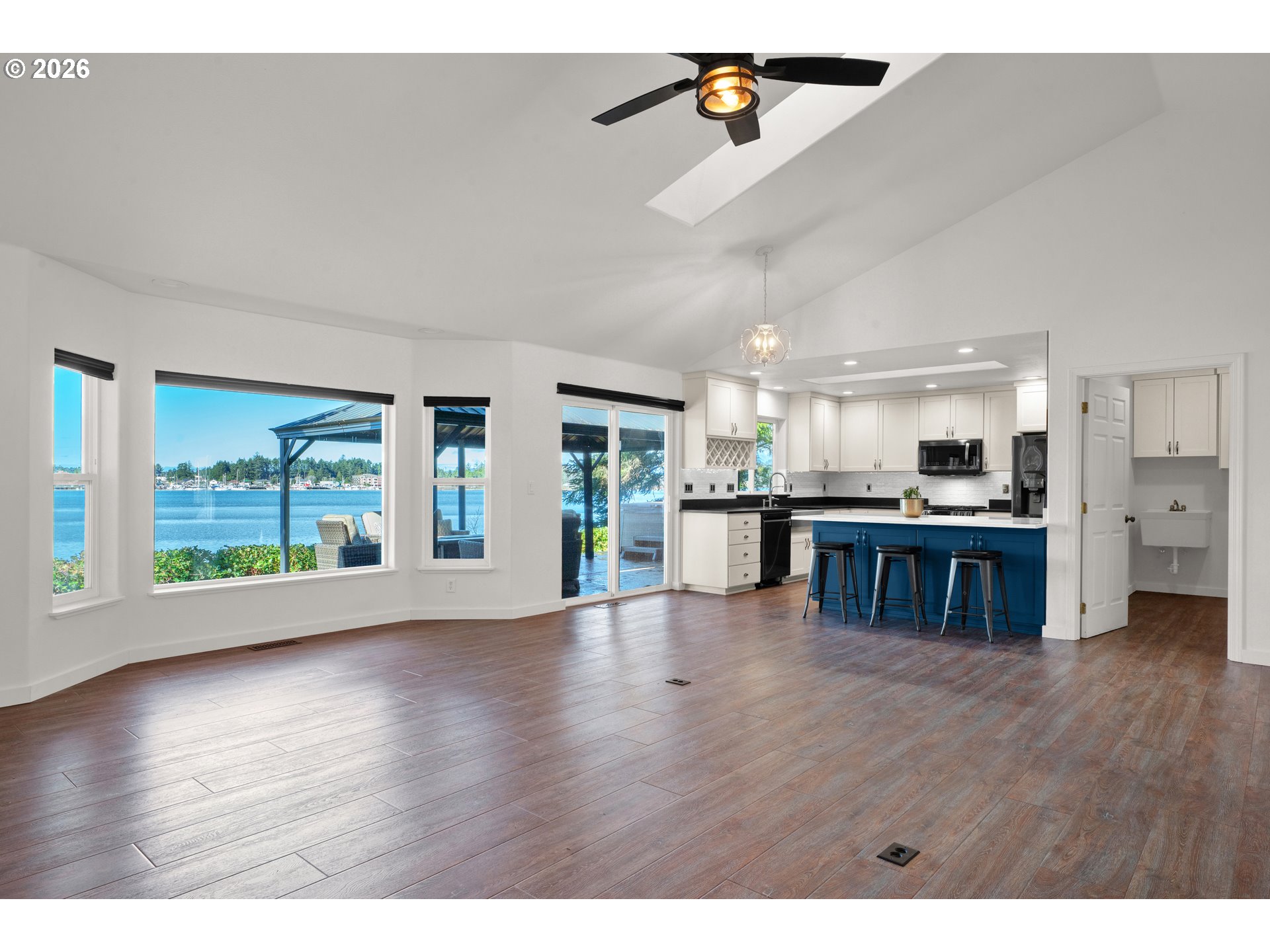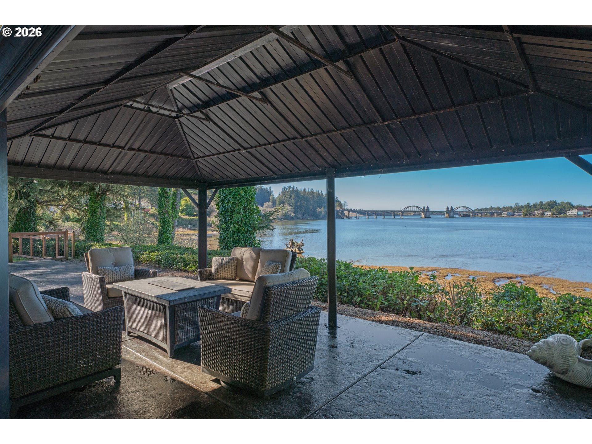 Panoramic River Views and Private 1.56-Acre Coastal Sanctuary. Experience the pinnacle of Pacific Northwest riverfront living. This impeccably maintained 1,967 sq ft home, built in 2001, offers a front-row seat to the best of Florence, with breathtaking panoramic views of the Siuslaw River, the iconic Florence Bridge, and charming Old Town. Life here centers around the view. The open floor plan seamlessly connects to a massive new stamped concrete patio with the ultimate stage for sunset entertaining. Relax in the saltwater hot tub, perfectly positioned to maximize the incredible river views while watching the lights of Old Town flicker across the water. The generous, usable 1.56-acre lot is shielded by mature landscaping, creating a private, park-like setting with ample space for all the toys to enjoy the river and dunes. This home provides modern comfort and a functional layout with 3 bedrooms plus a dedicated office (or dining area), and 3 total bathrooms (one full, two 3/4). Some of the many recent upgrades include a brand-new kitchen and interior paint, a newer roof (2022), new flooring (2025), and a freshly paved asphalt driveway. Additional practical features include a large, dry storage building with 220 outlets, a separate garden shed, and a newly dug well with a 3,000-gallon holding tank. The property masterfully combines a serene, private setting with unbeatable proximity to downtown Florence, the Oregon Dunes, and local beaches, it's the ultimate coastal lifestyle property waiting for you.
