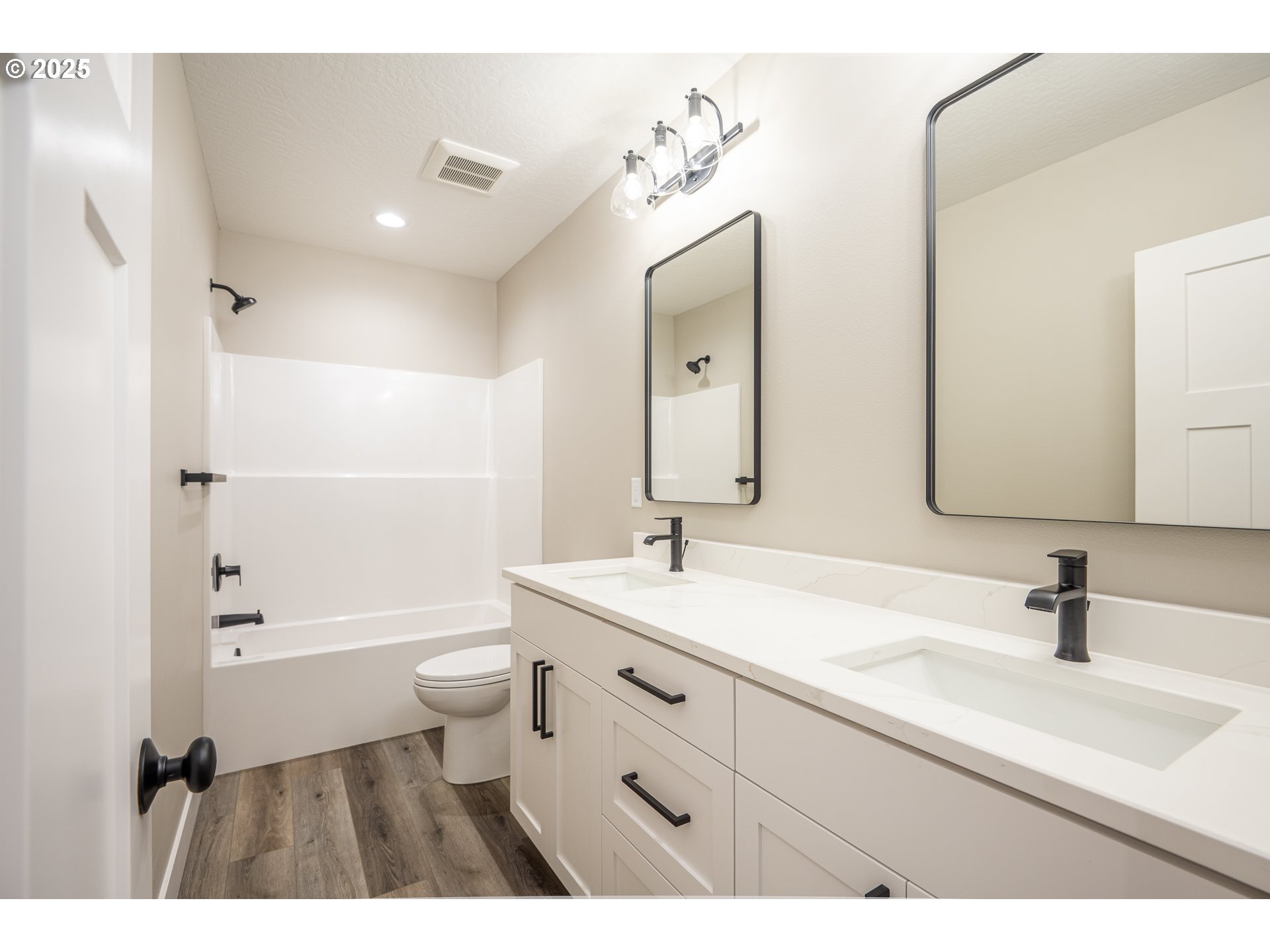 This sought-after floor plan offers 4 bedrooms, 2.5 bathrooms, and 2,074 sq ft of well-designed living space. The main-level primary suite provides privacy and convenience, with three additional bedrooms and a full bath upstairs.The open-concept kitchen features white quartz countertops, stained alder cabinetry, a spacious pantry, stainless steel appliances, gas cooking, a built-in microwave, and a refrigerator. Natural light fills the home thanks to ample windows and recessed lighting.The vaulted living room includes a stacked stone gas fireplace and an oversized sliding door leading to a fenced, landscaped backyard with a patio—perfect for outdoor entertaining. The primary suite boasts a custom-tiled shower, double quartz vanity, and a large walk-in closet.The main-level laundry room includes upper cabinets for storage. Upstairs, three generously sized bedrooms share a full bathroom with a double vanity and tub.Additional highlights include an attached 2-car garage, and a propane tank that powers the fireplace, gas range, and tankless water heater. Come explore JW Construction’s quality craftsmanship at Madrone Ridge!