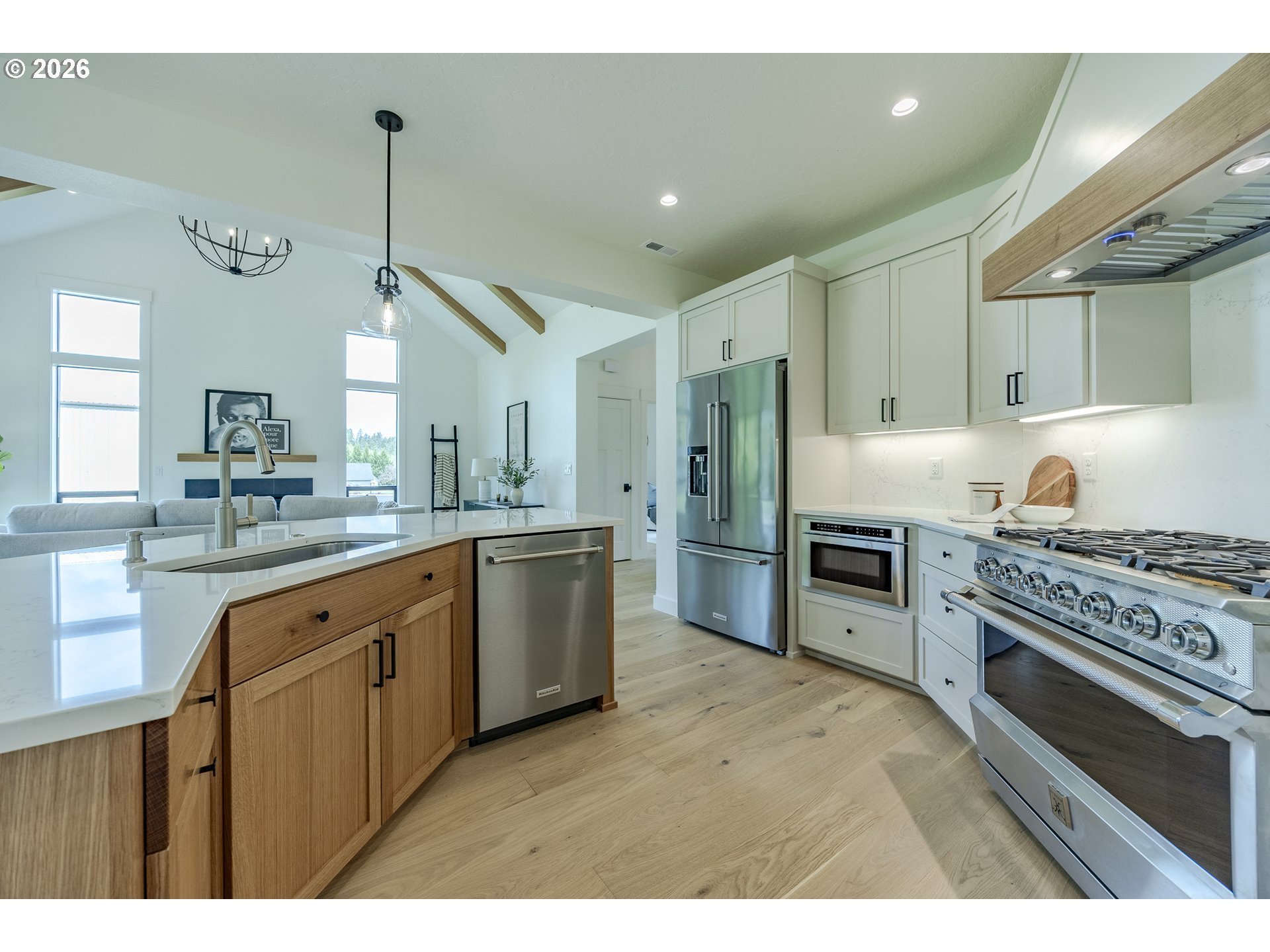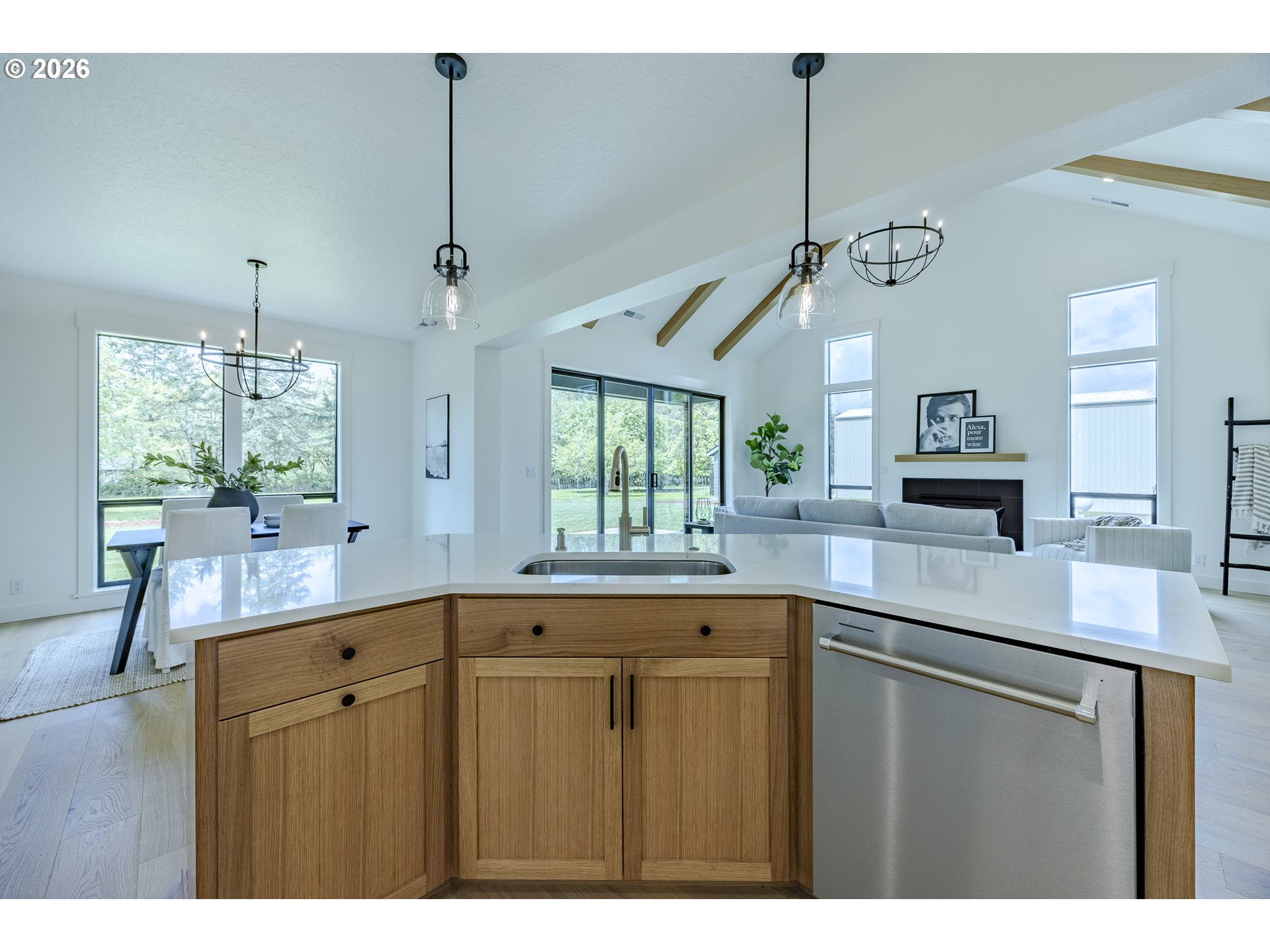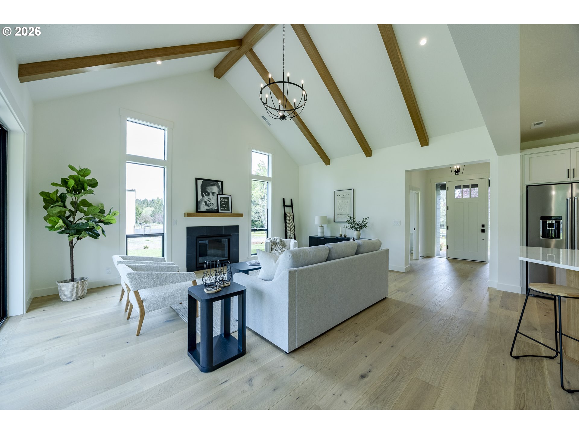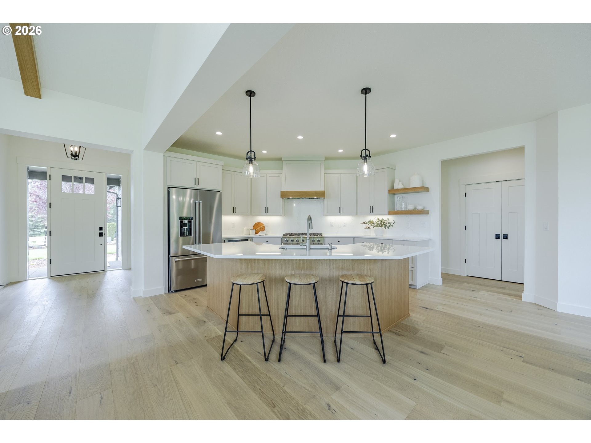 (503) 893-8874Tucked at the end of a quiet dead-end street in Veneta, this 2026 new construction by builder Bruce Weichert delivers the kind of quality you can feel the moment you walk through the door. Step inside to a striking entry. Just off the foyer, a thoughtfully placed office offers true separation—ideal for focused work or a little peace and quiet. Beyond that, the home opens up beautifully into a light-filled living and dining space that truly steals the show. Vaulted, beamed ceilings and floor-to-ceiling windows create a sense of volume and warmth, while the glass slider invites effortless indoor-outdoor living for summer evenings and weekend gatherings. The kitchen is designed to impress and perform. An oversized quartz island anchors the space, perfect for dining or entertaining, complemented by top-of-the-line KitchenAid appliances and a chef-worthy Hestan gas range. A dedicated dining area offers the perfect setting for more formal occasions. Privately positioned in its own wing at the back of the house, the primary suite is a true retreat with vaulted ceilings, a generous walk-in closet, a spa-like ensuite complete with soaking tub and walk in shower. Two additional main-level bedrooms, a full bathroom, a well-appointed laundry room with sink, storage, exterior access—and yes, a coveted Speed Queen set included—round out the main floor.Upstairs, a flexible bonus room, full bath, and additional bedroom create space for guests and hobbies.Every detail has been considered: tankless on-demand hot water, generator readiness, an extra-deep garage with storage, and a well pump house equipped with heat and power. Even future plans are accounted for, with septic and water lines already extended for a potential shop. This dreamy new build sits on a flat, usable 2-acre parcel—offering space, privacy, and possibility. This isn’t just a home; it’s your next chapter.