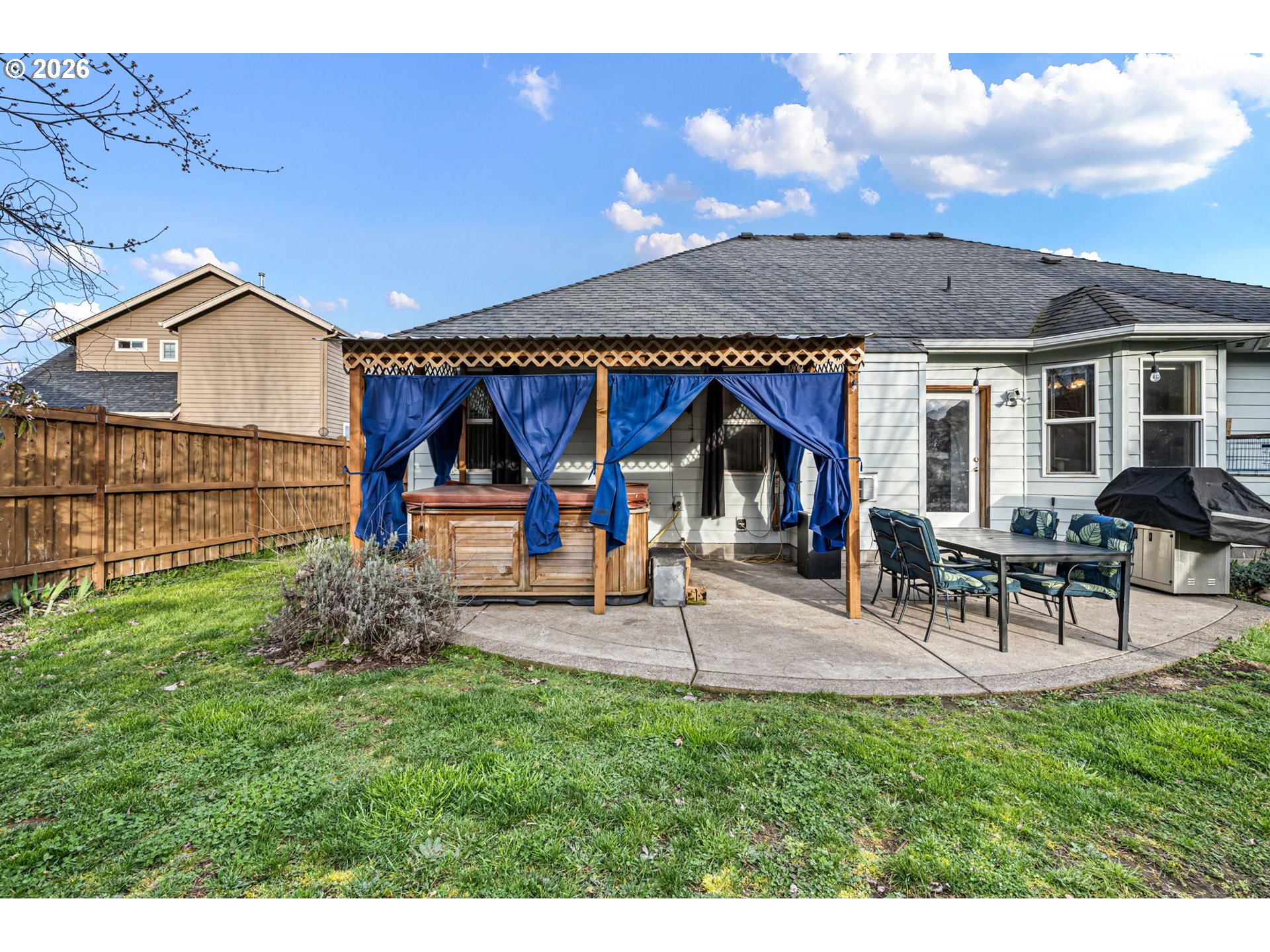 OPEN HOUSE Saturday 3/7, 1–3 PM. Custom home in a desirable neighborhood with a functional, well-designed layout. The main living area connects to the kitchen with nook, eating bar, formal dining room, and office/flex space. Wood floors run throughout the home except wet areas. Trim and doors are also wood. The kitchen offers easy access to the backyard patio. The primary suite is separated from the additional bedrooms and features a full bath with double sinks, walk-in shower, jetted tub, and a spacious walk-in closet. Laundry room includes a sink, granite countertop, and built-in cabinetry. Backyard includes a partially covered patio with a hot tub (included), underground sprinklers, and a tool shed. Updates: water heater 8/2022, heat pump 7/2023.