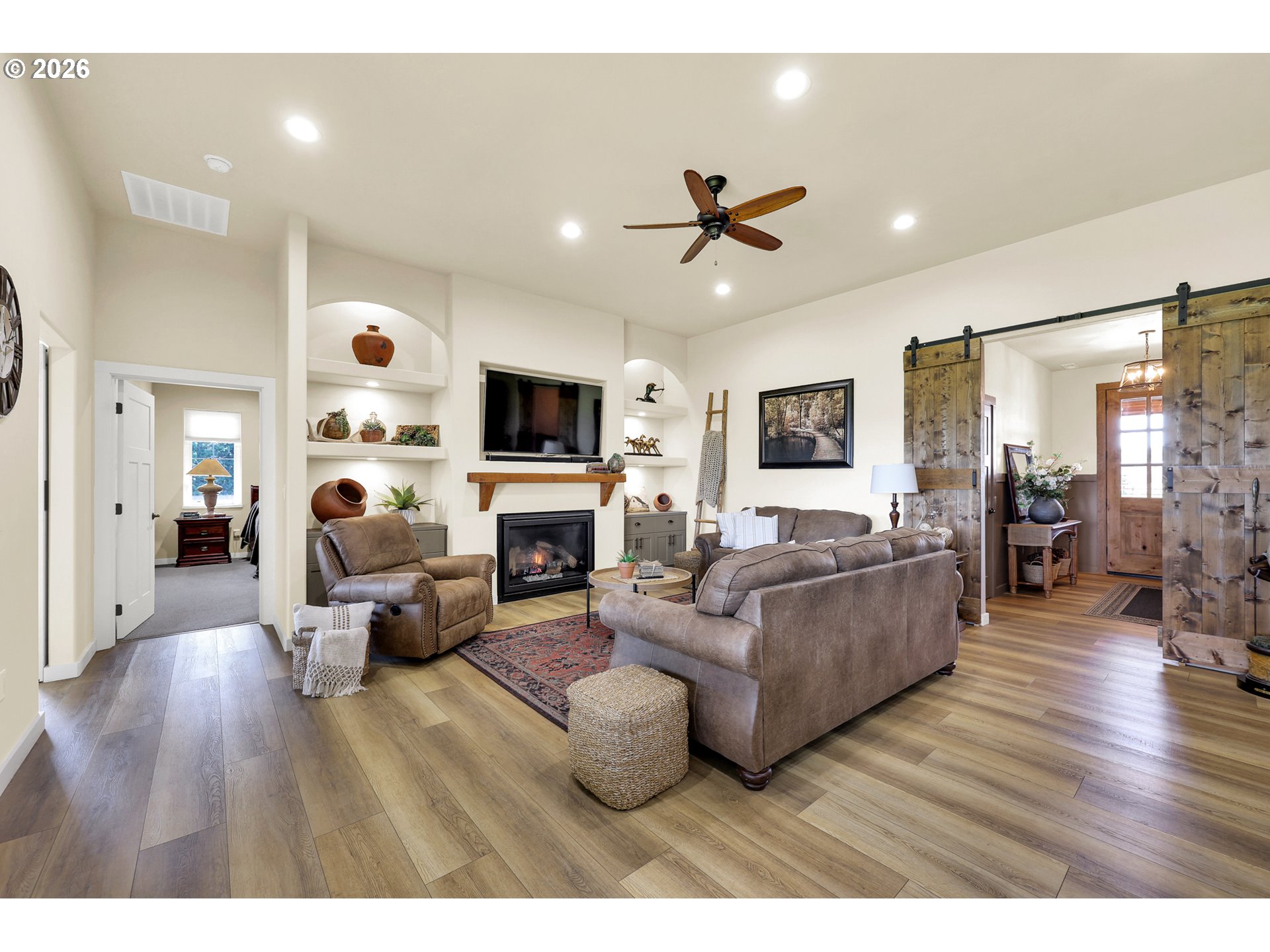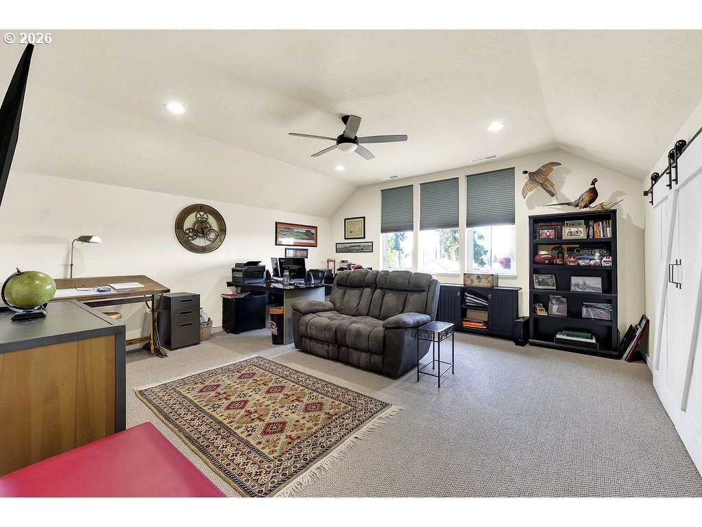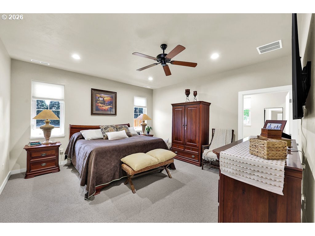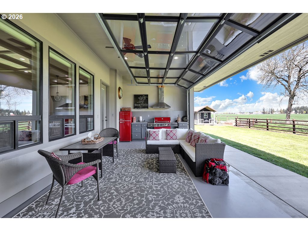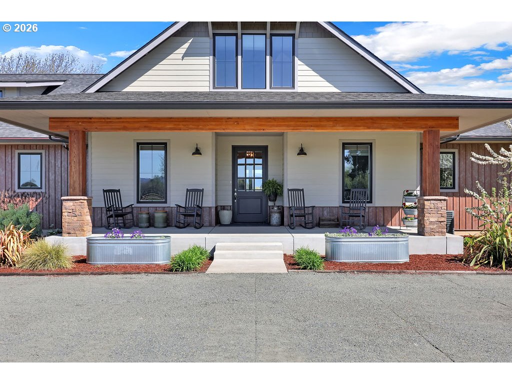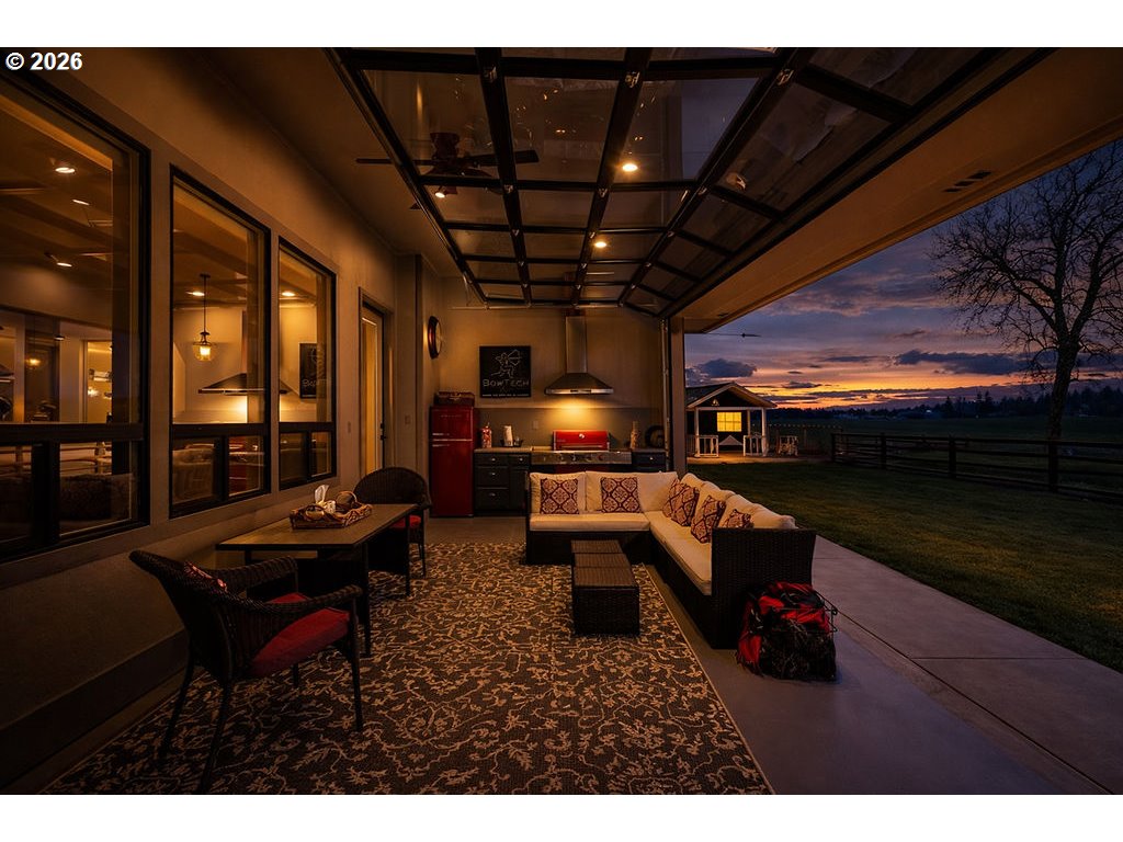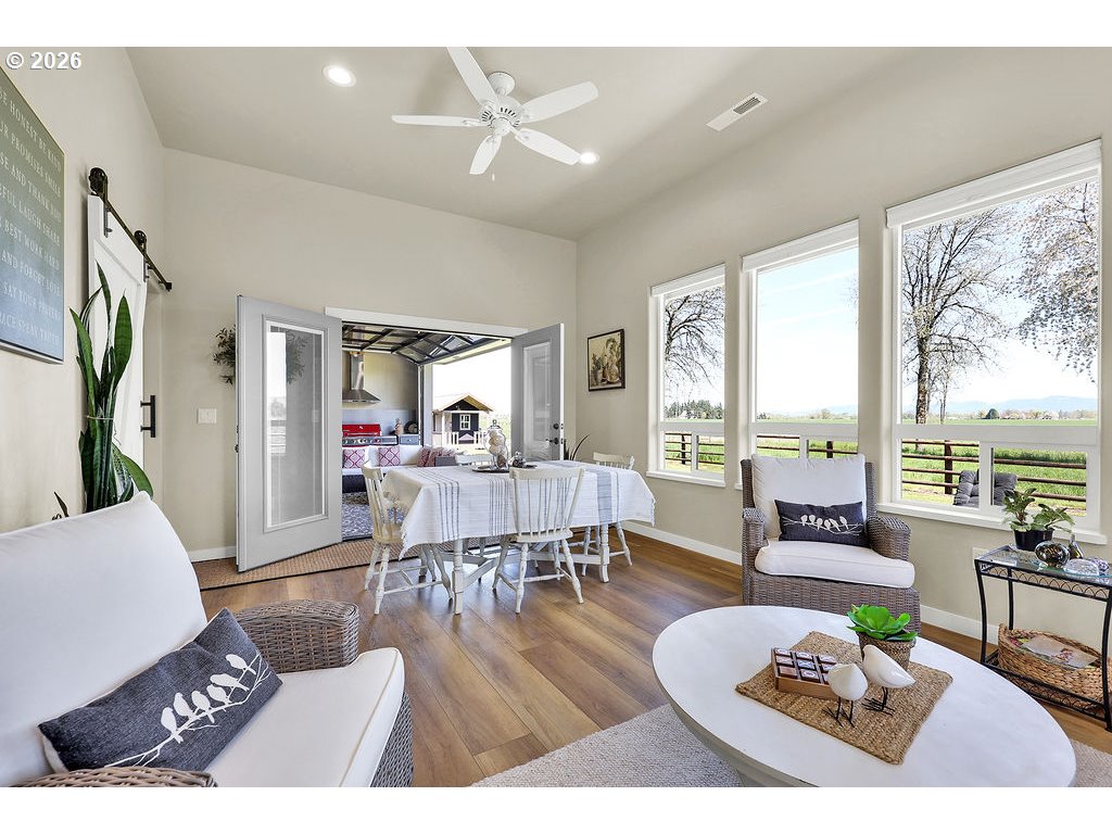 Discover this rare, owner-designed and built custom home, now on the market for the first time. Set on 2.66 private taxable acres (RR5 zoning) with exclusive irrevocable rights to approx. 1.38 additional acres of the neighboring property recorded with a "View & Use Easement" for a total of approx. 4.04 acres. The home enjoys breathtaking Eastern views of the Coburg Hills and award winning sunsets & sunrises that paint the sky. Exceptional privacy and versatile rural living are yours just 1 mile from Junction City. The spacious interior impresses with 11 ft ceilings throughout the main level, while thoughtful efficiency upgrades include a solar attic vent fan, 16 SEER high-efficiency heat pump, hybrid heat pump water heater, gas fireplace rated at 2,600sqft and generous 4-foot overhangs around the entire house. A robust 380-amp elec. service is pre-wired for a whole-house generator, complemented by 30 & 50-amp RV hookups (w/ water), attic wiring for future power needs, a custom private entry gate w/new Ghost gate opener, water/power at the gate, and dedicated Xfinity service. Outdoor amenities abound featuring an over sized 18’ glass roll up door on the sunporch, w/electric fireplace, BBQ, refrigerator, TV, outdoor shower, half bath off the back patio, and a fenced concrete patio off the Master bath rated for a hot tub. 14’x14’ storage shed w/elec., 10’x16’ garden/she shed w/elec. & sink, underground irrigation system, fully fenced pasture, an 80’ deep private well (50+ GPM), 1500-gallon septic, 250 gallon buried propane tank. Additional perks include all appliances staying with the home. This infrastructure-rich property with just over 4 acres of usable land is perfect for hobby farming, RV living, multigenerational households, or anyone seeking a peaceful, self-sufficient rural retreat with modern comforts. An incredible opportunity to own this unique nearly 5 year old home!