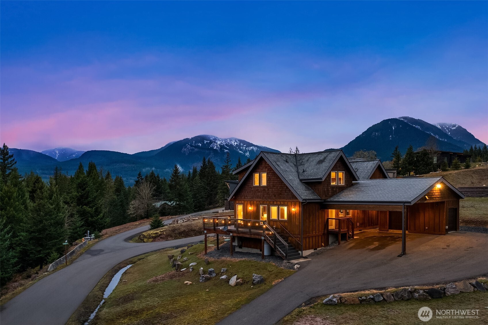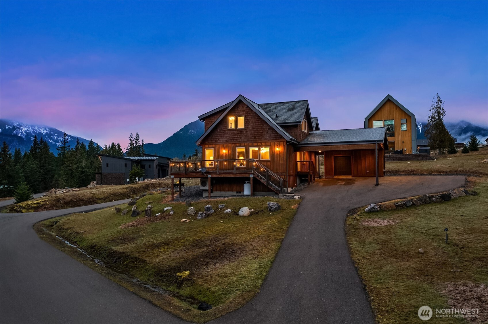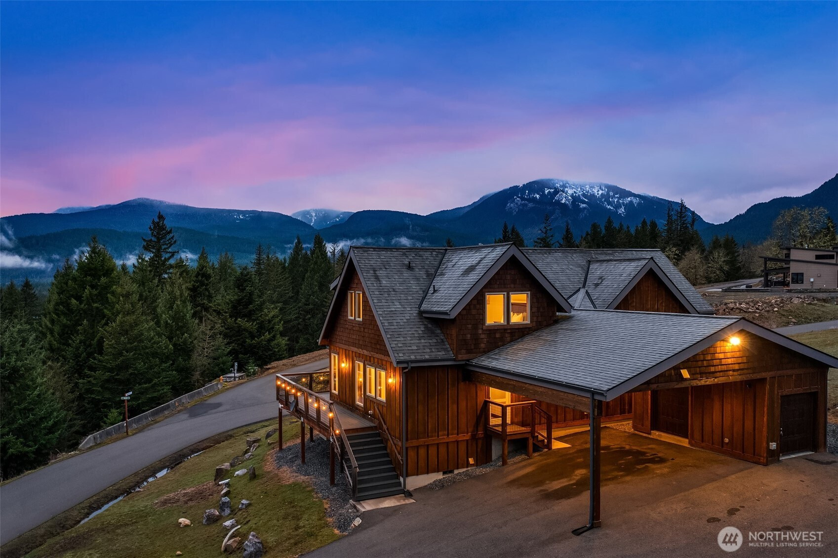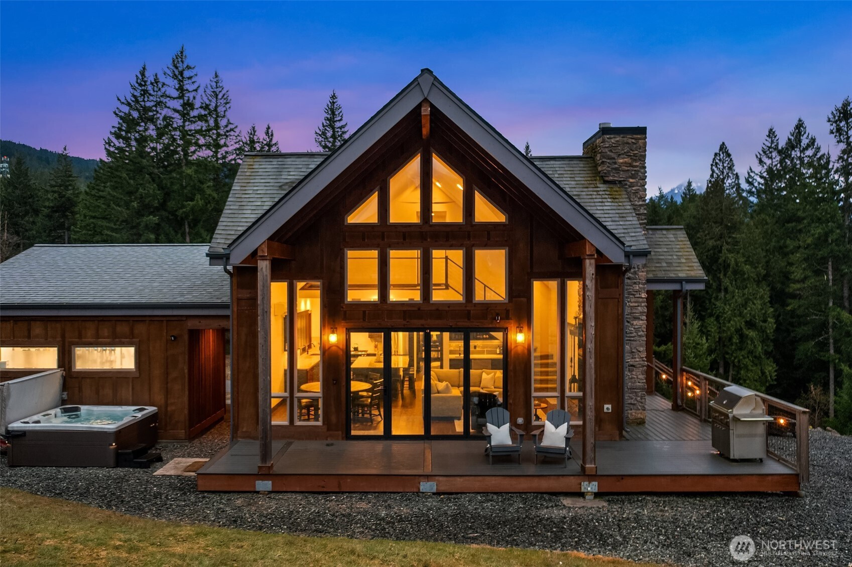 Welcome to Hideaway, Packwood’s premier gated neighborhood with arguably the best Mt. Rainier view in town. Sitting proudly on a shy half-acre is this stunning 2019 chalet. It features a NanaWall of glass facing the spectacular Mt. Rainier view, creating a seamless indoor-outdoor flow on to the composite low-maintenance wrap-around deck. The main level open-concept great room showcases a floor-to-ceiling fireplace that warms the room with the flip of a switch. The kitchen is equipped with a Dacor gas range and matching stainless-steel appliances. A hammered apron-front copper sink serves as a striking focal point, pairing beautifully with the granite countertops. Don’t miss the wet bar with wine fridge and matching hammered copper sink. The primary suite offers another gas fireplace and a 5-piece bath with clawfoot tub. Upstairs, you’ll love the bunk room with west-facing Cowlitz River Valley views. The third bedroom is adjoined by another full bath. The exterior is clad in cedar shake and stained board and batten siding, establishing a timeless aesthetic. The freshly paved asphalt drive welcomes you to the attached two vehicle carport with a beautiful tongue and groove ceiling and a convenient sizeable storage room for your recreational gear. Less than a mile from the shopping, dining, and entertainment of Packwood’s town center and 25 minutes from White Pass and Mt. Rainier National Park, this durable and timeless chalet is offered furnished for your immediate enjoyment.