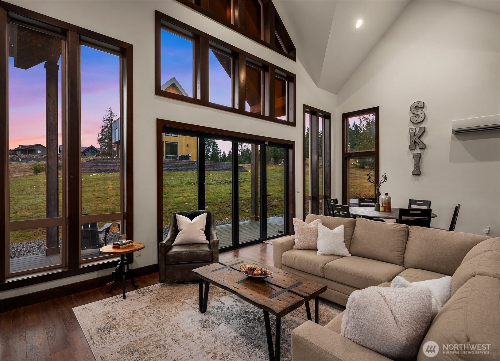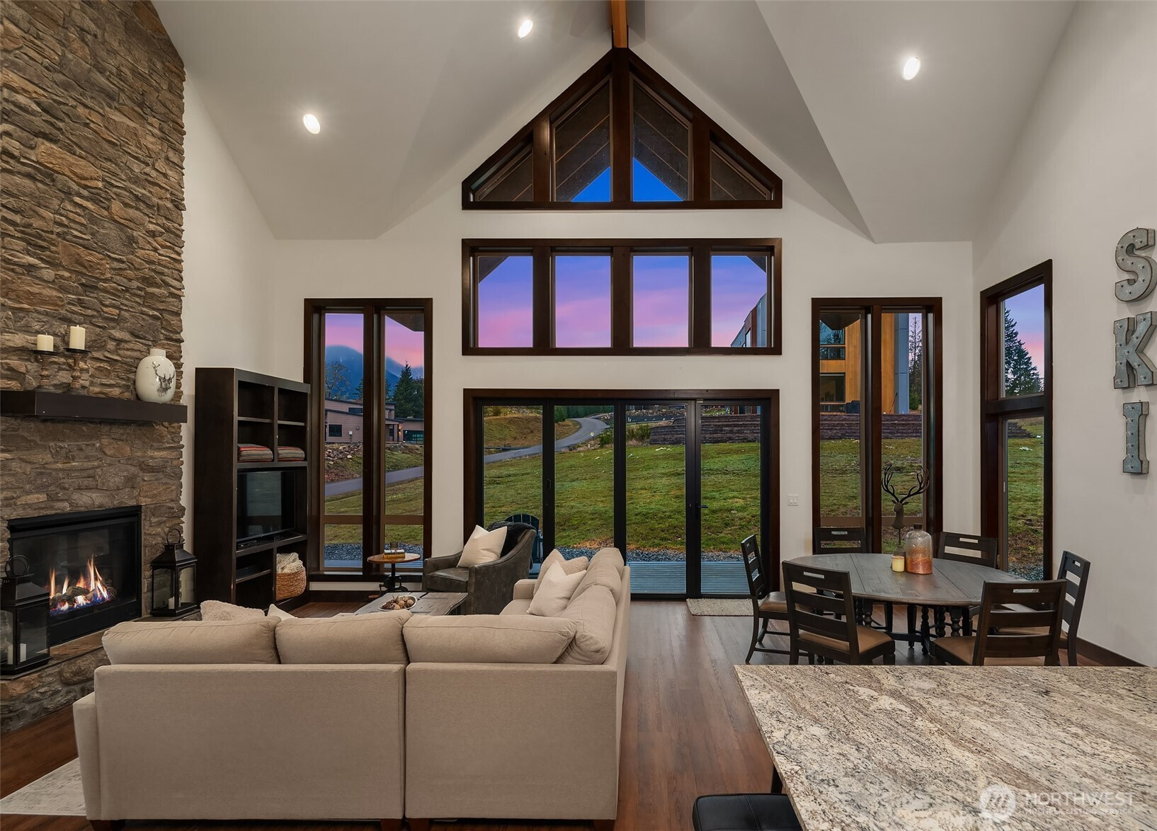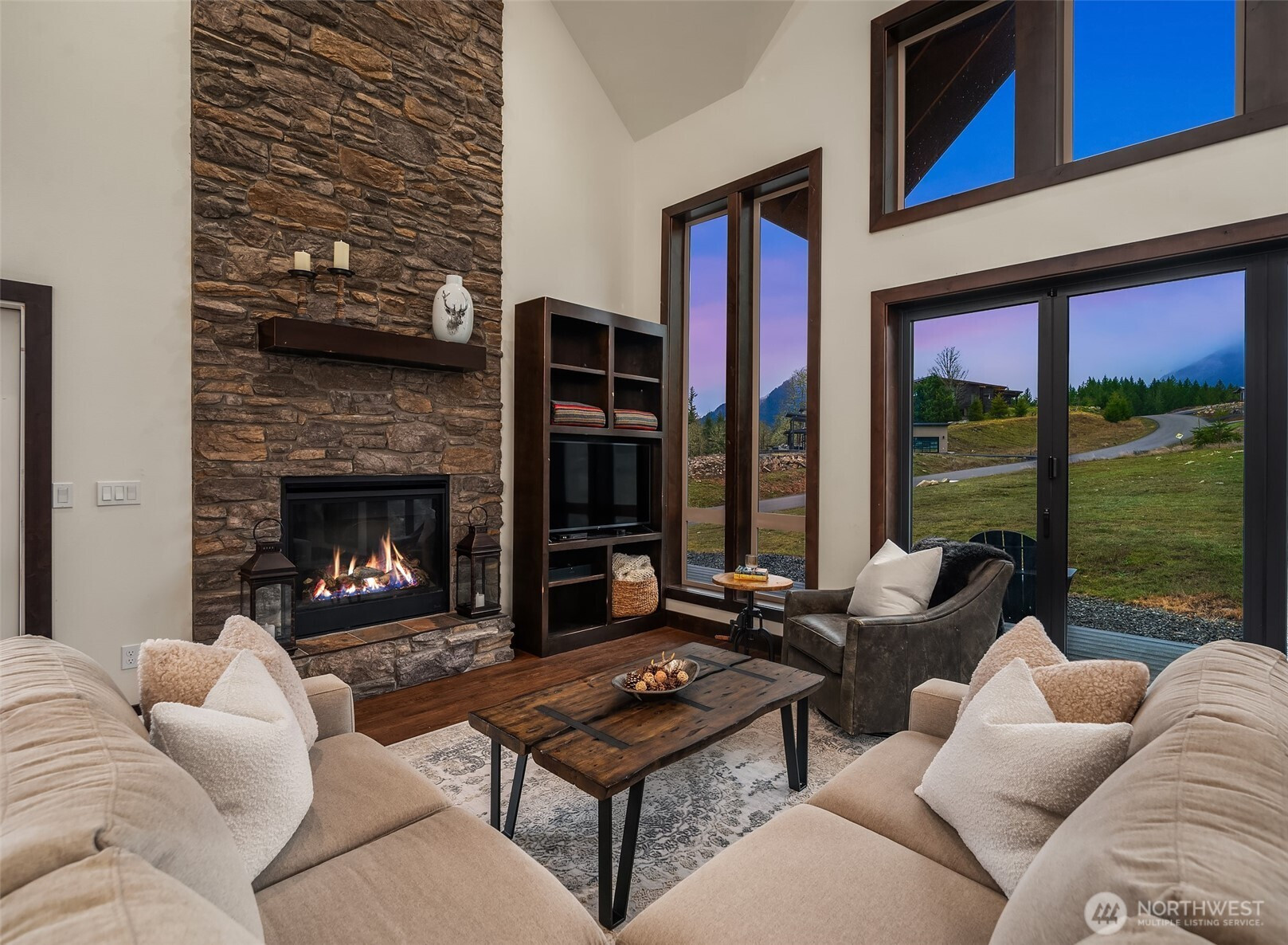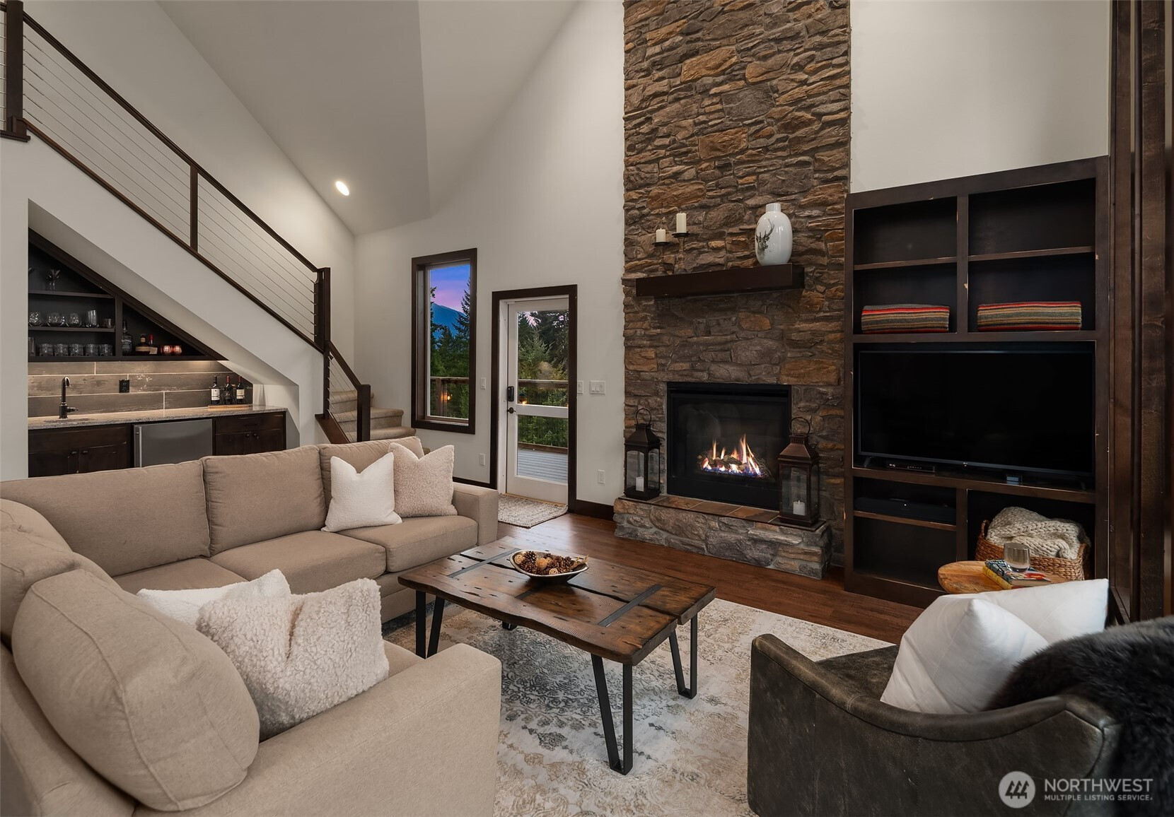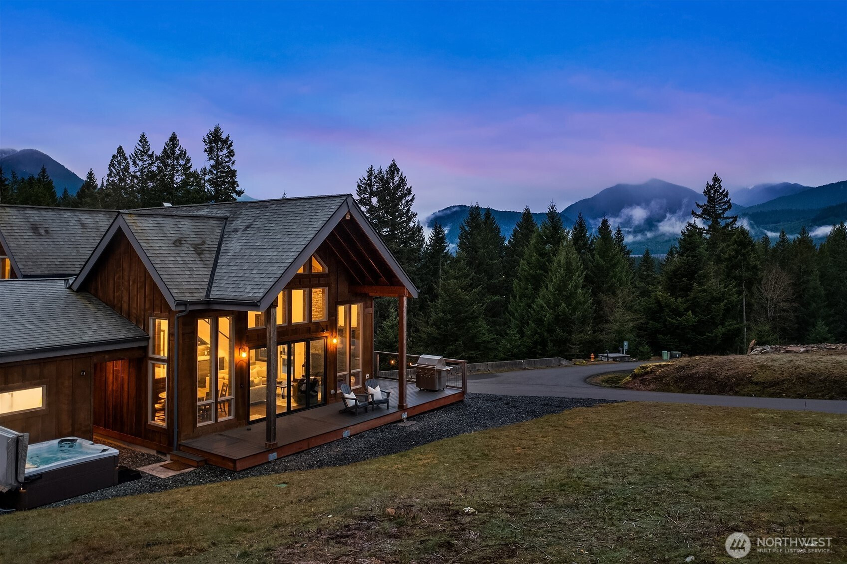 Welcome to Hideaway, Packwood’s premier gated neighborhood with arguably the best Mt. Rainier view in town. Sitting proudly on a shy half-acre is this stunning 2019 chalet. It features a NanaWall of glass facing the spectacular Mt. Rainier view, creating a seamless indoor-outdoor flow on to the composite low-maintenance wrap-around deck. The main level open-concept great room showcases a floor-to-ceiling fireplace that warms the room with the flip of a switch. The kitchen is equipped with a Dacor gas range and matching stainless-steel appliances. A hammered apron-front copper sink serves as a striking focal point, pairing beautifully with the granite countertops. Don’t miss the wet bar with wine fridge and matching hammered copper sink. The primary suite offers another gas fireplace and a 5-piece bath with clawfoot tub. Upstairs, you’ll love the bunk room with west-facing Cowlitz River Valley views. The third bedroom is adjoined by another full bath. The exterior is clad in cedar shake and stained board and batten siding, establishing a timeless aesthetic. The freshly paved asphalt drive welcomes you to the attached two vehicle carport with a beautiful tongue and groove ceiling and a convenient sizeable storage room for your recreational gear. Less than a mile from the shopping, dining, and entertainment of Packwood’s town center and 25 minutes from White Pass and Mt. Rainier National Park, this durable and timeless chalet is offered furnished for your immediate enjoyment.