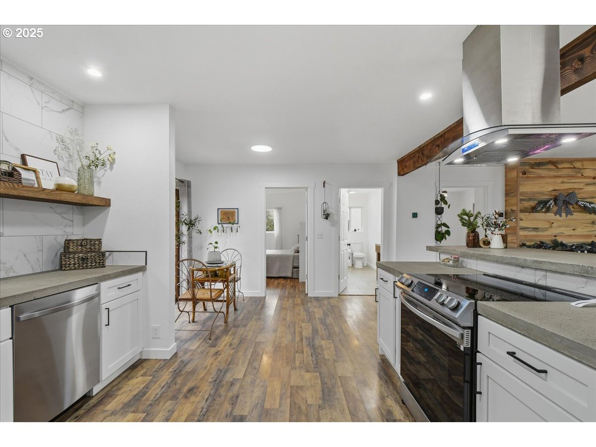 Move in Ready! Remodeled and full of charm, this home is packed with custom features throughout. Enjoy a spacious living area with newer flooring and a beautifully crafted custom fireplace. The open kitchen shines with custom concrete countertops and newer appliances that stay with the home. The large bathroom offers a custom countertop of its own, plus abundant storage. French doors lead out to a back deck overlooking the expansive backyard—perfect for relaxing or entertaining. A massive laundry room with a built-in custom bench provides even more storage and connects directly to the attached 2-car garage, which has plenty of room for projects or hobbies. In the basement you will find a flex room that is perfect for an office, playroom, or studio. Located on a quiet dead-end street, this home combines style, comfort, and functionality—ready for its next owner to enjoy!