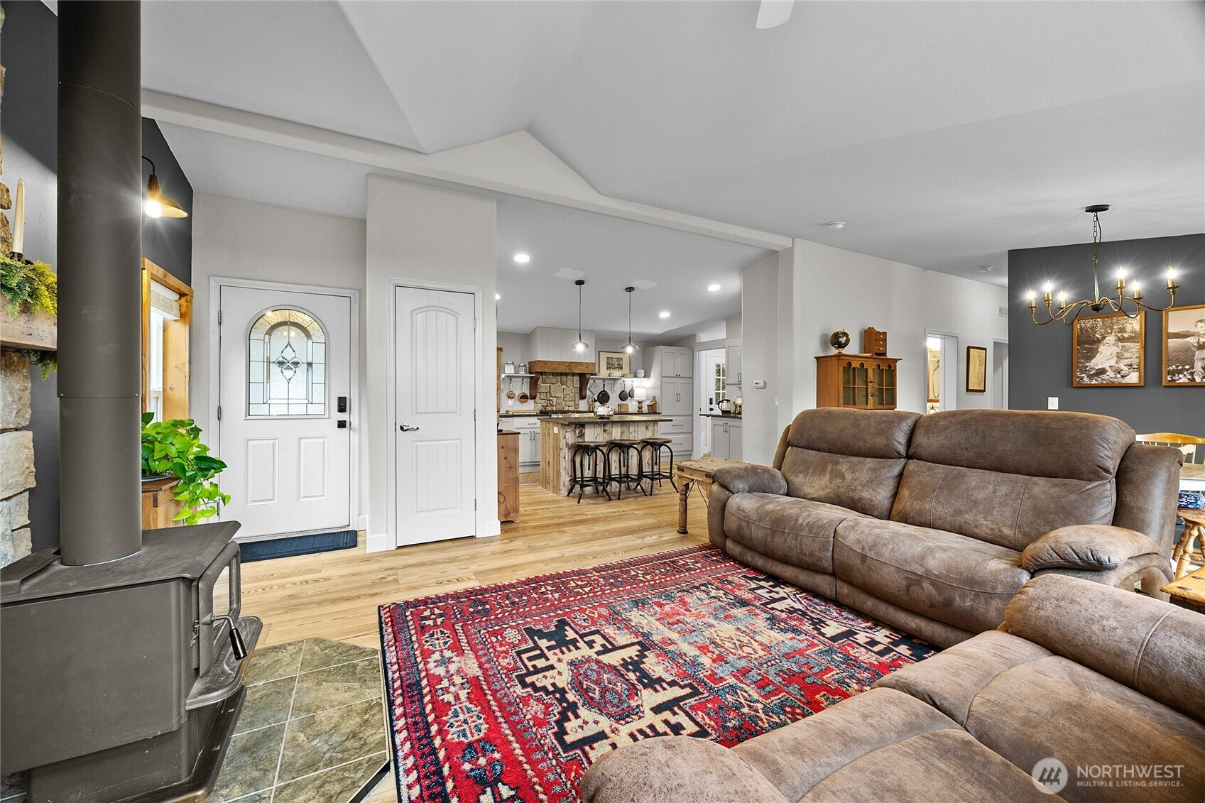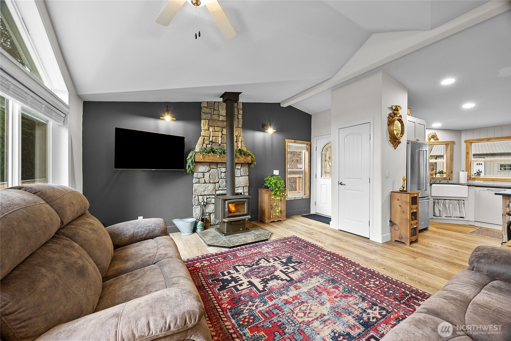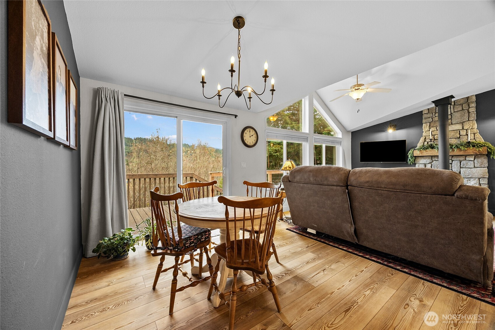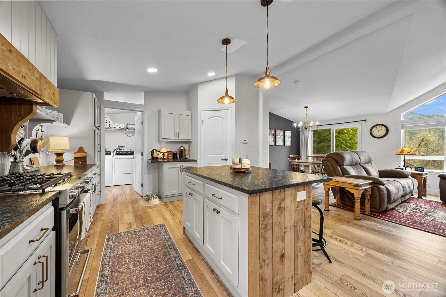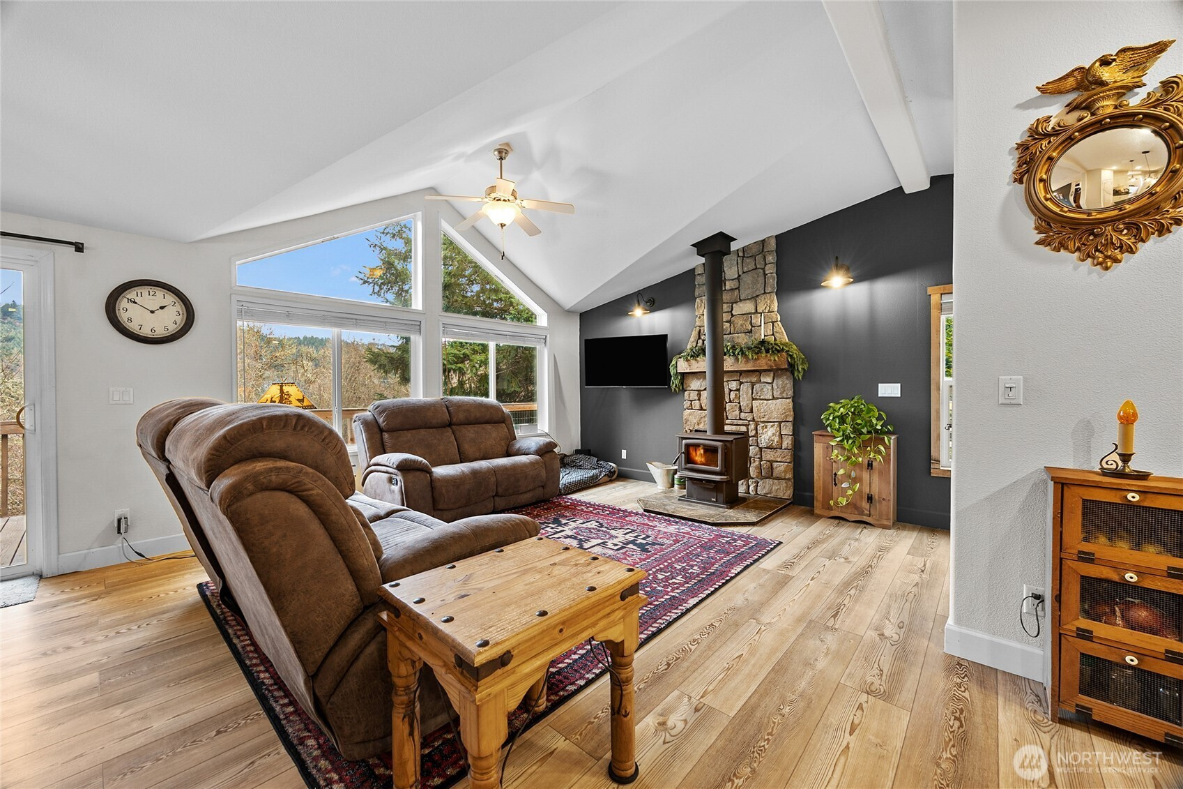 Come home to your own PNW Retreat on 5 private acres with a view of Burley Mountain! This 2-bedroom, 2-bath home is beautifully updated with new appliances and a fully updated kitchen. Lovely stone touches have been added behind the gas range and woodstove. New matching LVP flooring throughout and a spacious partial wrap around deck has been built. Three bedroom septic means you could possible convert the den to a third bedroom or add a small guest suite or ADU for more sleeping space. Large 30x42 detached garage/workshop has a nice 14 x 30 carport for your yard implements or vehicle AND there is an oversized 26 x 36 carport right at the utility room entrance door. Well built chicken coop, mature orchard, fenced garden space, and newly installed greenhouse could make your private homestead dreams come true. Seasonal creek wanders through the property. Enjoy the well established landscaping. Great southern exposure for light year round. Close to Gifford Pinchot access and surrounded by wildlife.
