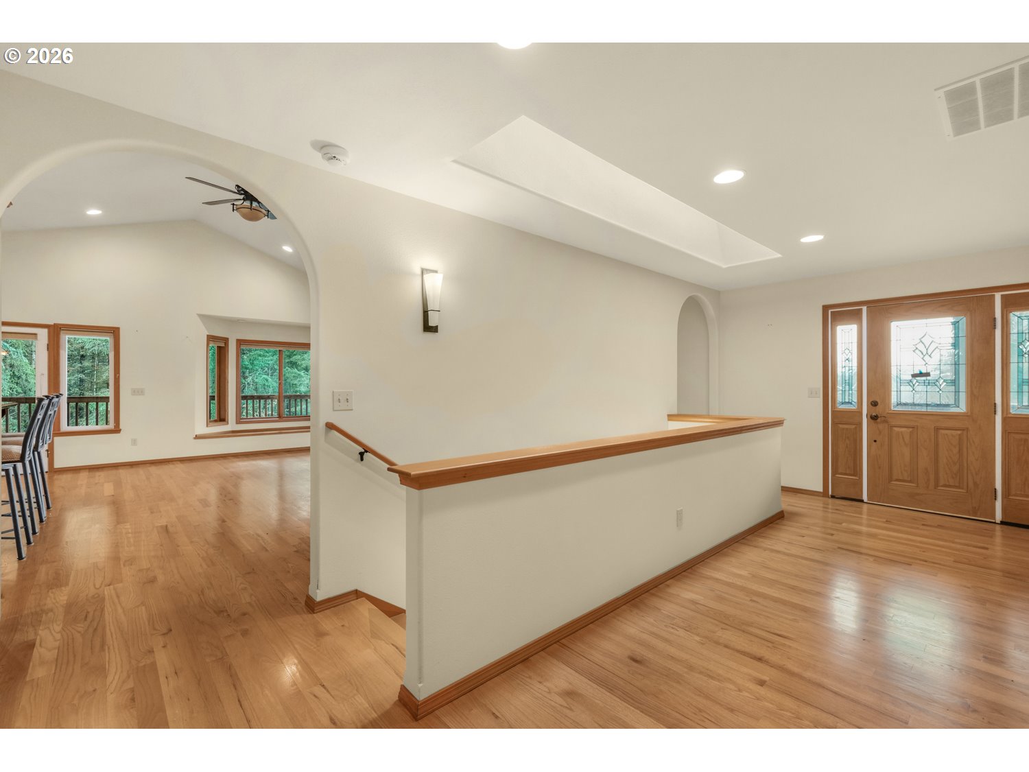 Perched atop 3.62 private acres, this exceptional property offers sweeping views over the treetops and a peaceful setting surrounded by nature. The home sits well off the road, creating a sense of seclusion while still being just minutes from town. Mature forest blends beautifully into open grassy meadows, with established rhododendrons and a variety of fruit trees including pear and apple. Adjacent to Port Blakely Tree Farm, the neighboring land provides added privacy with minimal nearby development. Designed for both comfort and style, the custom-built home features high-end finishes throughout. The open-concept main level showcases real hardwood flooring, soaring vaulted ceilings, and a stunning living room with built-in cabinetry, a sunny bay window and a gas fireplace with natural rock surround. The chef’s kitchen is equipped with granite countertops, stainless steel appliances, custom cabinetry, an island with an eat bar and french doors to the covered deck, making it perfect for entertaining. The primary suite offers a true retreat with a large jetted tub, oversized walk-in closet, and French doors leading to the covered wrap-around deck where you can enjoy the serene surroundings. The lower level includes two additional spacious bedrooms, one featuring a cozy wood stove and French doors, along with a full guest bath and an expansive laundry room with lots of storage. Additional highlights include a private well with its own water system, sprinkler system for landscaping, a new storage shed at the top of the property, and a recently installed tankless water heater. Wrought iron fencing and gates are currently being added for enhanced privacy and security. Enjoy the best of country living with the convenience of being just 10 minutes from dining, shopping, parks, and Providence Centralia Hospital.