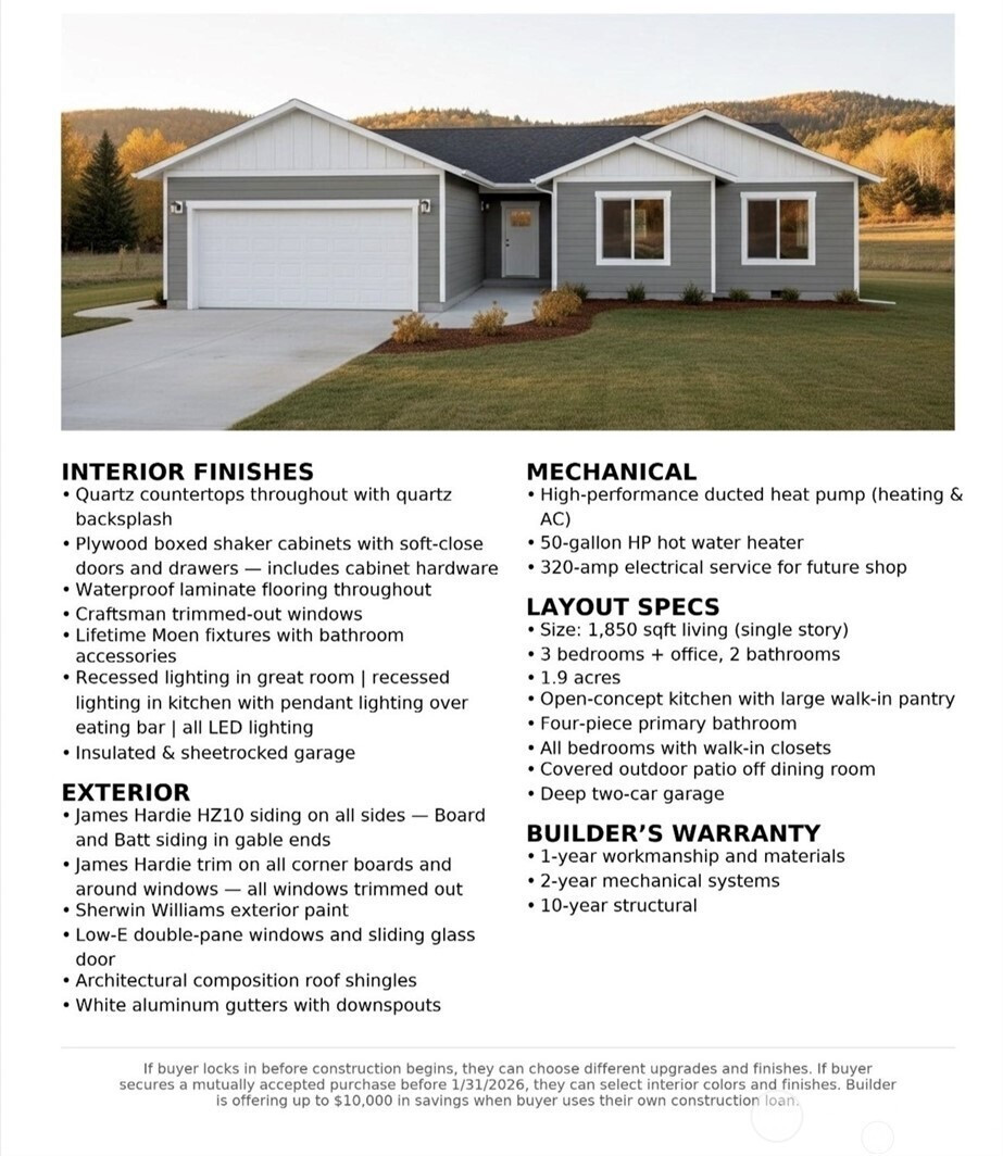 New construction presale on 11+ private acres in a quiet area, minutes from I-5 & close to all the amenities needed. Enjoy peaceful country living w/modern design & quality craftsmanship throughout. 1,850 sqft home offers 3 bedrooms, an office, & 2 baths in a bright, open-concept layout. Primary suite features a walk-in closet & spa-style bath, & every bedroom includes its own walk-in. Kitchen showcases quartz counters, soft-close shaker cabinets, & a large walk-in pantry. Highlights include a spacious great room, office/bonus area, water proof laminate flooring, full window trim, high-efficiency ducted heat pump, solar panels, 320-amp service for future shop, vaulted covered porch, deep two-car insulated garage, close to schools & shopping