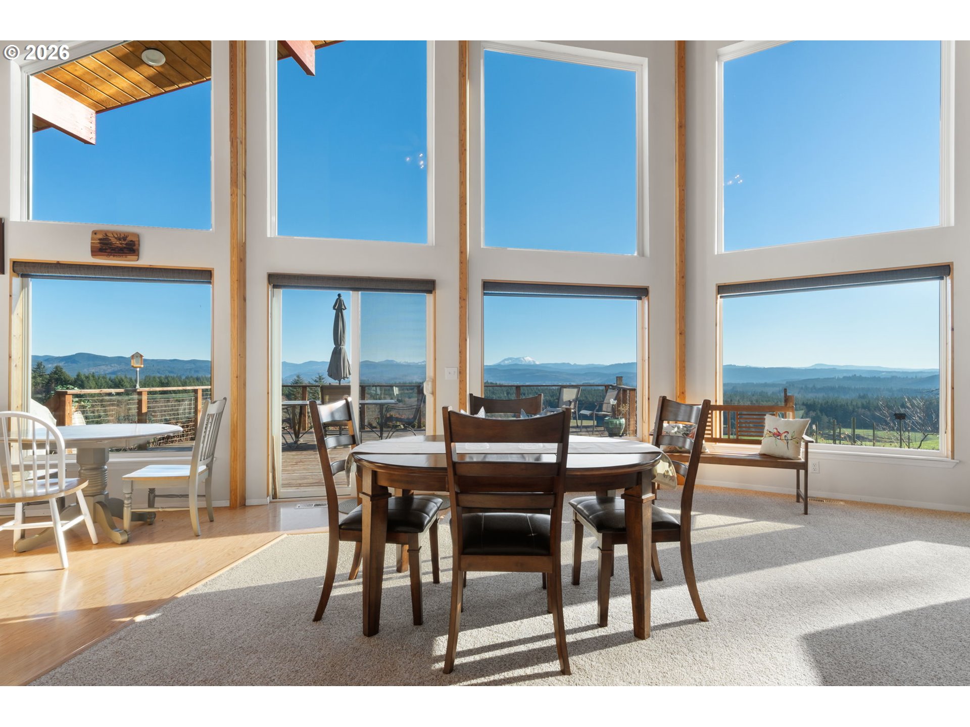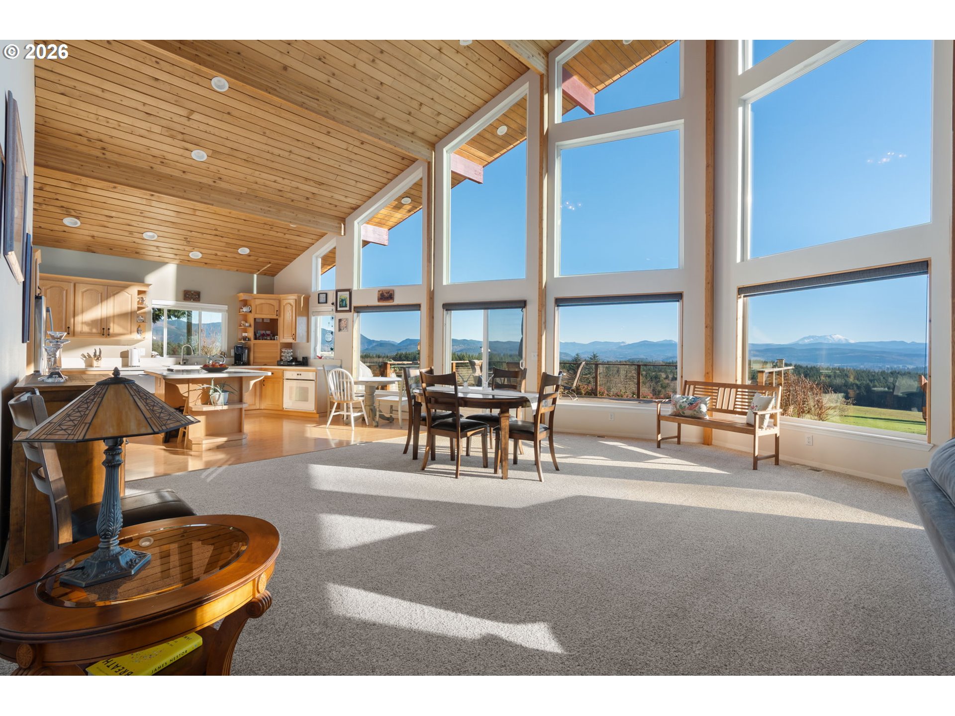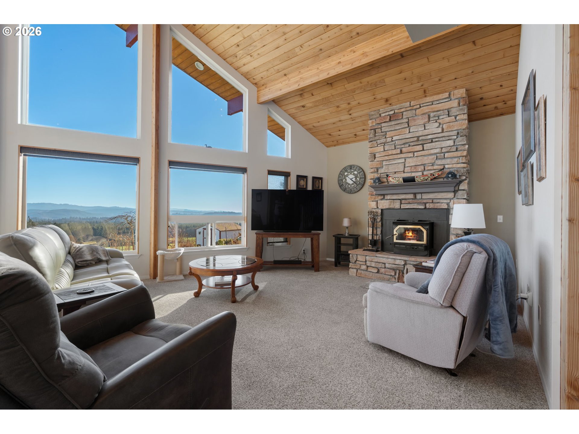 Wake up to breathtaking panoramic mountain views in this 3-bedroom, 2.5-bath home filled with natural light. Tongue-and-groove vaulted ceilings and cathedral windows create an open feel, while the living room offers a cozy wood fireplace insert. Enjoy the views from the expansive deck, ideal for relaxing or entertaining. The home and outbuildings have been recently reroofed and upgraded with LED lighting. A heat pump A/C system provides efficient comfort. The primary suite features a heated soaking tub and separate shower. Property includes an attached 2-car garage, a fully insulated 48x48 shop, and a separate insulated detached shop/garage with loft, workspace, wood stove, 220 power, and full bath. The home is wired for a generator and includes fruit trees and garden space. A must-see property with views, function, and flexibility.