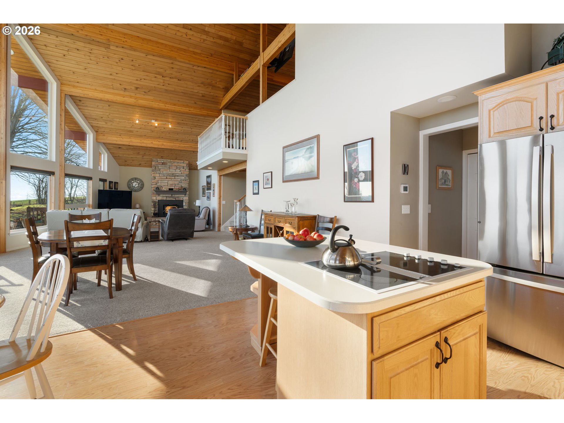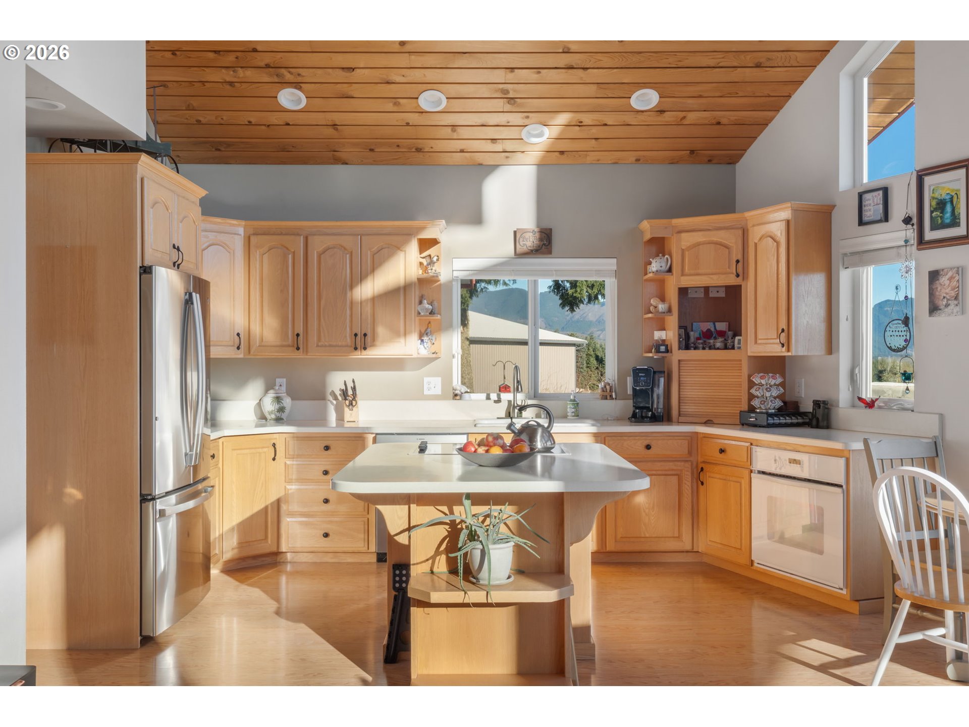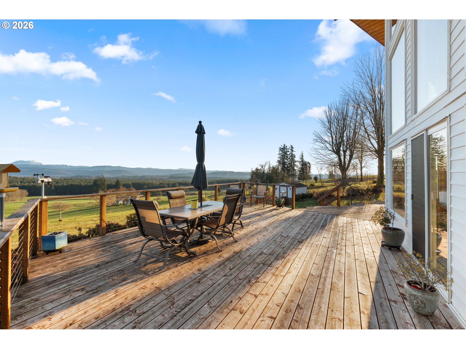 Wake up to breathtaking panoramic mountain views in this 3-bedroom, 2.5-bath home filled with natural light. Tongue-and-groove vaulted ceilings and cathedral windows create an open feel, while the living room offers a cozy wood fireplace insert. Enjoy the views from the expansive deck, ideal for relaxing or entertaining. The home and outbuildings have been recently reroofed and upgraded with LED lighting. A heat pump A/C system provides efficient comfort. The primary suite features a heated soaking tub and separate shower. Property includes an attached 2-car garage, a fully insulated 48x48 shop, and a separate insulated detached shop/garage with loft, workspace, wood stove, 220 power, and full bath. The home is wired for a generator and includes fruit trees and garden space. A must-see property with views, function, and flexibility.
