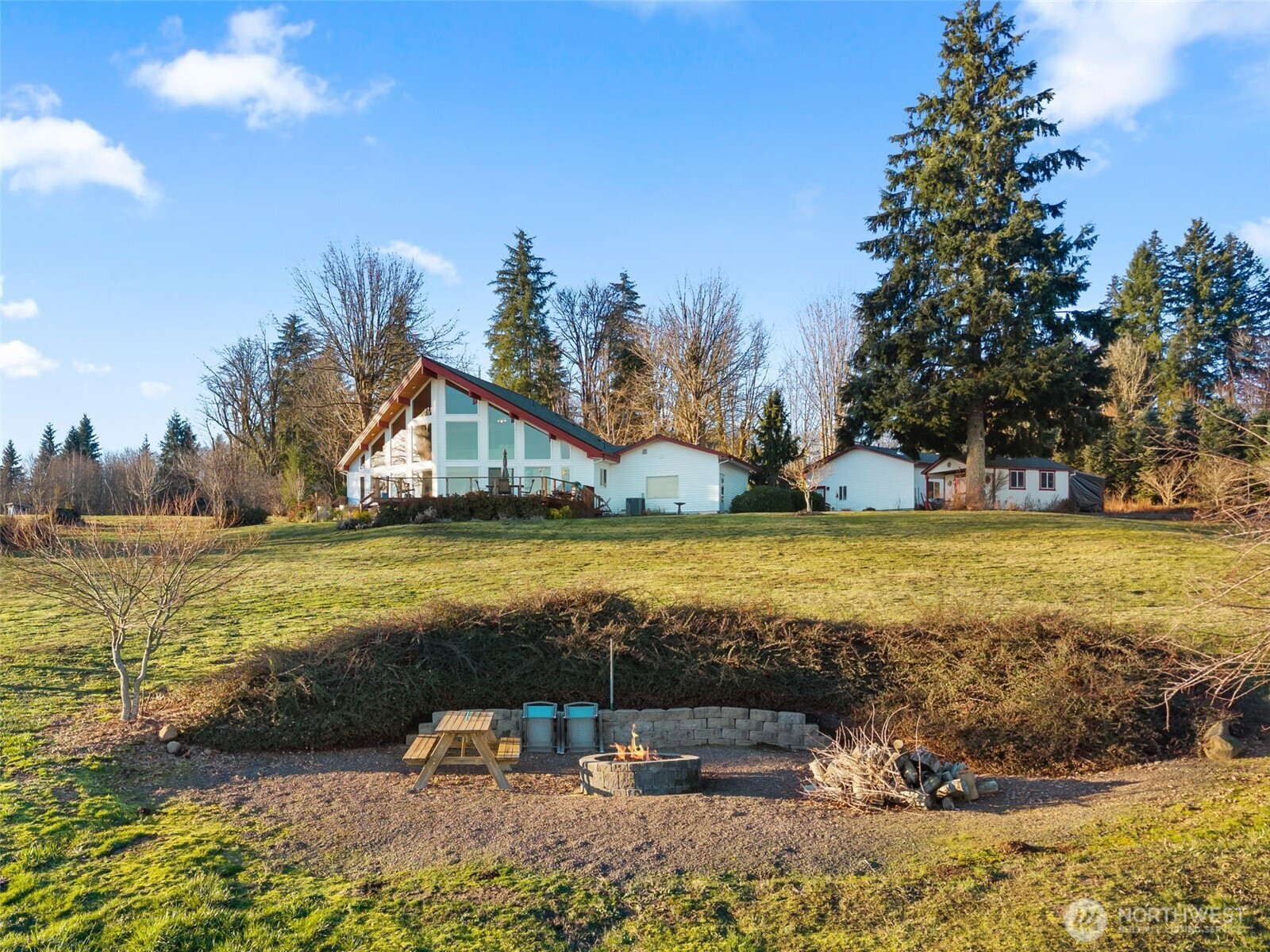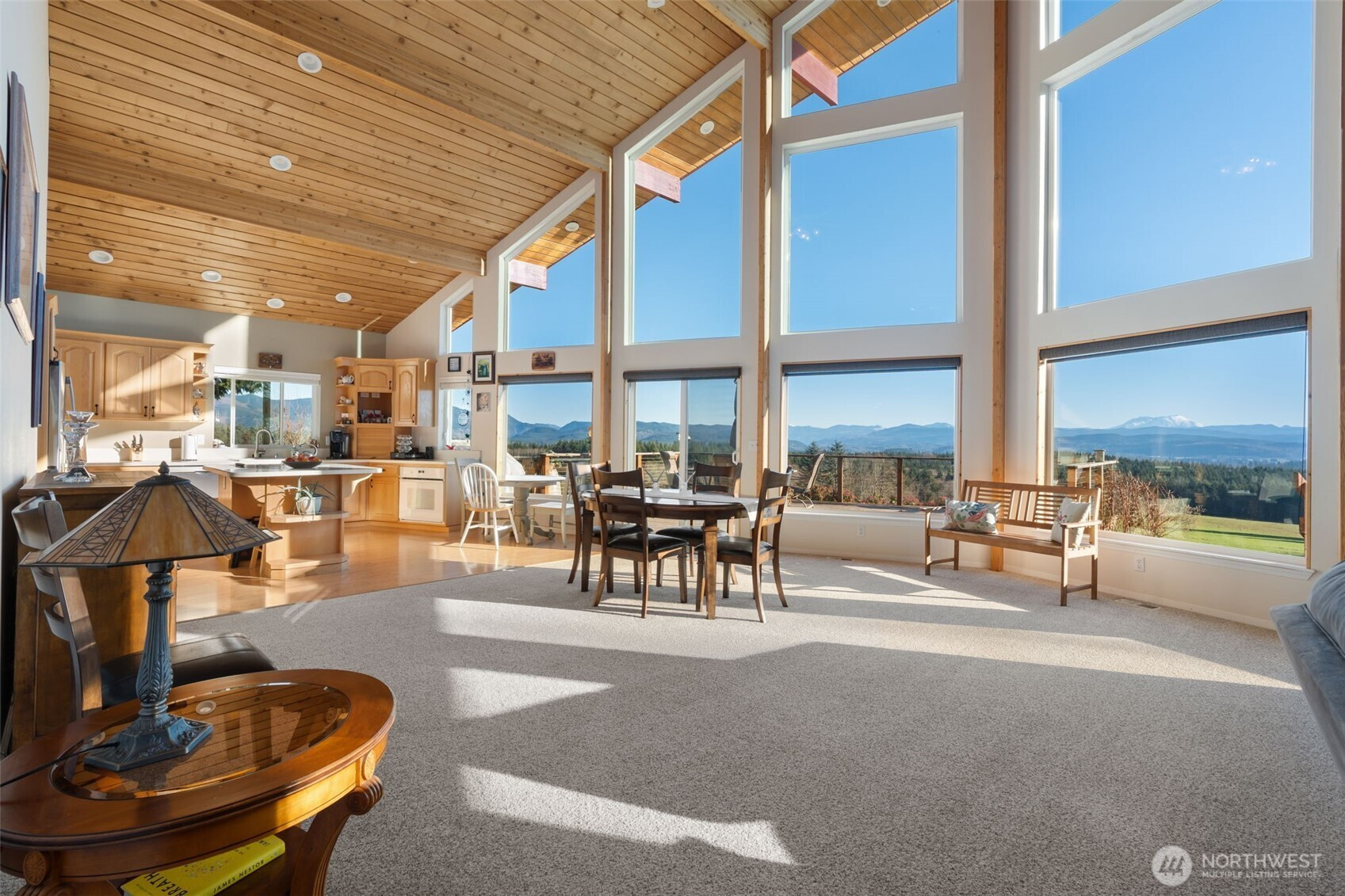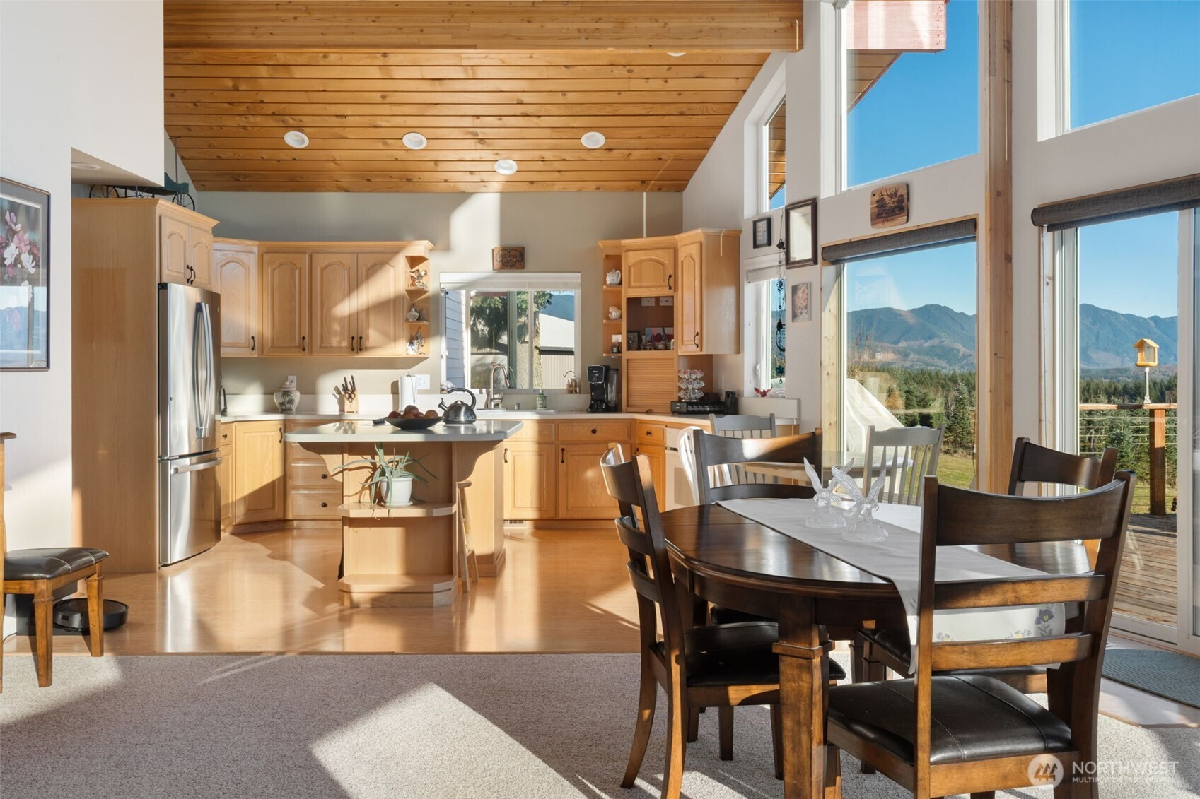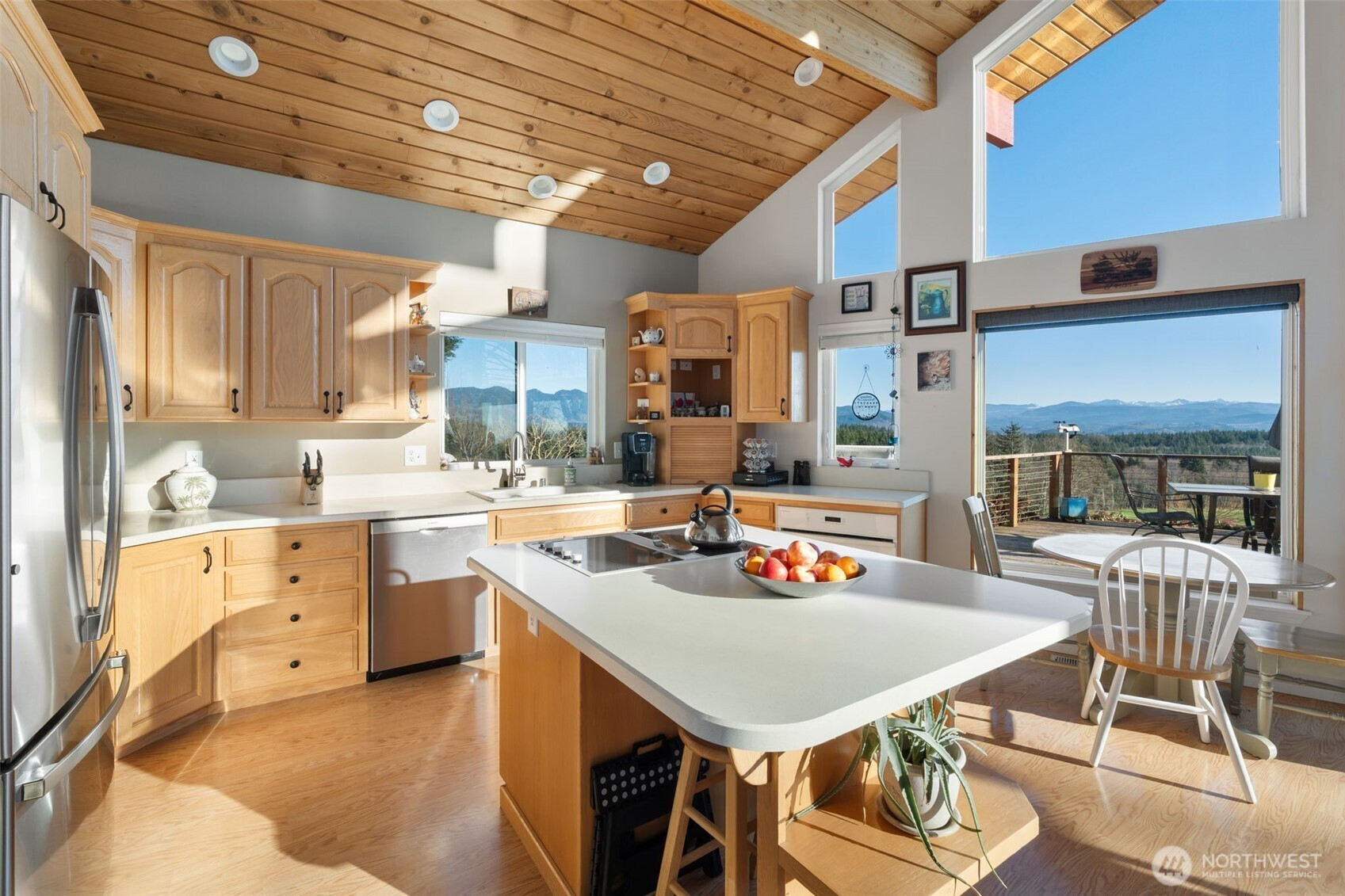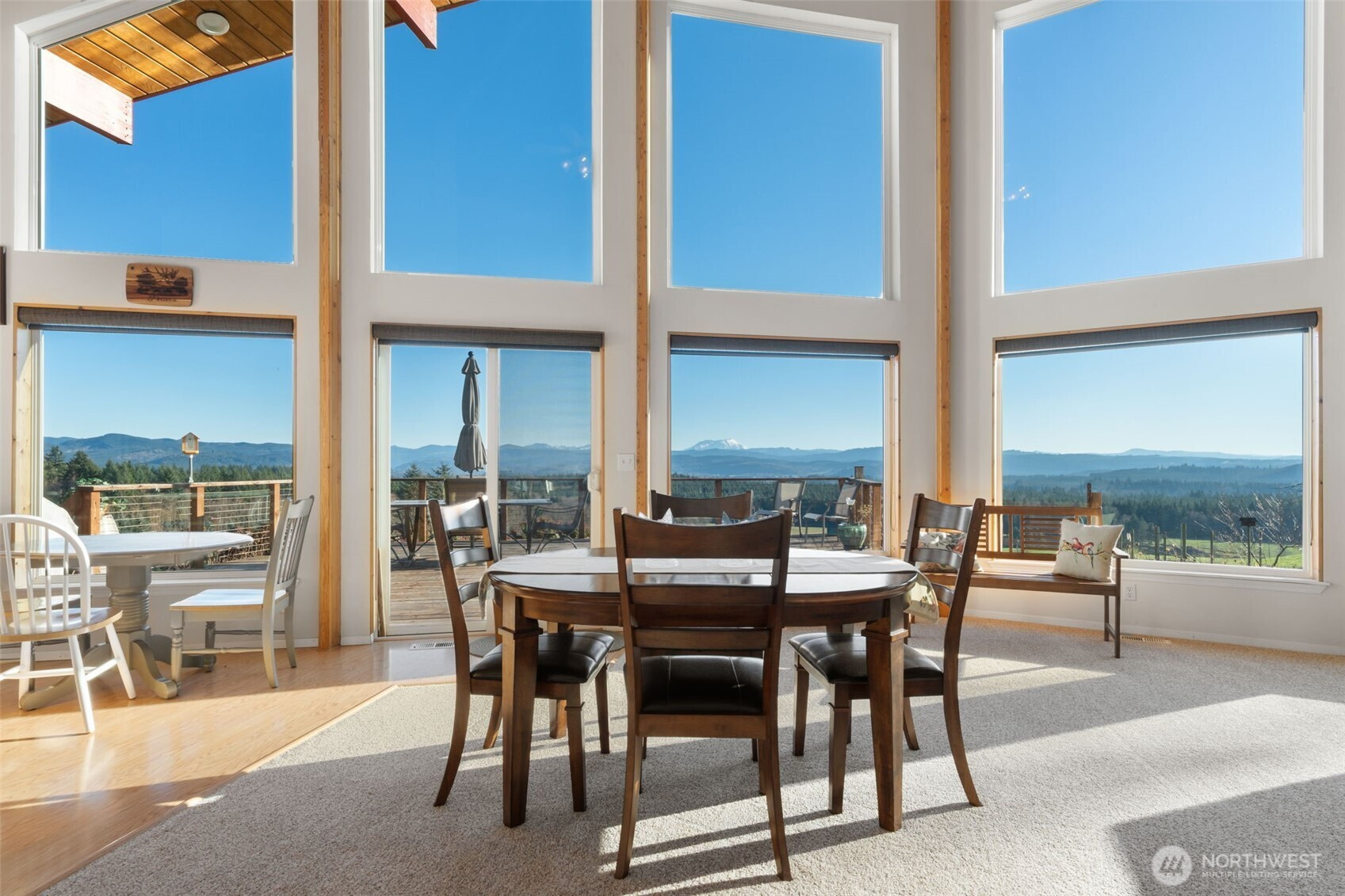 Wake up to breathtaking panoramic mountain views in this 3-bedroom, 2.5-bath home filled with natural light. Tongue-and-groove vaulted ceilings and cathedral windows create an open feel, while the living room offers a cozy wood fireplace insert. Enjoy the views from the expansive deck, ideal for relaxing or entertaining. The home and outbuildings have been recently reroofed and upgraded with LED lighting. A heat pump A/C system provides efficient comfort. The primary suite features a heated soaking tub and separate shower. Property includes an attached 2-car garage, a fully insulated 48x48 shop, and a separate insulated detached shop/garage with loft, workspace, wood stove, 220 power, and full bath. The home is wired for a generator and includes fruit trees and garden space. A must-see property with stunning views, function, and flexibility.