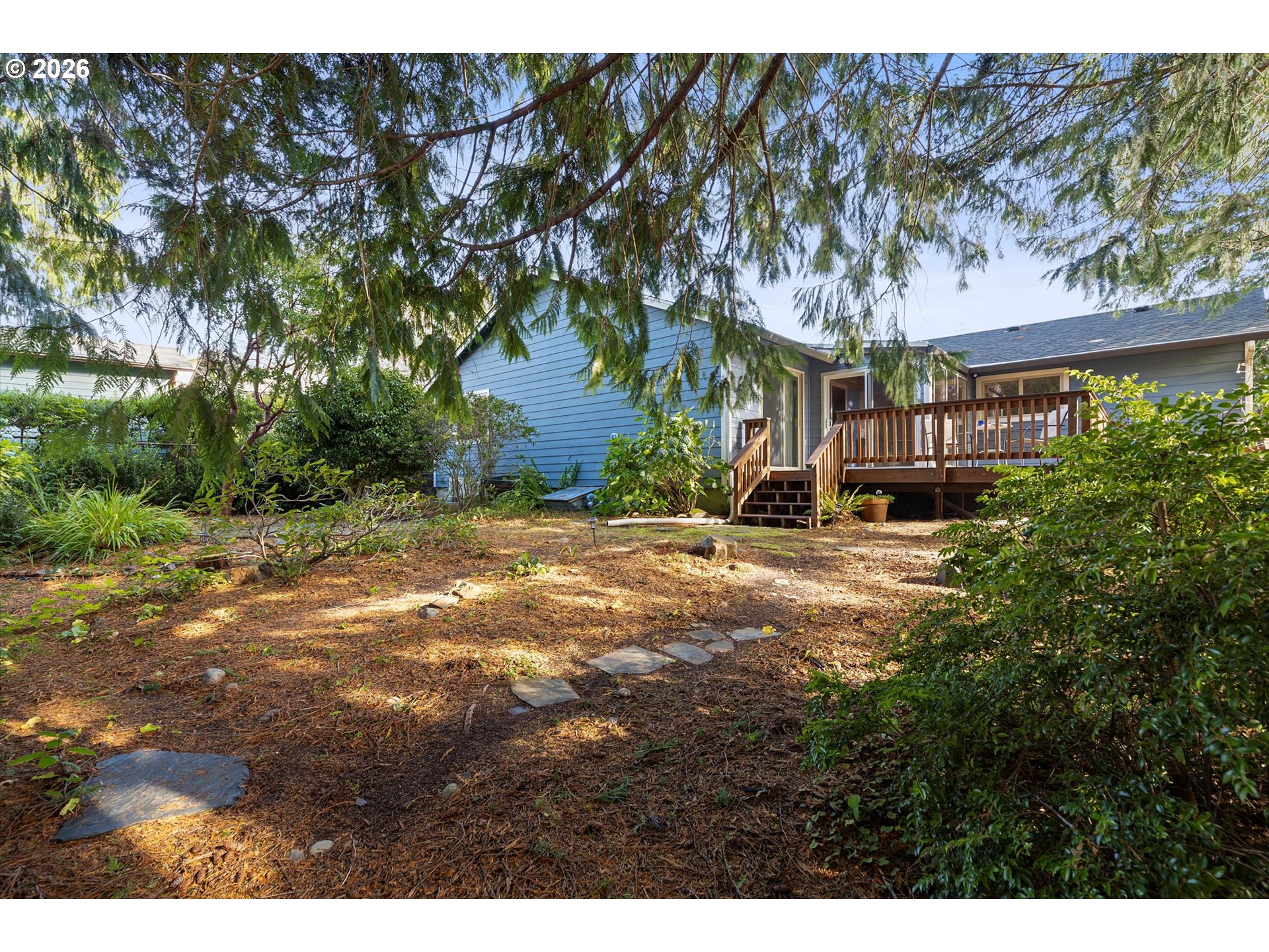 Perfectly maintained 3-bed, 2-bath single-level home where comfort meets coastal charm. Step inside to vaulted ceilings and custom hickory floors throughout the light-filled, airy living space. The kitchen features stainless steel appliances and an instant-hot "hot-pot" tap for added convenience. Central vacuum makes everyday living easy, while the bonus sunroom is the perfect spot for morning coffee, a quiet read, or even a relaxing yoga session. Step outside to the fully fenced backyard—ideal for pets, gardening, or sunset gatherings. Recent updates include a new deck, gutter guards, a new roof, and a ductless heat pump for efficient year-round comfort. The attached two-car garage provides both practicality and extra storage. Located outside of tsunami zones and just minutes to golf, downtown Waldport, the river, and ocean beaches, this home offers an ideal coastal retreat or comfortable full-time residence. Short-term rentals are allowed; buyer to verify permitting requirements with the City of Waldport Planning Department.