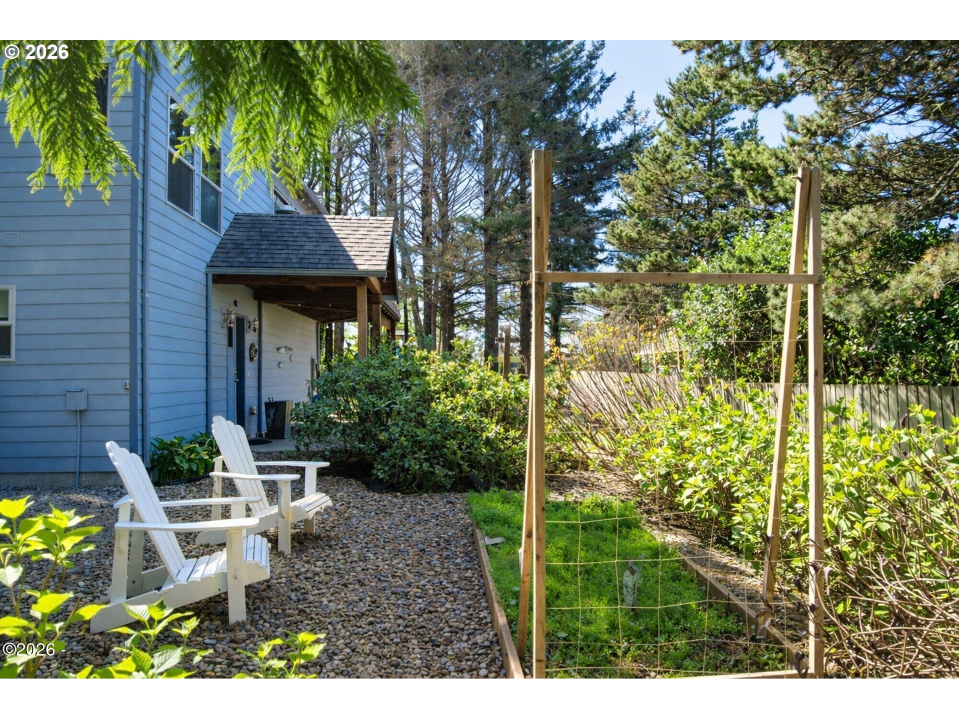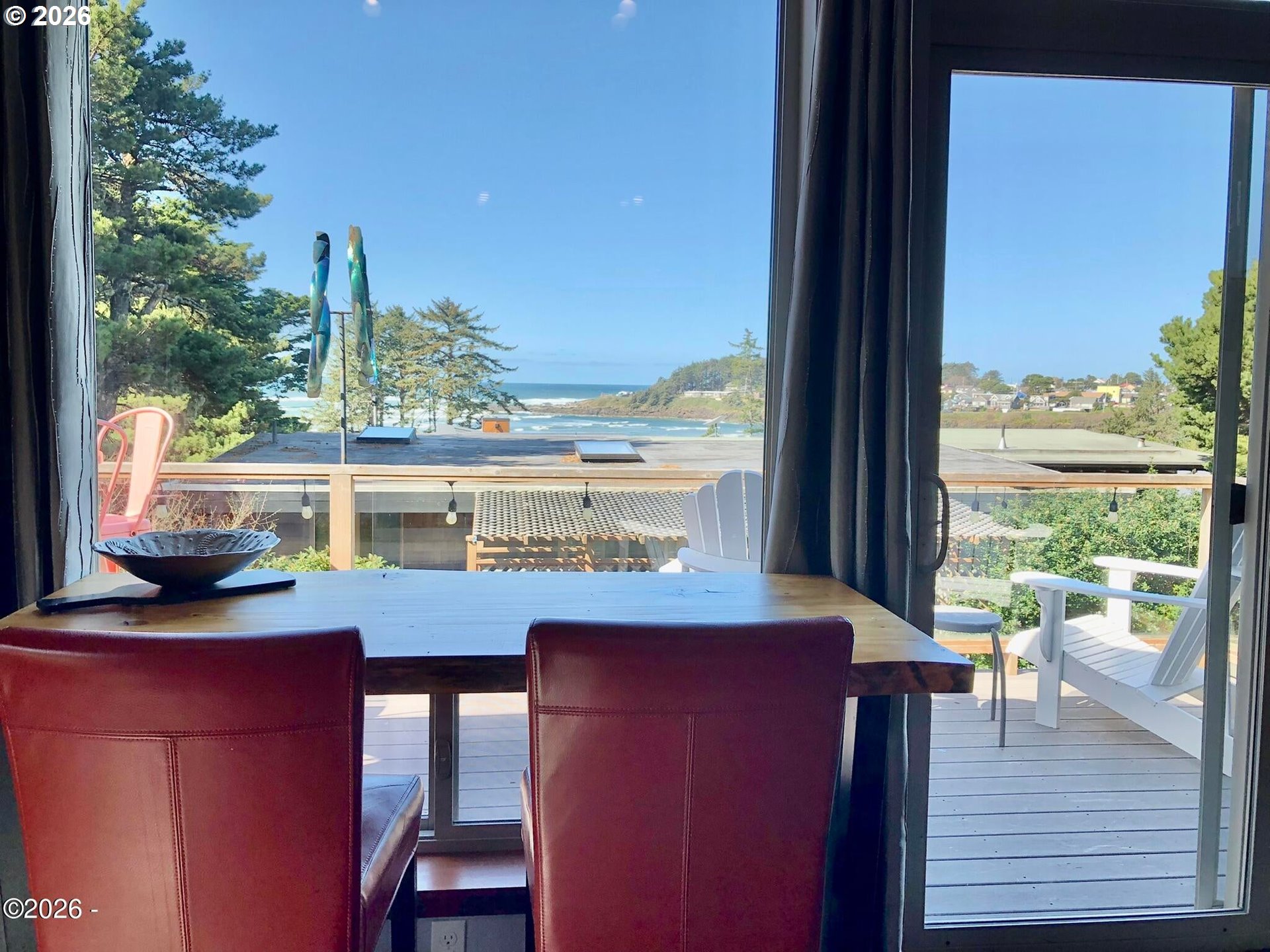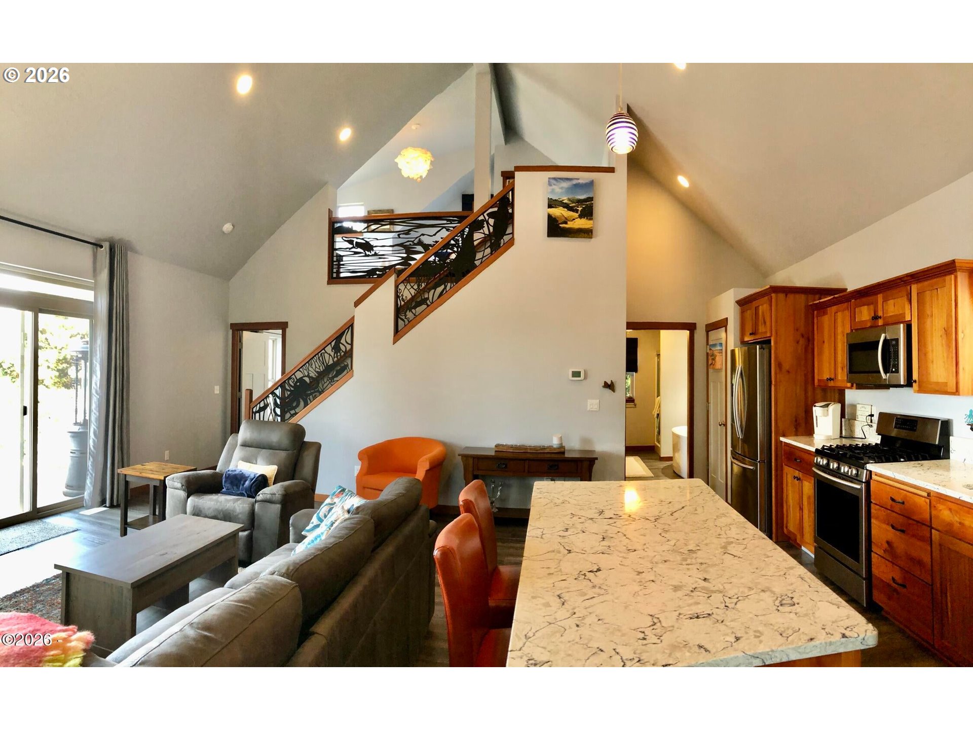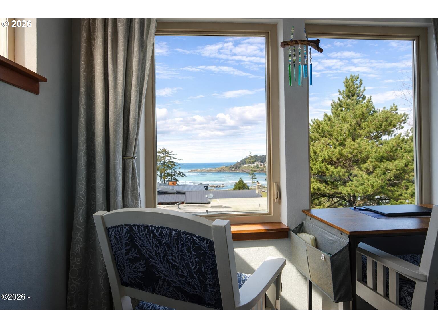 (503) 893-8874Ocean, bay, and rocky shoreline views define this exceptional coastal retreat. From the main living area and deck, enjoy ever-changing scenery—whales migrating, surfers riding the swell, and stunning sunsets that transition into evenings filled with distant boat lights and the soothing sound of the ocean. Built in 2016 and located just west of Hwy 101, this private 3-level home sits approximately one block from the shoreline and includes a deeded walking easement to Ocean Road with access to a sandy beach. A protected view corridor helps preserve the sweeping vistas. The main level features vaulted ceilings, expansive west-facing windows, and a floor-to-ceiling stone gas fireplace that anchors the space. The kitchen offers quartz countertops, cherry cabinetry, a large island, and a gas range—ideal for cooking and gathering. A custom staircase railing with an ocean-inspired design adds a unique architectural touch. The primary suite showcases both ocean and bay views and includes a soaking tub with water views, double shower, quartz vanity, and cherry cabinetry. The entry level provides a spacious guest bedroom, full bath with double shower, and access to the attached two-car garage with laundry and additional shop space. RV/boat parking is also available. The loft above provides flexible sleeping space, a half bath, and a vantage point to enjoy fireworks and the setting moon over Yachats Bay. Additional features include central heat and A/C, on-demand hot water, excellent insulation, and chair lift wiring. An outdoor hot/cold faucet is perfect after beach outings. The loft offers flexible sleeping space, a half bath, and elevated views.The landscaped yard includes hydrangeas, crocosmia, raised beds, and mature cedar trees. A detached studio (built 2023) with electricity and Wi-Fi is ideal for creative use. Located on a quiet dead-end street, this home offers privacy, natural beauty, and coastal living at its finest. Offered furnished if desired.