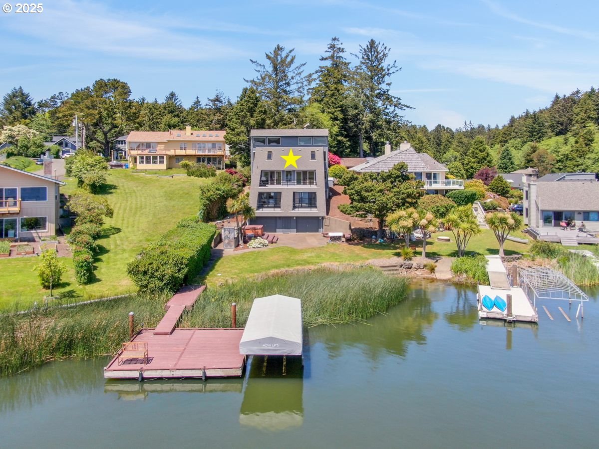 (503) 893-8874Lakefront paradise in the gated Indian Shores community! This lovingly cared for 4 BR/4 BA, 2112 sf home boasts a new roof/gutters/Hardie siding/windows/fresh exterior paint & redecked balconies. Enjoy stunning Devil's Lake views from the moment you step inside. With 3 spacious levels, highlights include a whirlpool master tub, wood-burning fireplace plumbed for gas, built-in vacuum & gas BBQ hookup. Multi-level decks and large windows invite serene lake and mountain views. The ultimate outdoor lifestyle awaits: hot tub, fire pit, patio stereo, heated shower, boat room with kitchenette, & floating dock with Aqua Lift. 4 garages (2 lakeside/2 front), birdwatching, and direct access to hiking trails, beaches & Lincoln City's many attractions-Perfect for year round living or ideal escape!