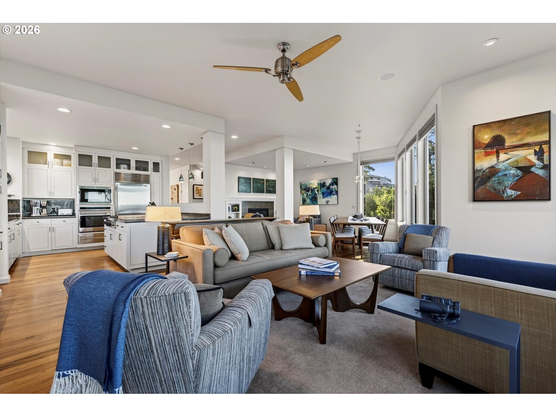 CeilingFan, Fireplace, HardwoodFloors, LivingRoomDiningRoomCombo