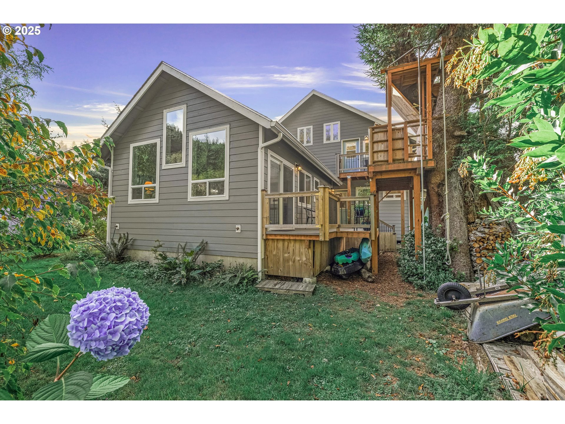 (503) 893-8874Tucked along the Yachats River, this 2,200 sq ft custom home offers peaceful coastal living with exceptional flexibility. The main level features an open kitchen/living area with wood stove, abundant natural light, and a main-level primary bedroom with an ensuite. The upper level functions as a private guest or multi-generational suite, complete with vaulted bonus room, kitchenette, bedroom with full bath, office/optional bedroom, and a loft for storage or overflow sleeping. Enjoy a spacious deck, landscaped yard with fruit trees, whimsical treehouse, and easy river access for kayaking or paddle-boarding. Quiet Water HOA amenities include a seasonal pool, hot tub, and tennis court. Minutes to downtown Yachats—an ideal blend of versatility, comfort, and coastal charm.
