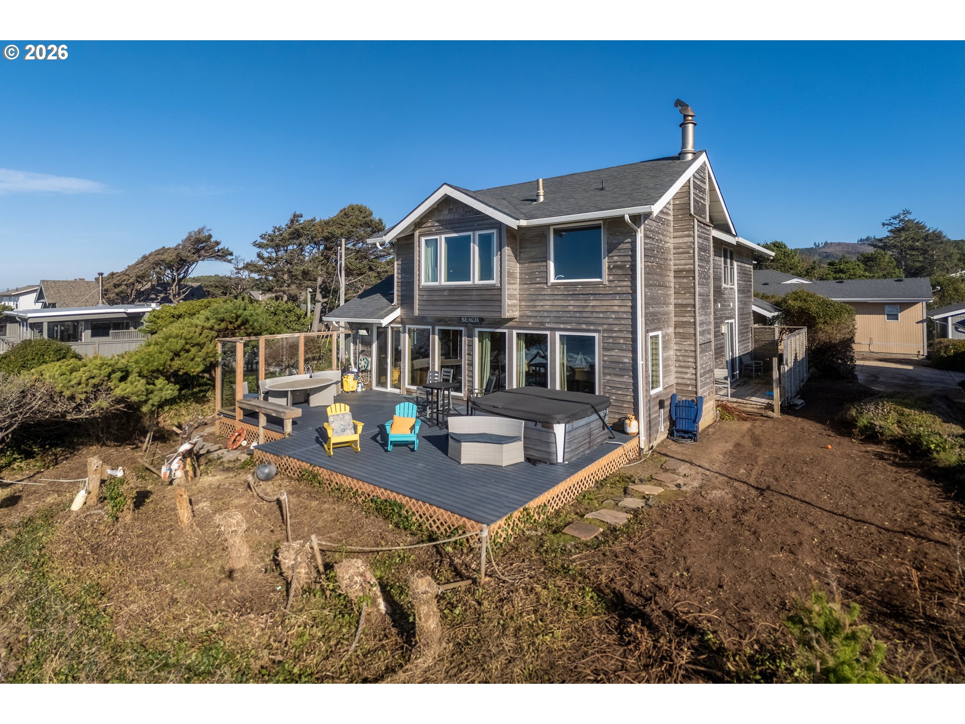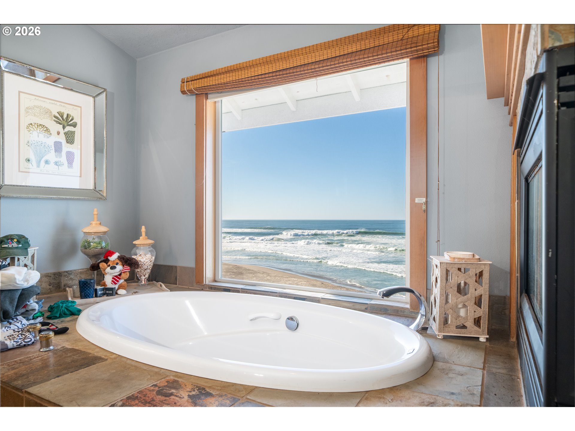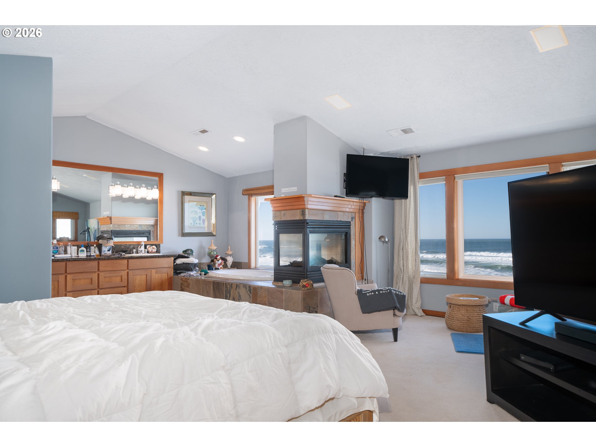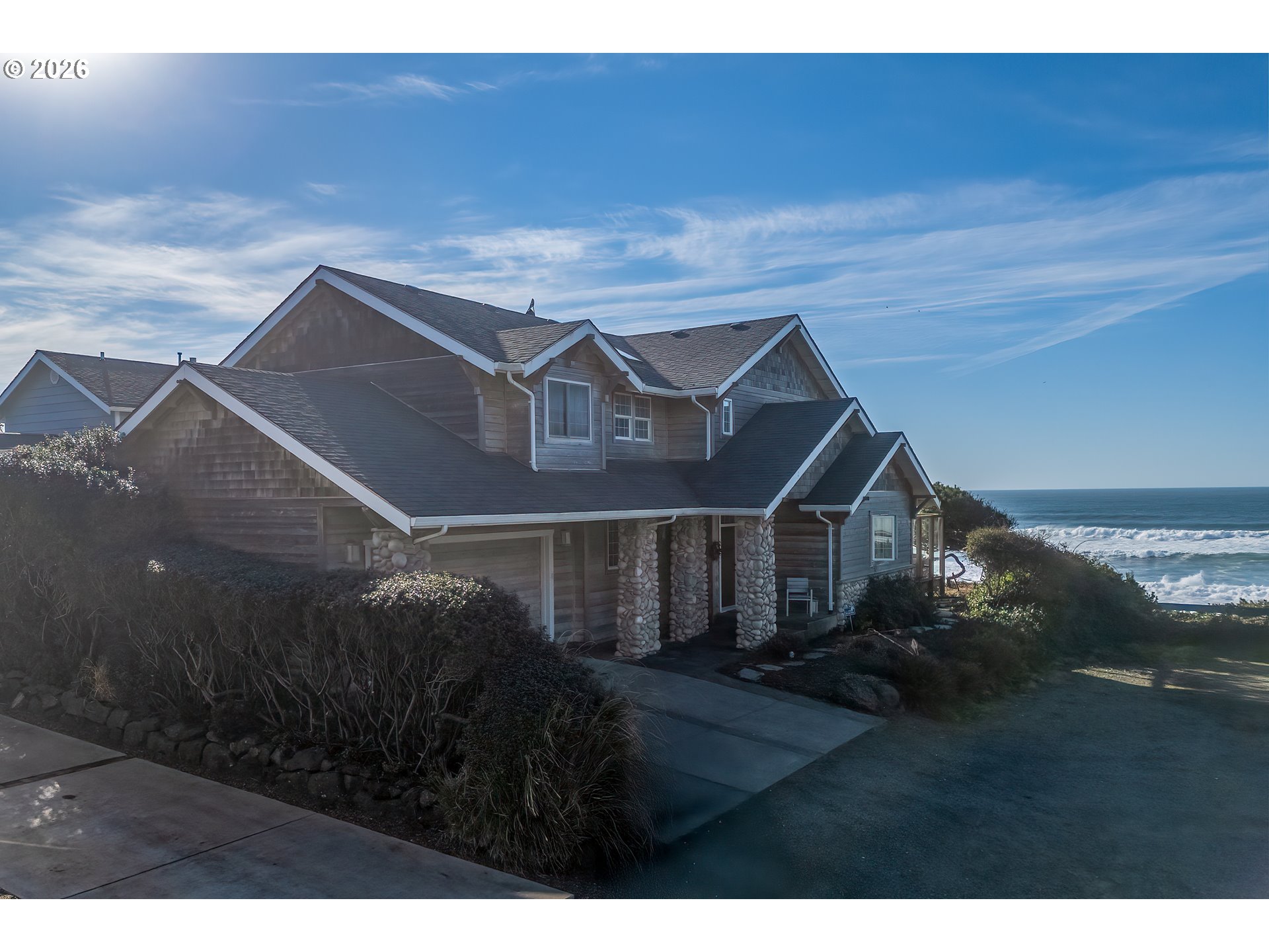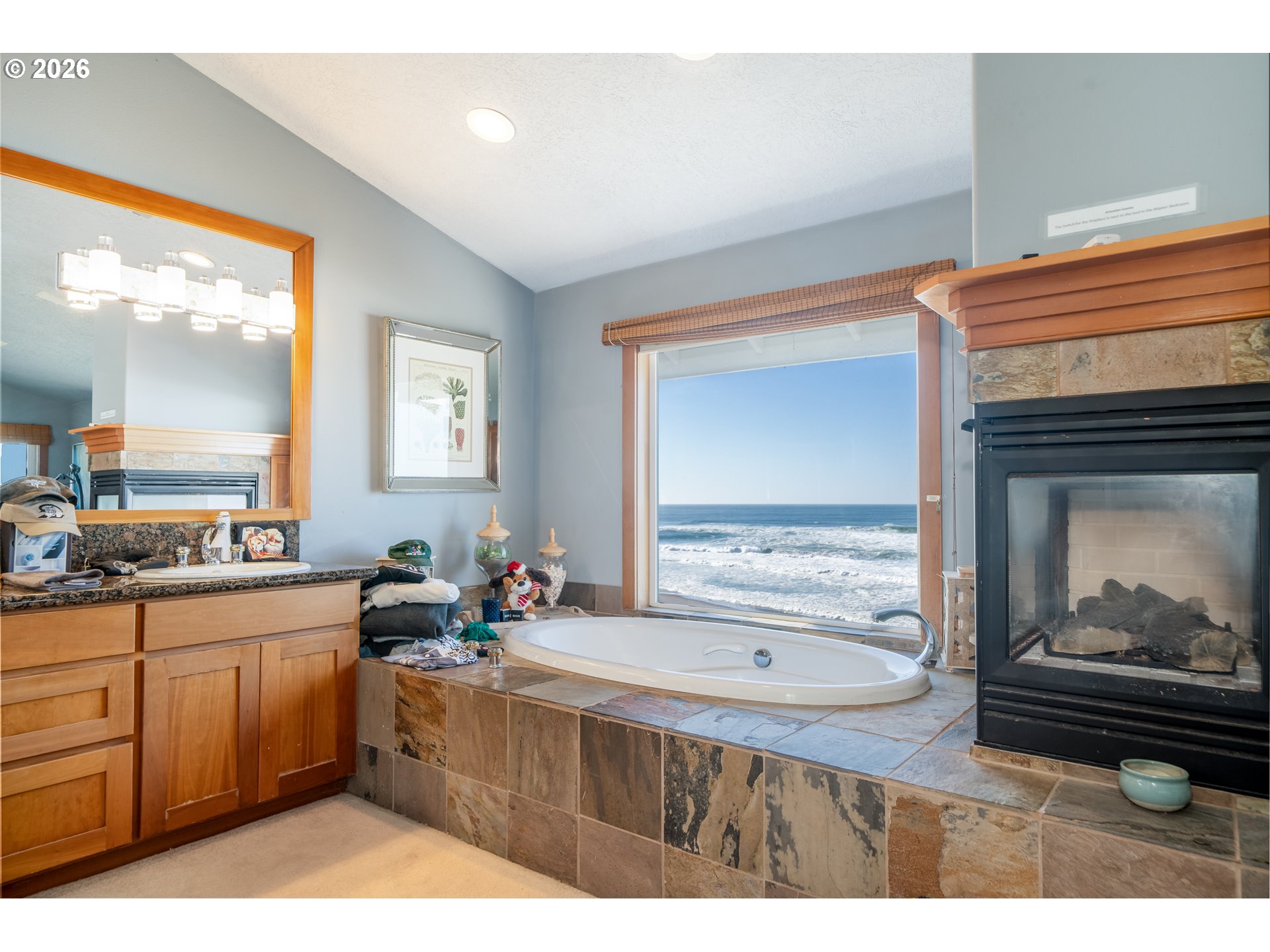 Expansive Ocean Views! 3 Primary Suites! Open floor plan, Wall of windows, Media room could be 4th bedroom. Pantry, Skylights, Granite counters, wood burning fireplace in Living room, gas fireplace in primary bedroom, Large deck w/hot tub and oversized 2 car garage.