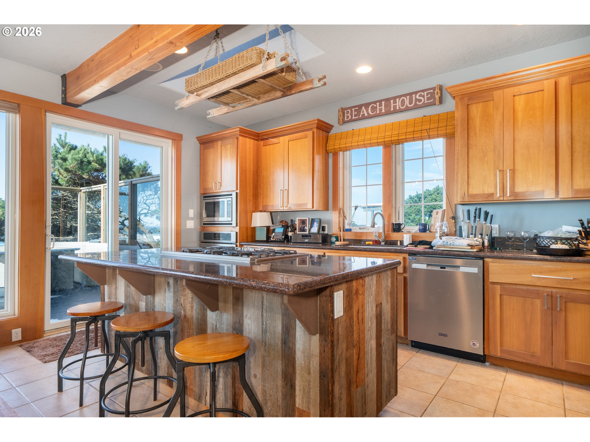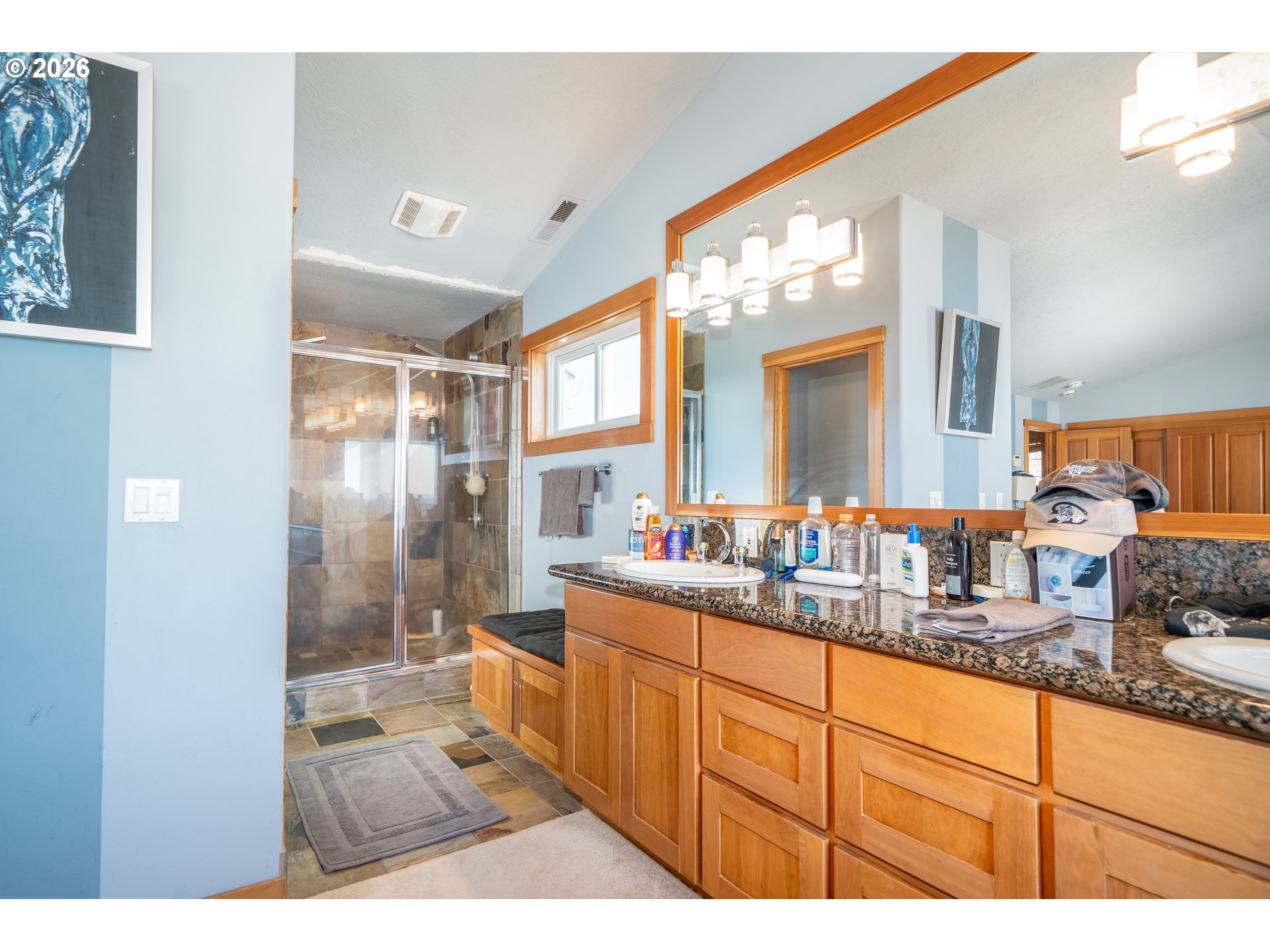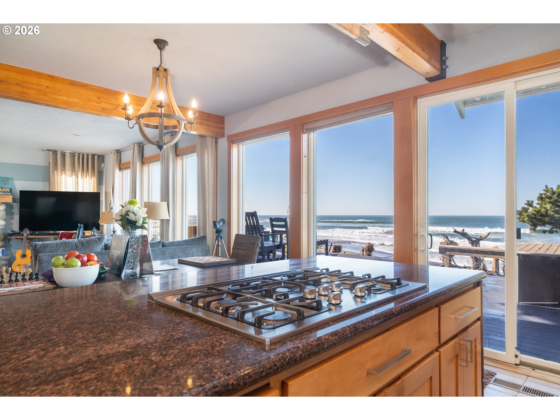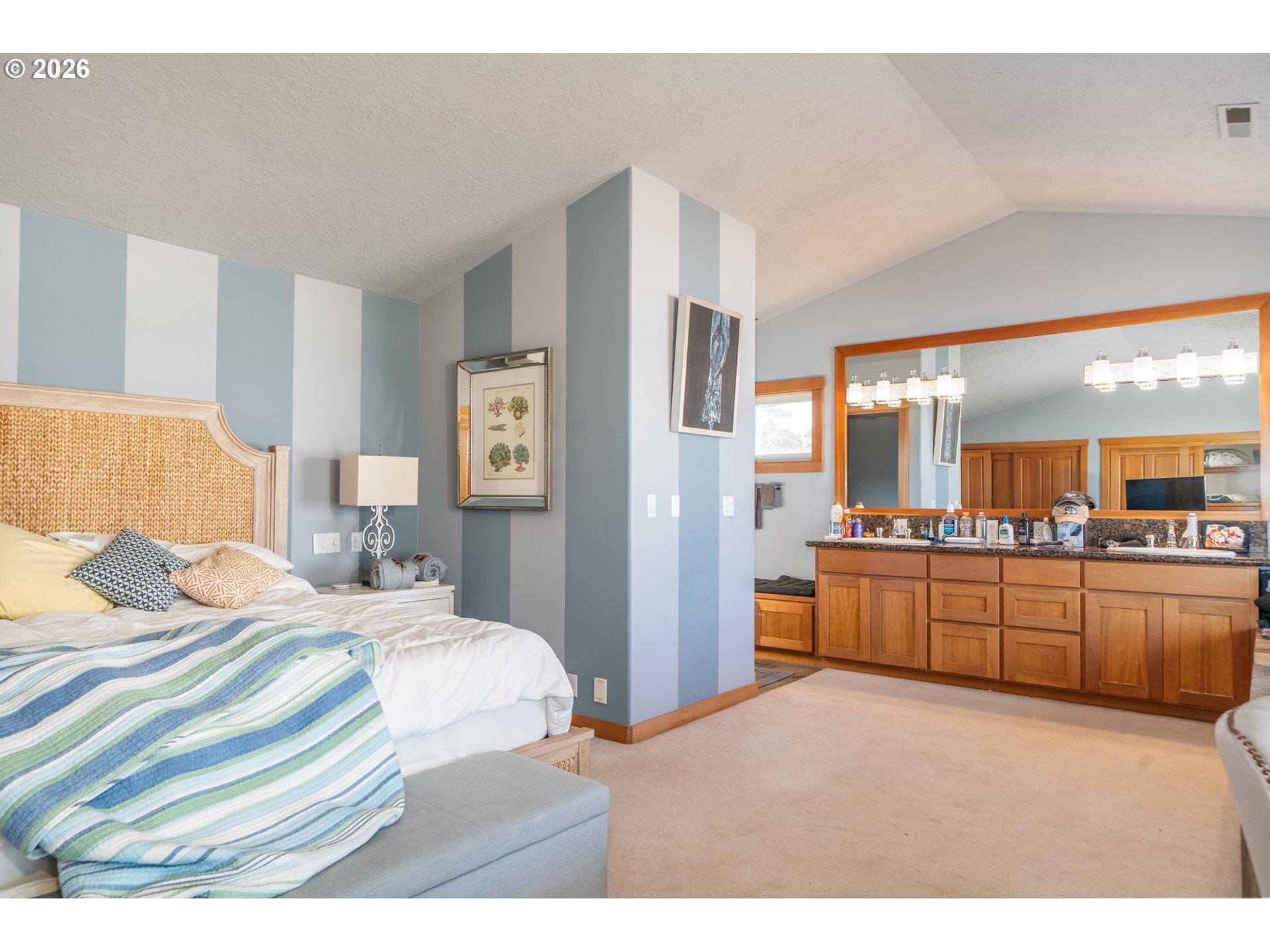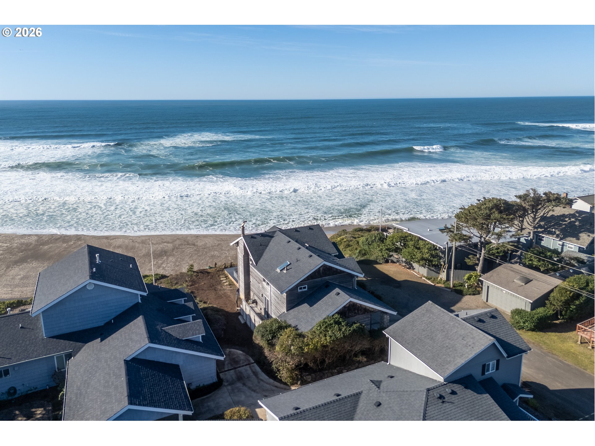 Expansive Ocean Views! 3 Primary Suites! Open floor plan, Wall of windows, Media room could be 4th bedroom. Pantry, Skylights, Granite counters, wood burning fireplace in Living room, gas fireplace in primary bedroom, Large deck w/hot tub and oversized 2 car garage.