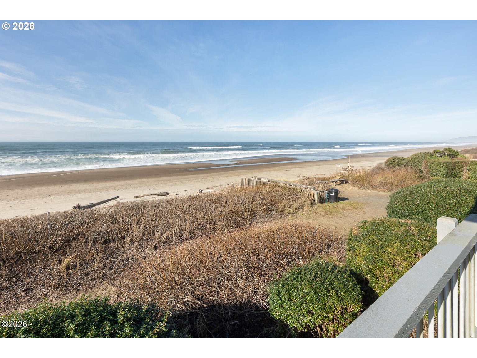 Stunning oceanfront condo in the desirable Searidge community with expansive ocean views from the living room, dining area, kitchen, and primary bedroom. This move-in-ready coastal home features cedar-plank ceilings, a gas fireplace with stone surround, and open-concept living designed to maximize natural light and views. Enjoy indoor-outdoor living with a spacious oceanfront deck accessible from both the living room and primary suite—perfect for dining, sunset views, whale watching, and coastal relaxation. The primary bedroom offers private deck access and an en-suite bath with dual sinks and a walk-in shower. A second full bathroom also includes a walk-in shower. Additional features include a dedicated laundry room with full-size washer and dryer, utility sink, instant hot water in the kitchen, a one-car garage, and ample interior and exterior storage. Beach access is just steps away, less than 150 feet from the home. Searidge amenities include a clubhouse, swimming pool, spa, and tennis/pickleball courts.