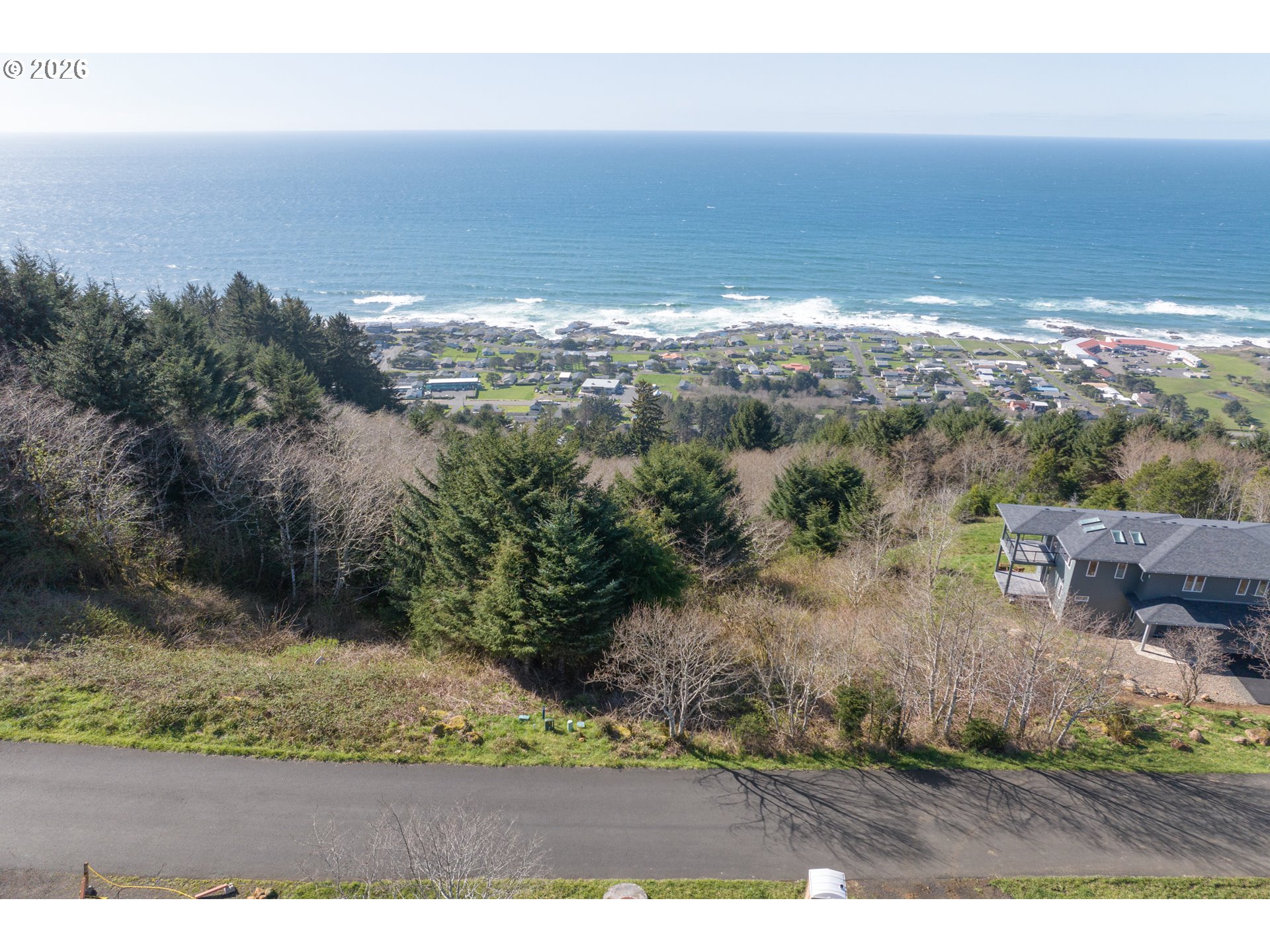 Construct your ideal residence atop the mountain with panoramic views of the Pacific Ocean, the City of Yachats, and the scenic coastline. Municipal utilities are available at the lot boundary, facilitating a seamless build process. Experience sweeping vistas and remarkable sunsets from the comfort of your future home. Situated in a quiet, established neighborhood, this property provides access from both the main road at the top of the lot and the lower cul-de-sac at the bottom. Consider this exceptional opportunity today.
