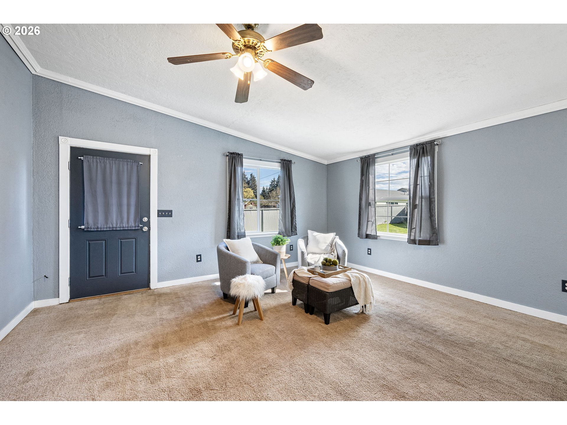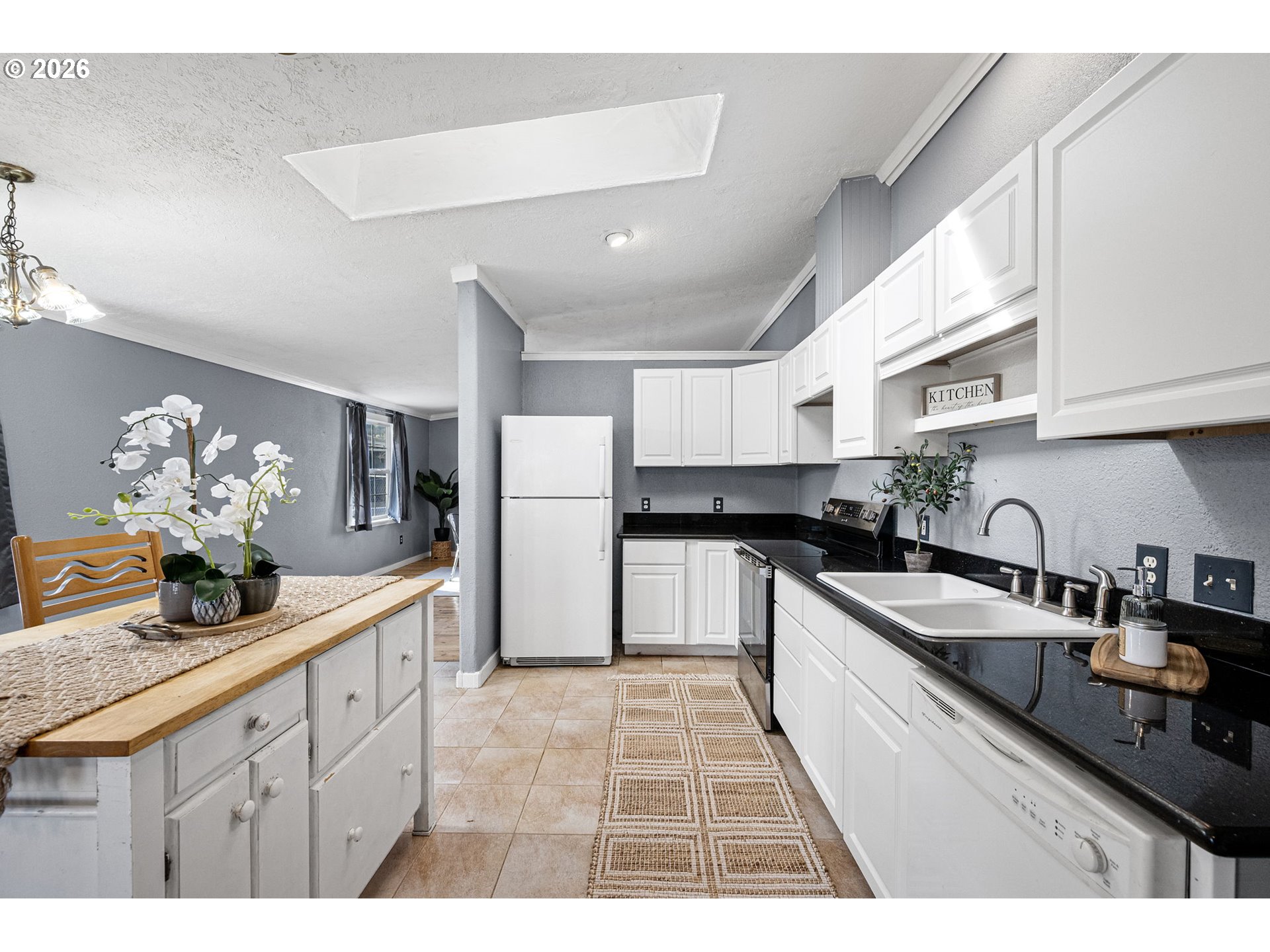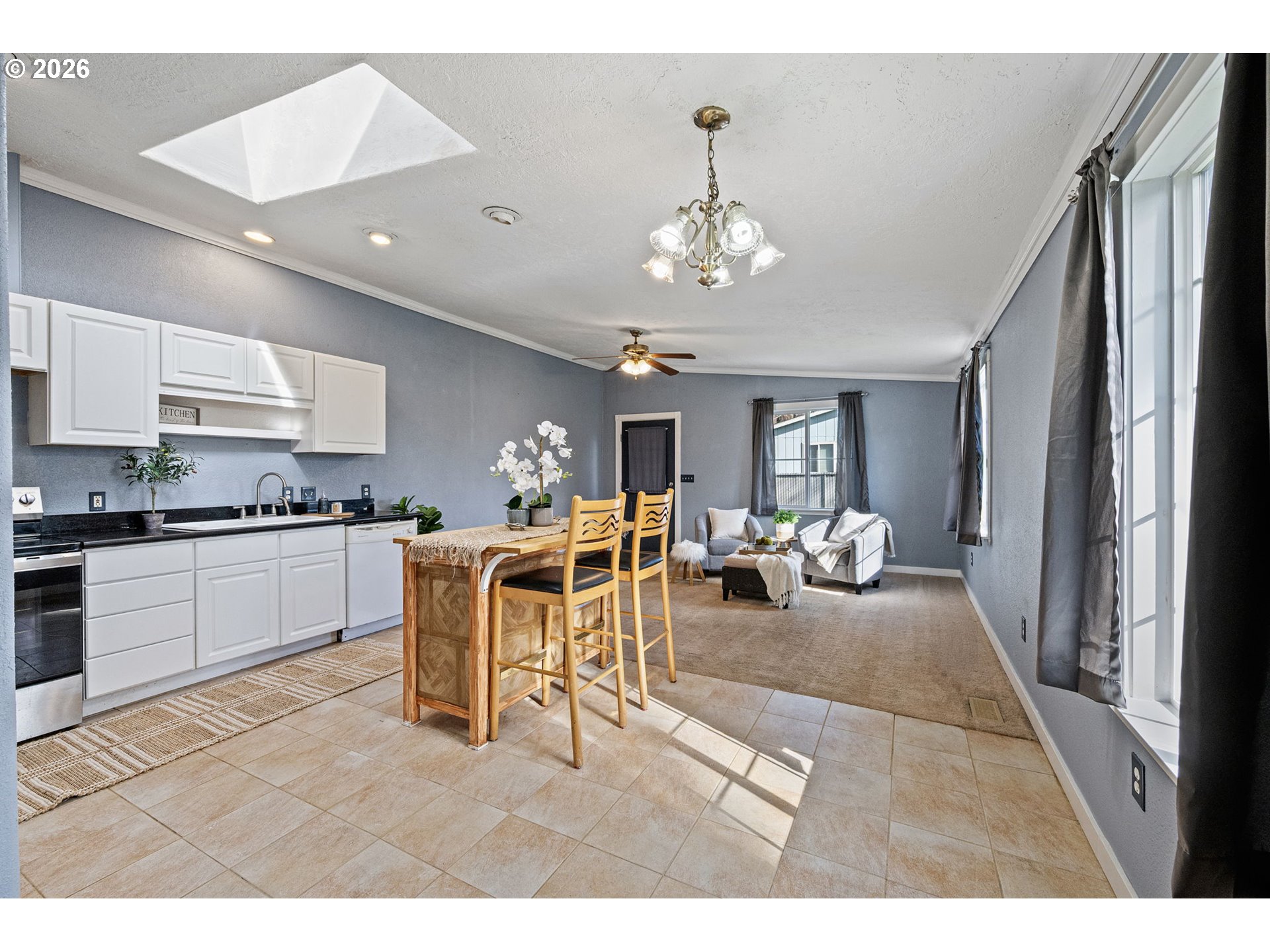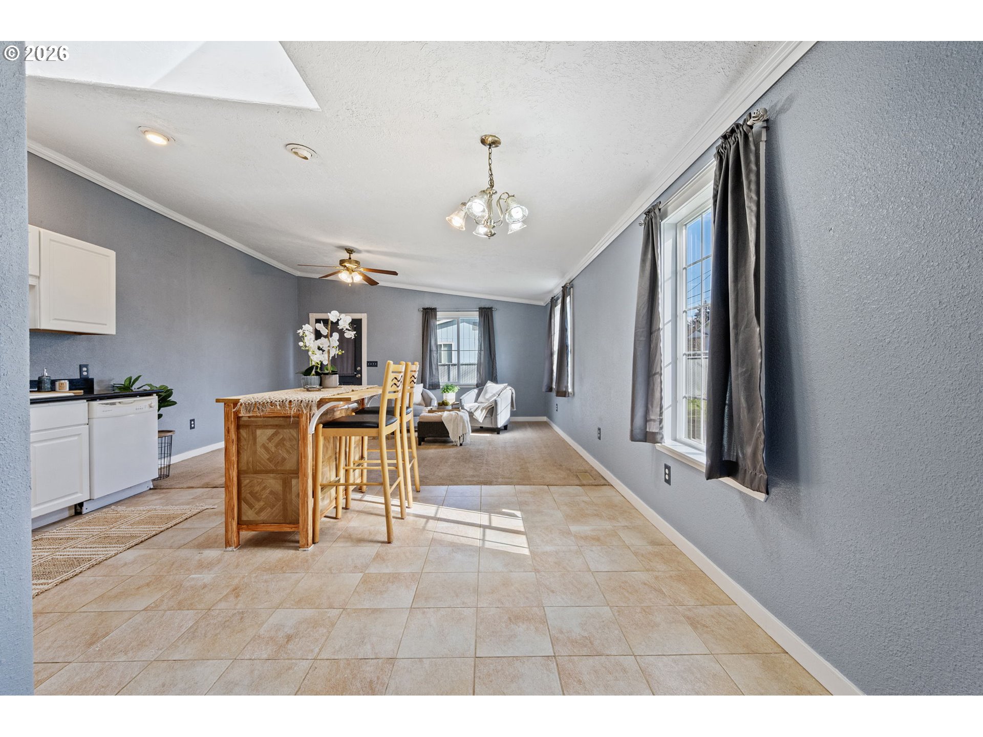 Located in a cul-de-sac in Sweet Home, this 3-bedroom, 2-bath home offers 1,476 square feet with a functional layout and great potential for a buyer ready to make it their own. Vaulted ceilings run through the living room, kitchen, dining, and family room, creating an open feel across the main living spaces. The kitchen includes quartz countertops, tile flooring, and an island with an eat bar, and connects directly to the dining and family room in a great room-style layout. The dining area has a skylight for added natural light, and the family room has direct access to the backyard. The vaulted primary bedroom includes a walk-in closet and full bathroom with a skylight. Additional features include indoor laundry, a two-car garage, wood flooring in the living room, a covered front porch, fenced yard, and back deck. Roof and fence new in 2023. A strong opportunity for buyers looking to build equity and make it their own.