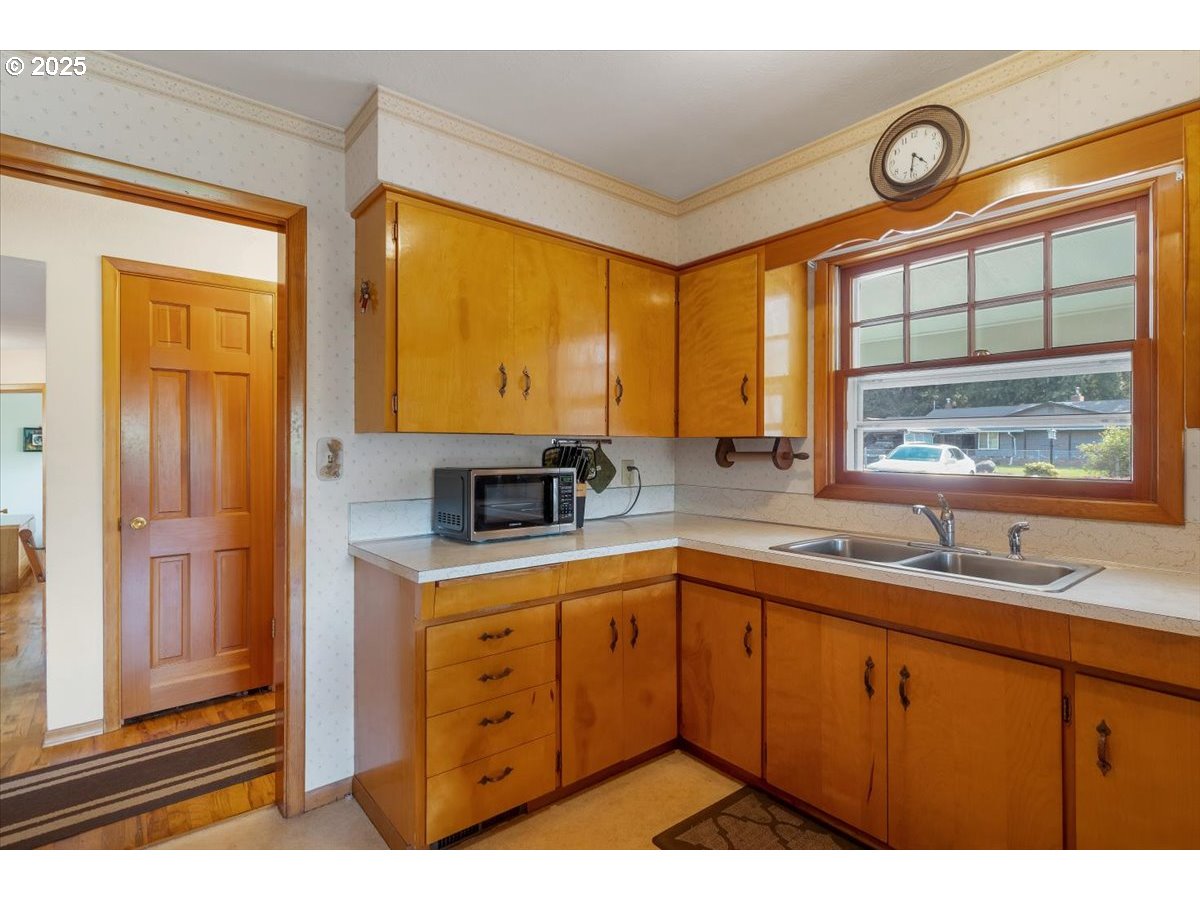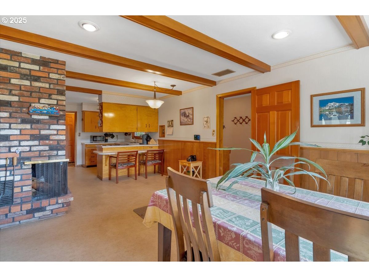 Timeless Mid-Century Ranch, including Solid Oak Floors and craftsman touches throughout. Built-in range, newer Fridge, and a warm family room with fireplace that opens to a Covered Deck, perfect for year-round BBQs. The spacious living room offers great light and a view of the expansive backyard, ideal for entertaining, gardening, or relaxing. The Mud/Laundry Room adds everyday convenience, and the garden shed keeps tools tidy. Sitting on .43 Acres, you're next door to Cheadle Lake, and the Santiam River.