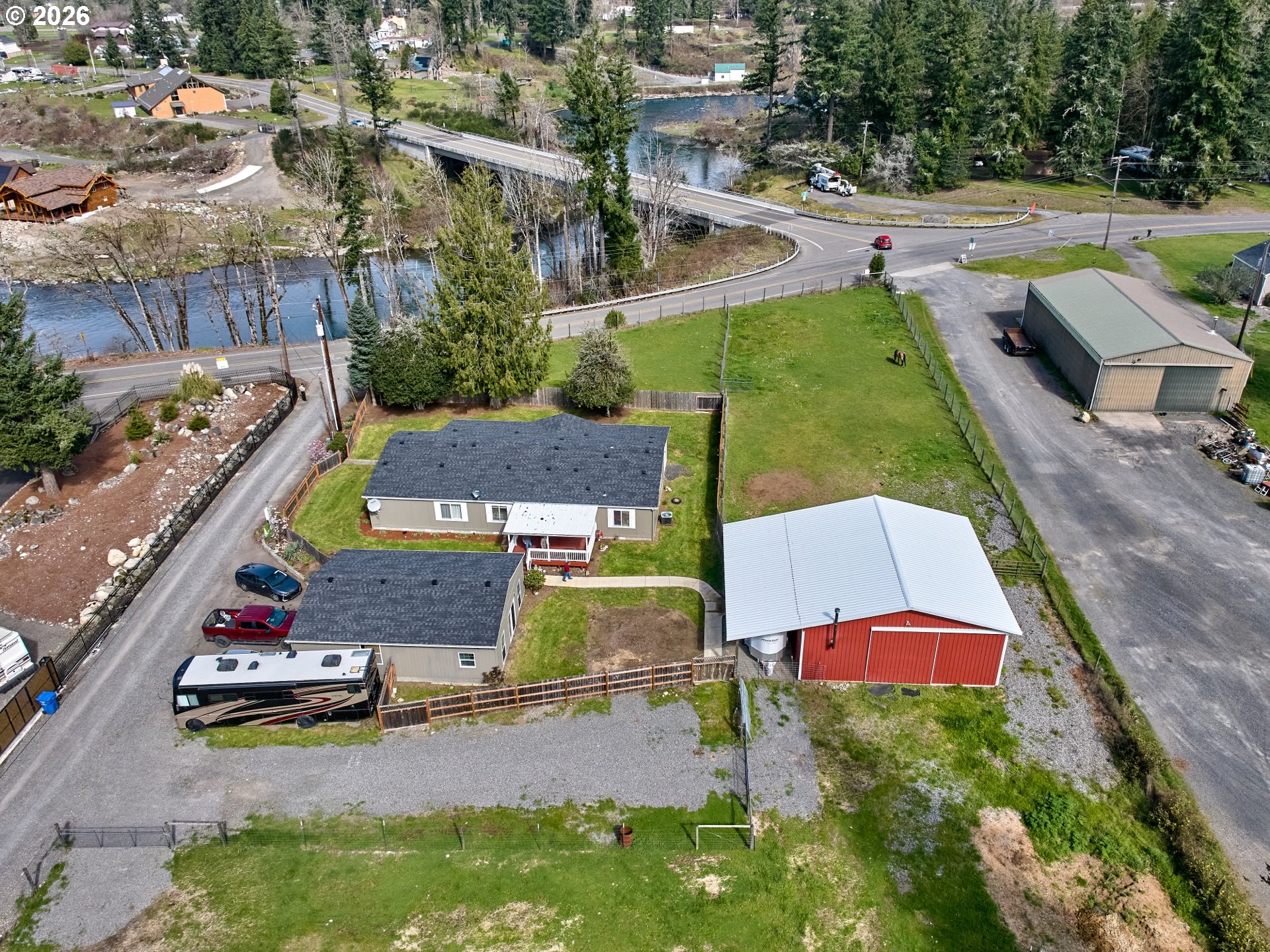Super cute home on 1.66 acres of country living property. Though it has a quiet and secluded feel, this horse property is close to town for convenience. With a 3-stall horse barn your equine friends can live cozy on site and have a beautiful pasture to roam for feed and exercise. The home has some key updates and comes furnished. The home has fresh paint inside and outside and newer laminate wood flooring and carpet. Lots of space in the kitchen with an island for extra counter space and storage. The large covered porch makes for a great private space to sit outside and smell the beautiful fresh mountain air. The home has been well cared for and is situated nicely on the property for easy access to the garage or horse barn. The barn has 3 mated stalls and a concrete floor with a nice tack room. This nice structure could easily be transformed into a spacious shop with drive through doors and an office. The property is hooked up to the public water system and has its own septic system. At about 250 feet away the North Santiam River is within earshot. The spacious and heated 2 car garage is oversized and has a heated office/storage space with built in cabinets.