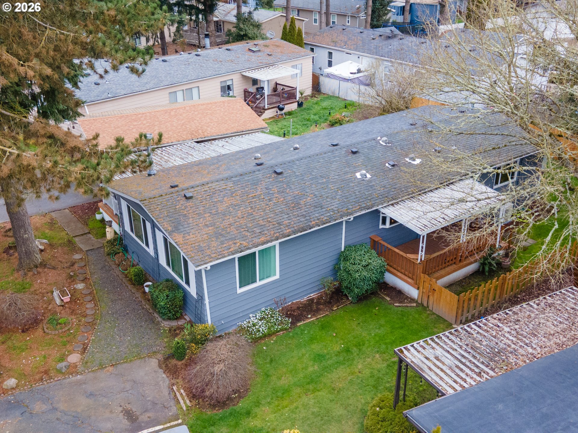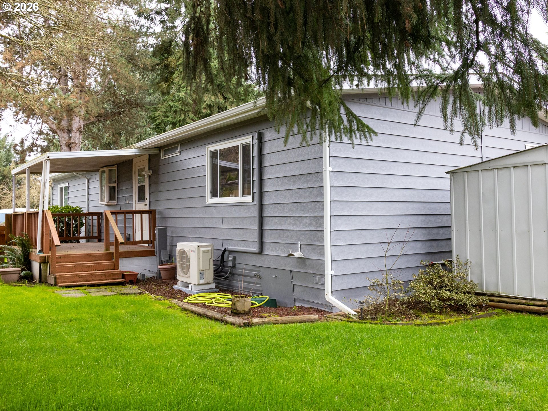 This spacious home offers two separate living rooms, a large primary suite with an ensuite bathroom, and a cozy gas fireplace for added comfort. Ductless mini splits provide efficient cooling, while stainless steel appliances add a modern touch to the kitchen. Enjoy outdoor living with two covered decks, a partially fenced yard, garden beds, landscaped grounds, and a storage shed. The property also features a carport and fresh exterior paint.Located in an all ages, pet friendly park with community amenities including a playground and BBQ area. Conveniently situated minutes from town, offering the perfect balance of small town living with access to nearby city conveniences.