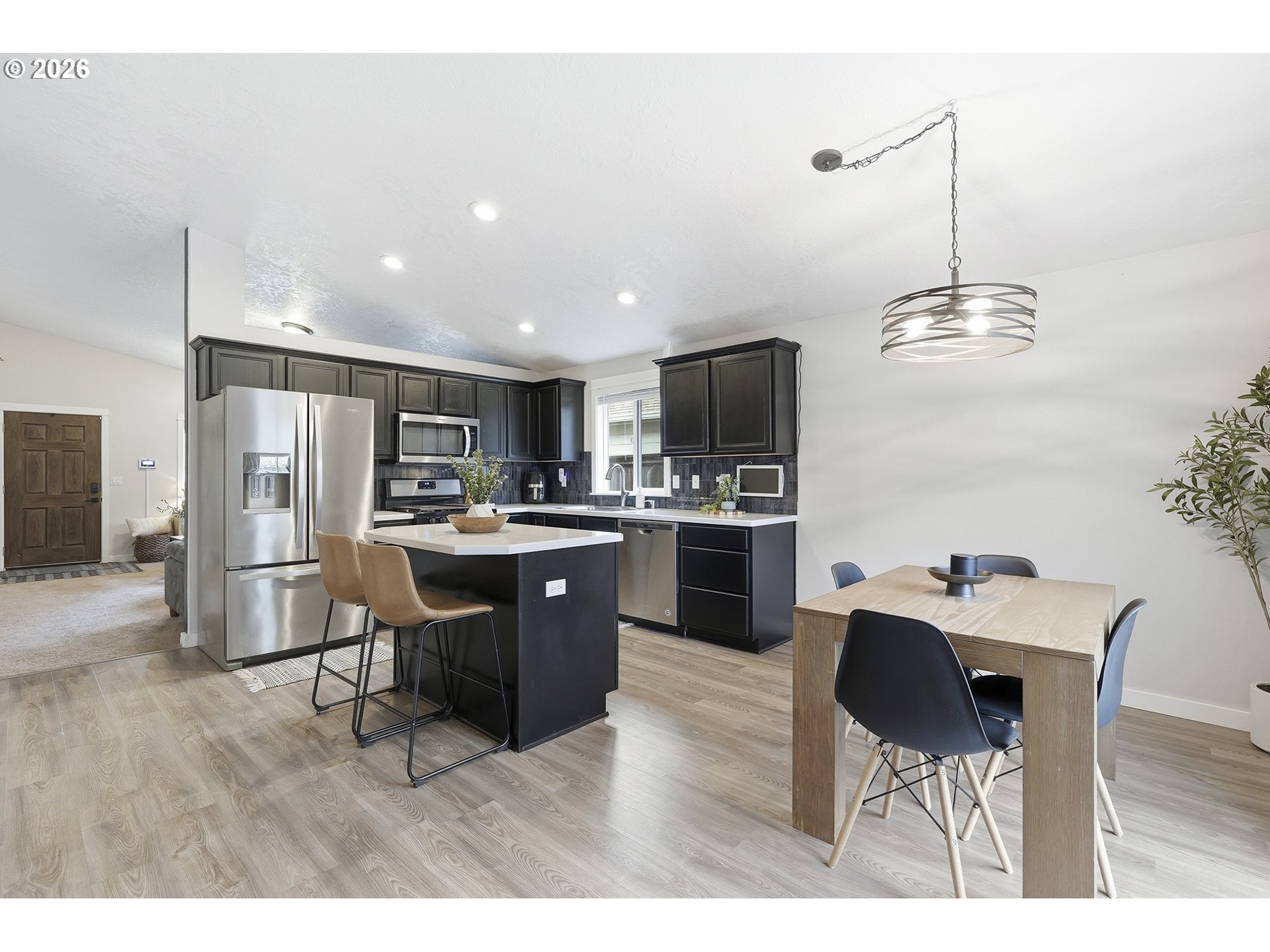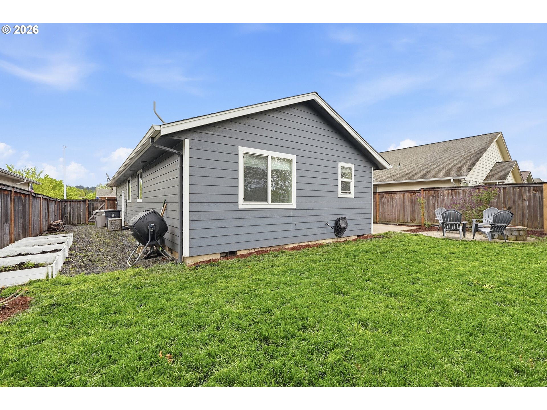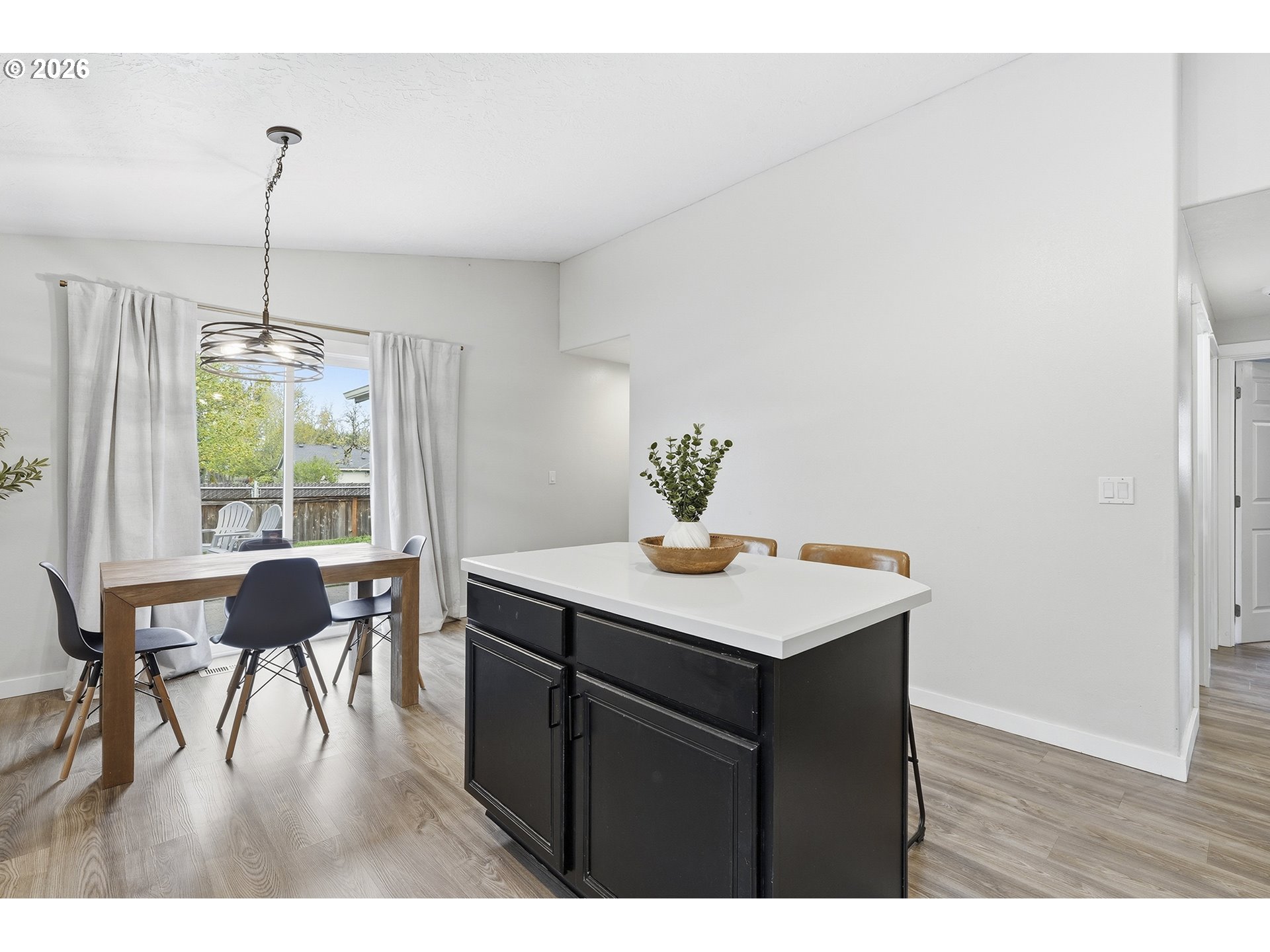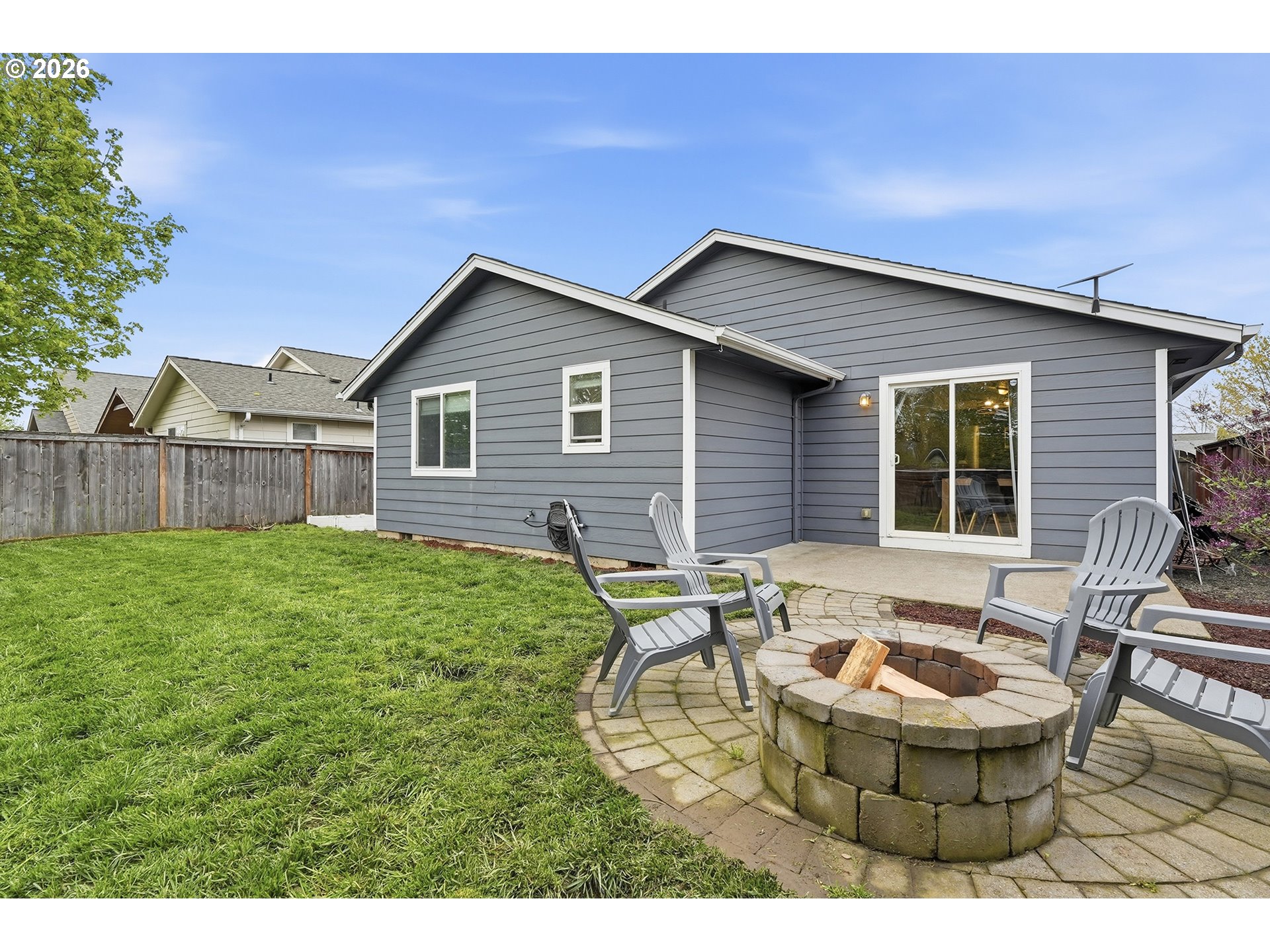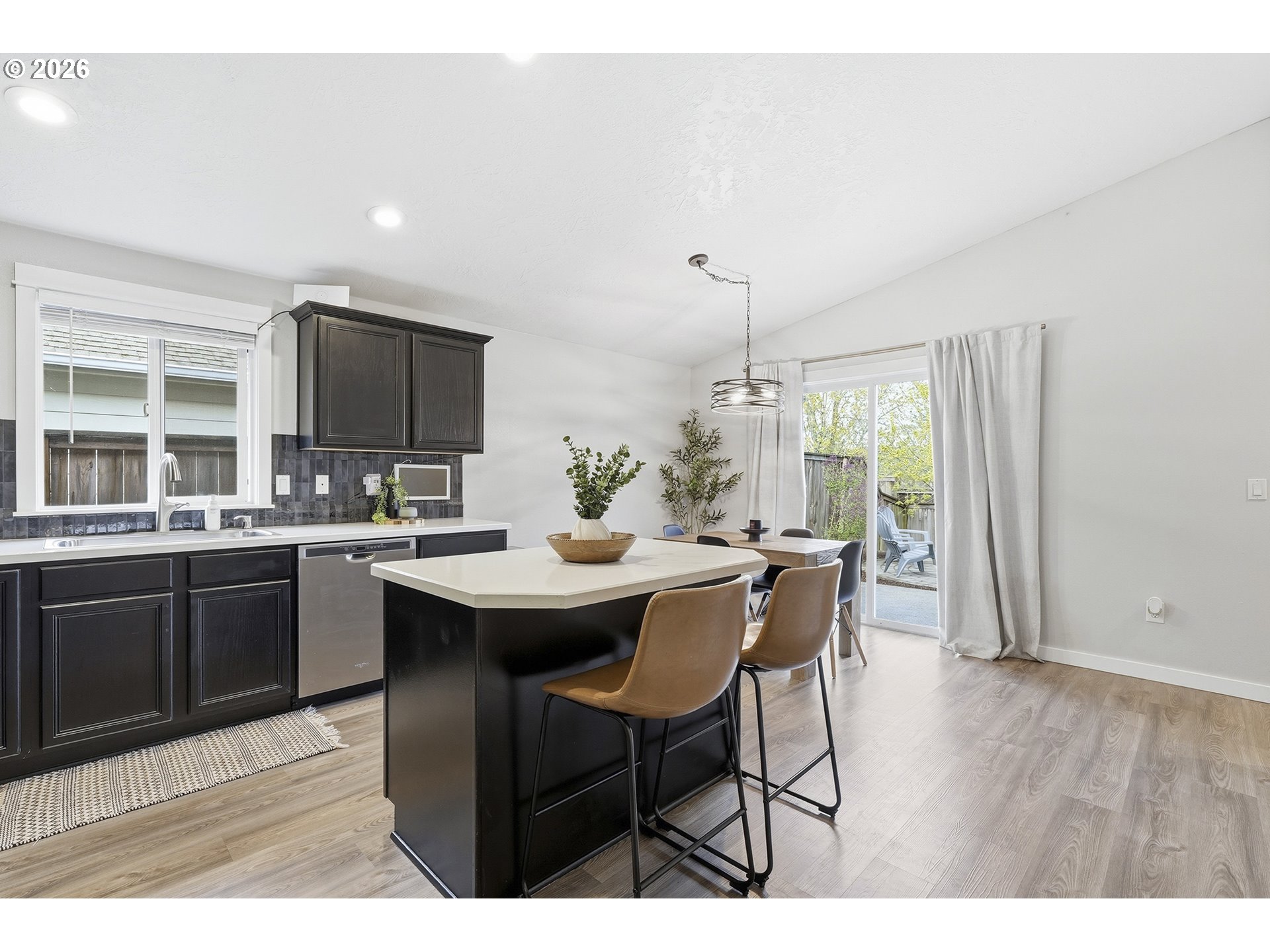 Immaculate modern ranch home set on 0.12-acre lot in North Albany, offering effortless one-level living with space to relax or entertain. This thoughtfully designed home features 3 bedrooms and 2 fully updated bathrooms, along with a spacious living room anchored by a cozy gas fireplace, and new LVP flooring installed in 2025. The kitchen is both functional and inviting, with abundant counter and cabinet space, island with storage, built-in microwave, stainless-steel appliances, gas stovetop, ambient nighttime mode lighting and more. Just off the kitchen the dining area includes a pantry and seamless access to the patio and backyard living space. Step outside to a peaceful fully fenced yard, designed for both relaxation and enjoyment-complete with a patio, custom pavers, fire pit, raised garden beds, and generous lawn perfect for games or pets.
