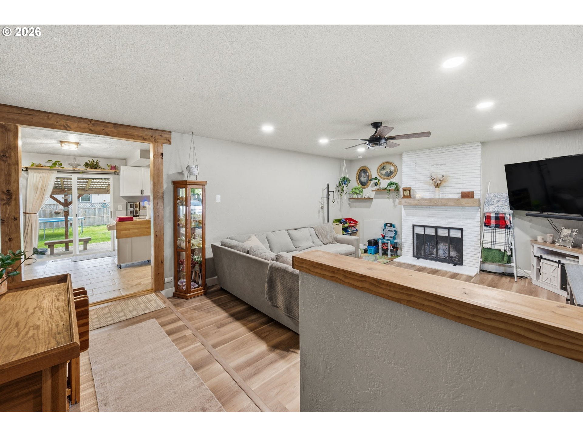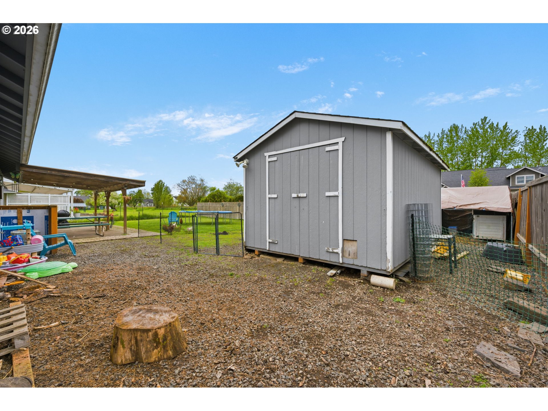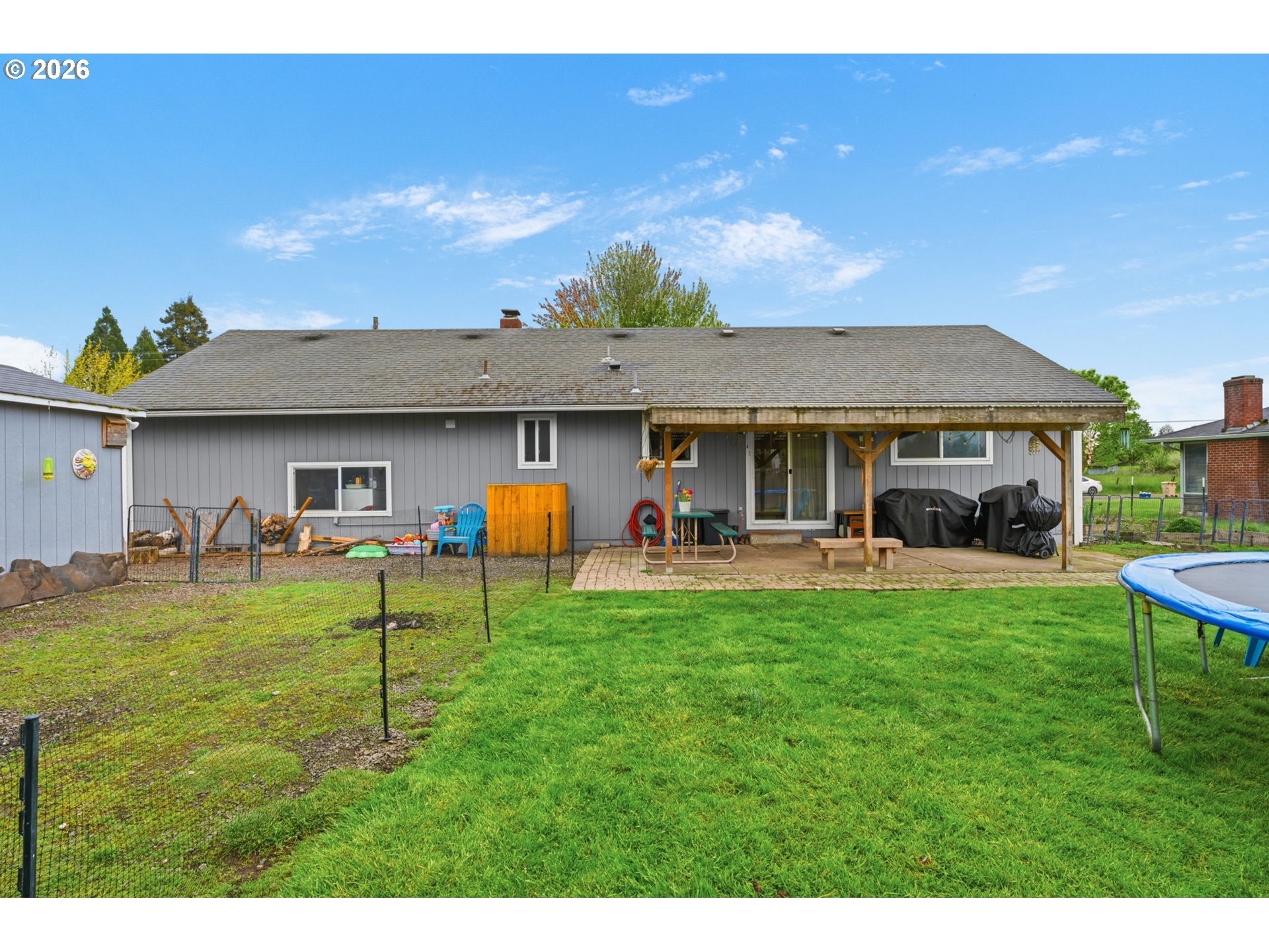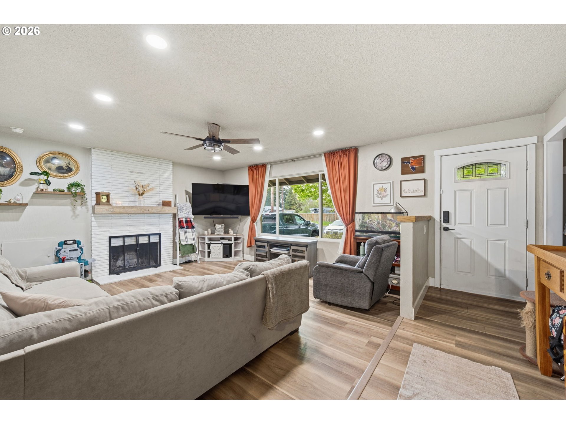 Welcome to this charming country-feel property situated on nearly a 1/4-acre lot in Harrisburg! This spacious 4-bedroom, 2-bath home offers a versatile layout with great separation of space—featuring two bedrooms upstairs with a cozy den-like ambiance, and the owner’s bed plus an additional bedroom conveniently located on the main level.Step into the inviting living room, complete with a warm fireplace highlighted by a floor-to-ceiling brick accent and a ceiling fan for year-round comfort. The kitchen is both functional and stylish, offering granite countertops, stainless steel gas appliances, tile flooring and built-in features. Enjoy peaceful views from the kitchen window while watching kids or pets play in the backyard.The dining area flows seamlessly with the kitchen and provides direct access through a sliding door to a spacious covered patio—ideal for indoor-outdoor living. The lower-level bathroom has been tastefully updated with modern finishes, including quartz countertops. The owner’s bed features a double closet and a stylish accent wall with a sliding barn door.Outside, you’ll find a large, fully fenced backyard designed for enjoyment and functionality. Host summer BBQs on the expansive covered patio, take advantage of the large storage shed and dedicated gardening area with raised beds. There’s even room for RV parking.Located just minutes from local schools, parks, and dining, this home also offers easy access to the Harrisburg Boat Ramp—perfect for enjoying time on the Willamette River.Don’t miss this opportunity to enjoy space, comfort, and a touch of country living!