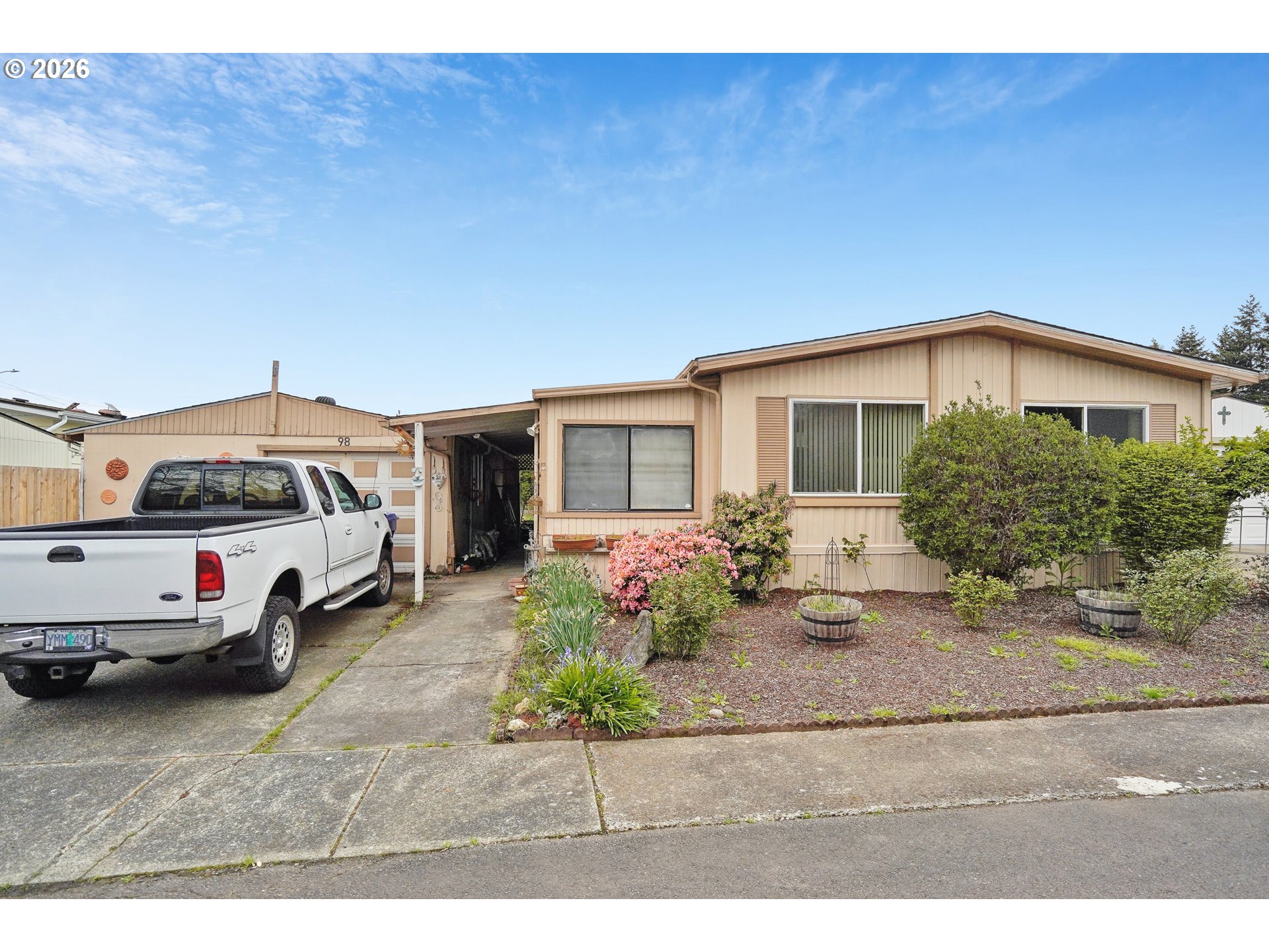 Live life at your pace at Wildwood Villa! Spacious floor plan gives separation while feeling open. Recently replaced, the large living room windows bring in an abundance of natural light. Built in hutch provides ample storage while adding character. Primary offers a large closet and ensuite has step in shower with folding bench for accessibility. Outdoors, you’ll find a gardener’s dream backyard! Complete with multiple raised beds, trellises, and mature landscaping, the yard offers privacy and the potential to truly shine with a little care and vision. The covered porch is cozy and adds extra living space while the attached garage has extra storage. Take walks around Staats Lake, or play a round of golf next door at the McNary Golf Course. Park amenities include a spacious clubhouse with a pool table and kitchen, a swimming pool and laundry facilities. Shopping, restaurants, theaters, hospitals, doctors, and more are all nearby. This affordable home is ready for your personal touches.