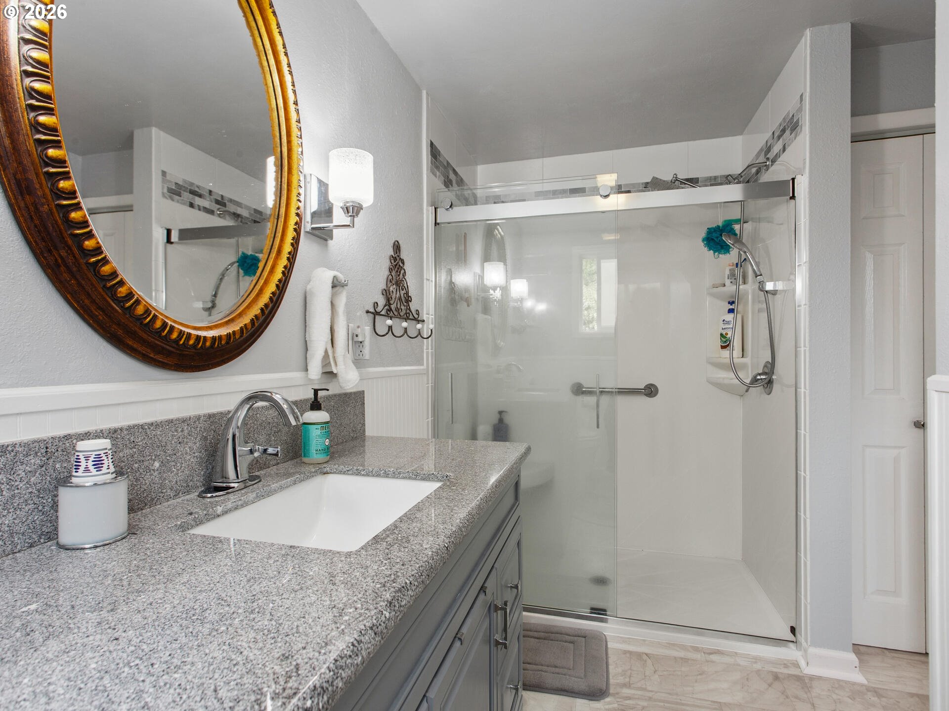 (503) 893-8874Stunningly crafted customized ranch, on Master Gardiner Designed and Landscaped Property, Overlooking Tree Lined Views and Golf Course on the 14th Tee Box! Expertly designed, custom remodel, with carefully selected finishes throughout. Enter welcoming front hallway to light and bright entry, featuring engineered hard wood, and front reception and living room, overlooking beautifully manicured front landscaping. Fireplace with brick finish and custom mantle, perfect for gathering, or simply enjoying nature next to a cozy fire. Remodeled kitchen with stainless steel appliances, solid surface granite countertops, window overlooking front views, custom cabinetry with hand crafted stained glass display panels. Kitchen connects to an open living space, with vaulted, exposed wood paneling and beams, complete with dining area and cozy sitting area with a fireplace. TV room/bonus area/game or reading room, boasts a statement feature fireplace with custom shelving, plenty of space for cozy seating, and enjoying leisurely activities. Utility room with sink, large pantry, and storage. Primary Bedroom with on suite remodeled bathroom and French doors leading to hot tub area. Outdoor area is a nature, golf lovers, landscapers dream! Designed and manicured by Master Gardiners, the yard features a full outdoor kitchen, exposed wood, vaulted patio covered patio, and fan with seating area, hot tub, waterfall, pond, gardening beds, all overlooking the tree lined view of golf course! Garden includes 5 raised garden beds, 140 blueberry plants, producing 1,000 lbs per year u-pick, 9 fruit trees, asparagus, and a variety of grapes. Outbuildings galore make for a hobbyist's dream! 576 sq ft detached garage, 36x28 ft shop, complete with work benches, built ins, electricity, and wood stove for heating, 24x36ft RV shed, 16x12 ft tractor building, and 8x16 wood shed, 8x12ft greenhouse.27 solar panels 1t 327 watts, for an est.11,478 kw per year. Backup energy with gas generator.