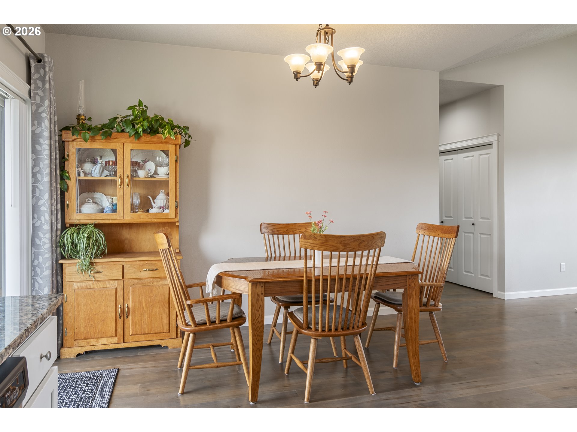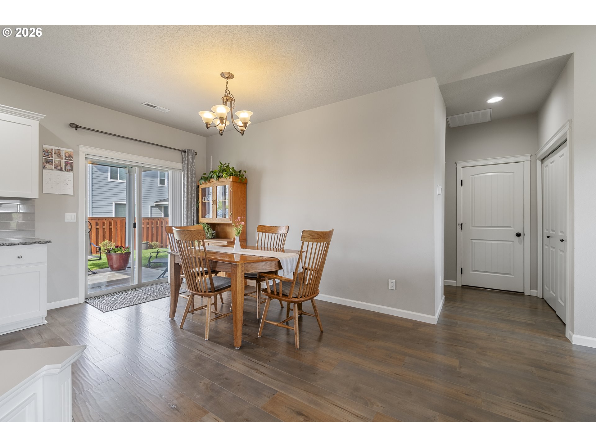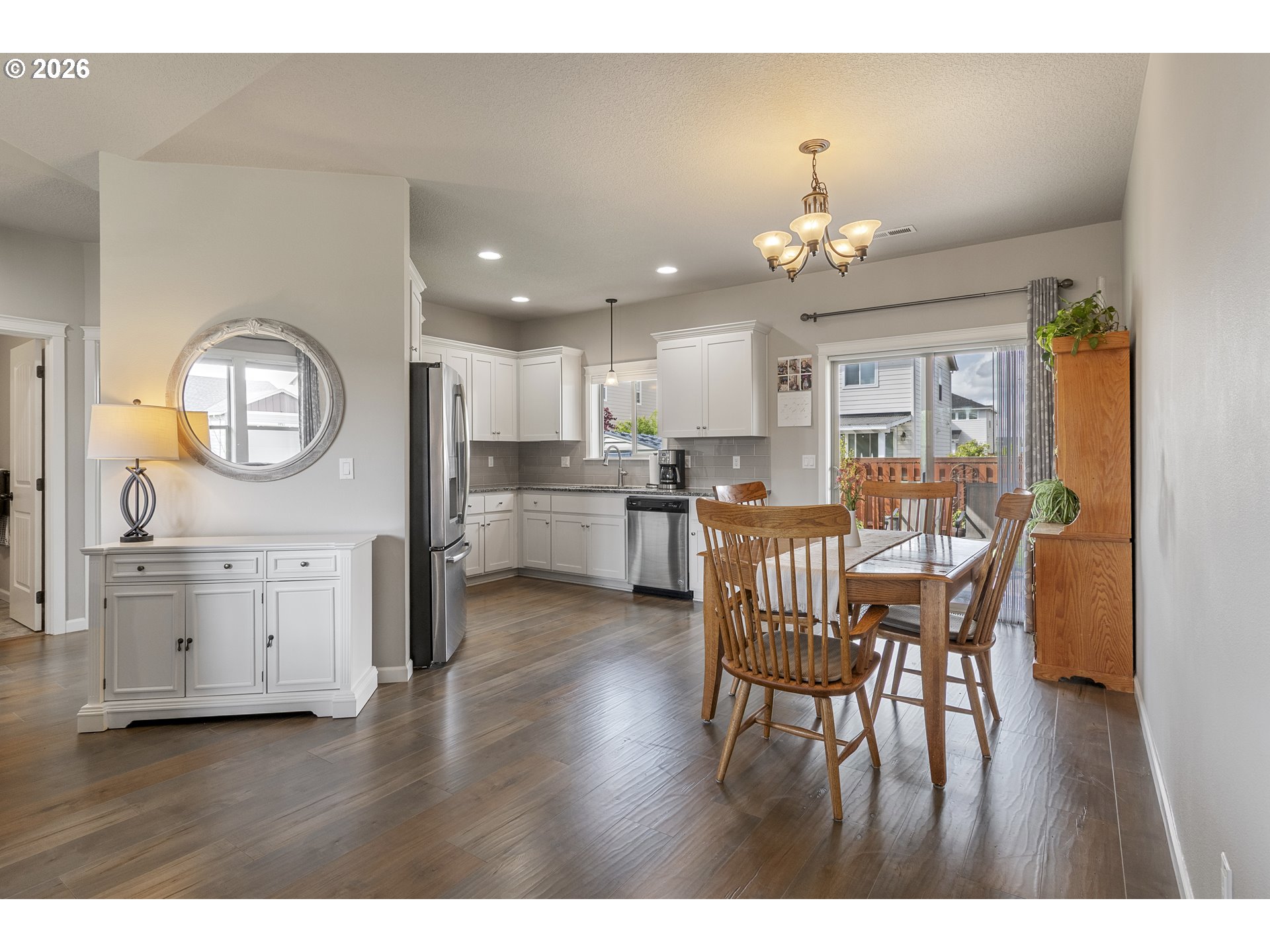 This well-maintained 3-bedroom home was built in 2019 and offers 1,365 sq ft with a functional open-concept layout. The main living area includes vaulted ceilings and gas fireplace which flows into the dining space and kitchen, creating a connected setup for everyday living. The kitchen features beautiful cabinetry, and generous countertop space, along with matching stainless steel appliances. The primary suite includes an attached bathroom, and the additional bedrooms provide flexible space for guests, office use, or hobbies. The home also includes an attached 2-car garage and a fully fenced backyard perfect for entertaining with covered and screened patio, hot-tub, play space, and gardening. Convenient Woodburn location close to shopping, dining, parks, schools, and easy access to I-5 for commuting north toward Wilsonville/Portland or south toward Salem.