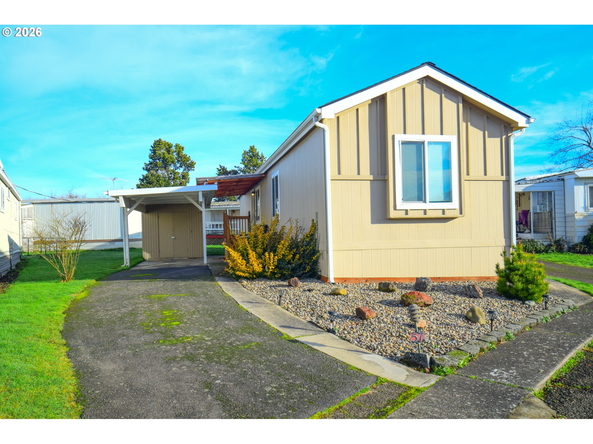 Lovingly cared for manufactured home in Woodburn Mobile Estates 55 and over community. This beautiful home is move-in ready. It features an open, airy floor plan with cathedral ceilings throughout and plenty of natural light. Small storage shed at the back of the driveway for all your yard care tools, etc.
