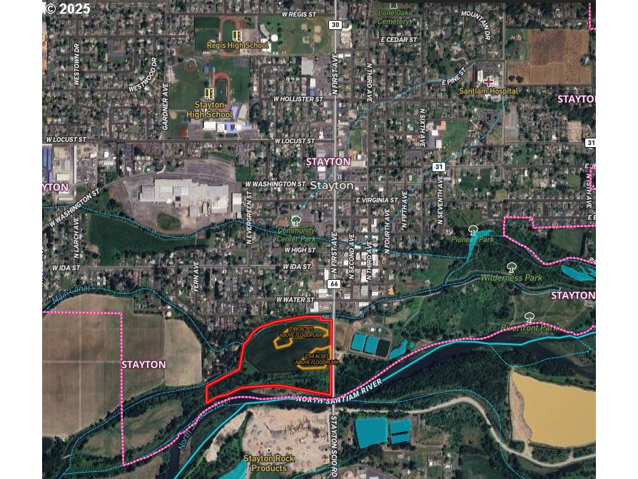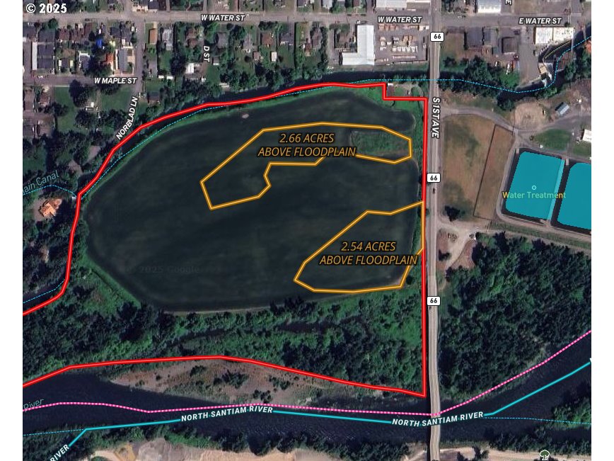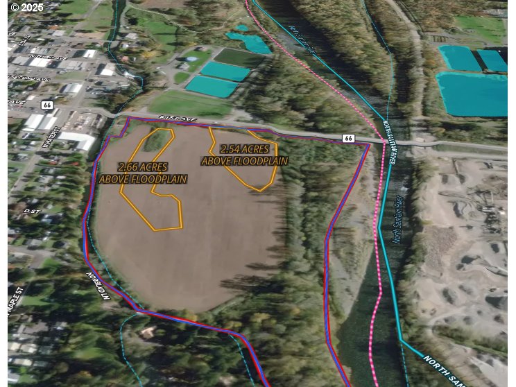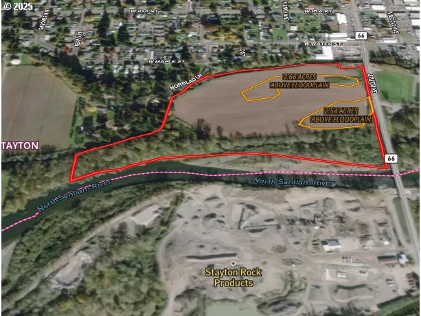 Rare riverfront development opportunity! This 30-acre development property bordered by the Mill Race on the north and the North Santiam River on the south offering approx. 20 developable acres, with 5 acres above the floodplain. Potential for borrow and fill calculations to include the "borrow" calculations from the aggregate quarry across the river. Explore a zone change for higher density or optimize margins with low-density development. Endless possibilities in a prime location for riverfront homes!