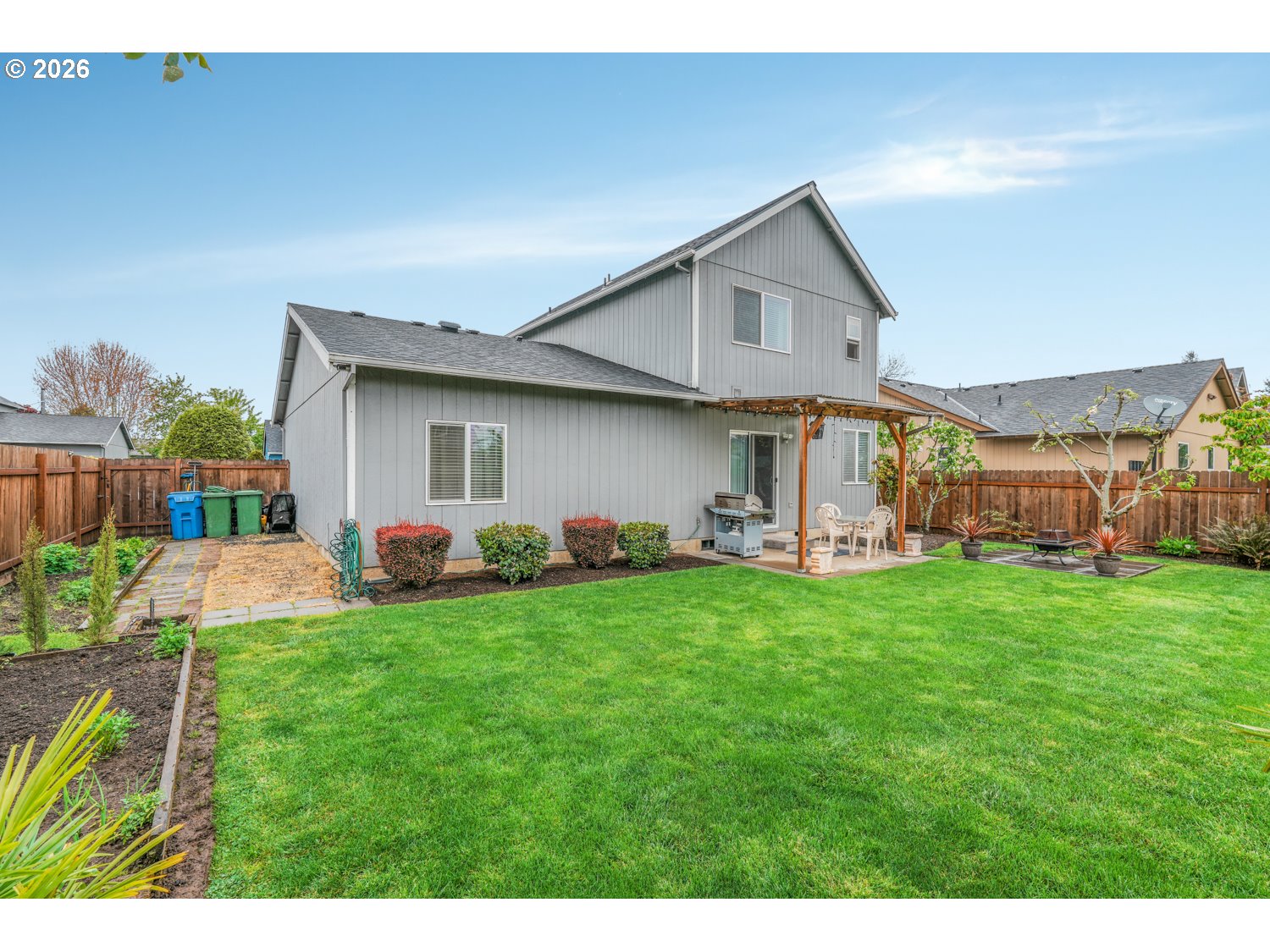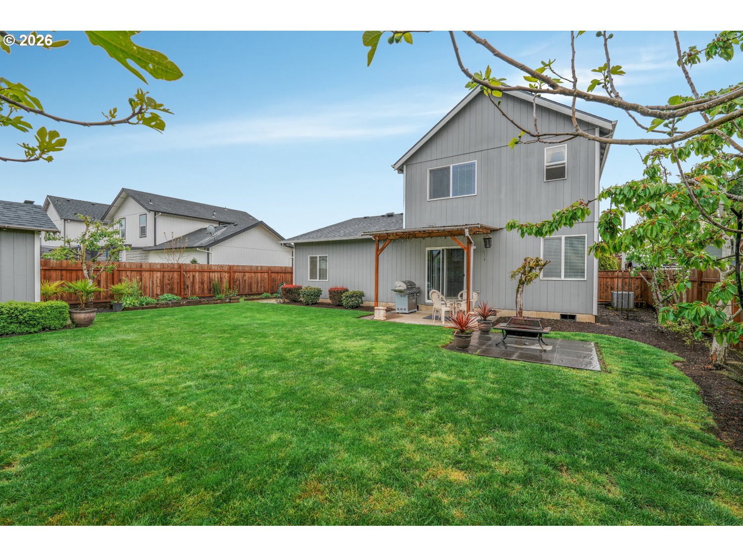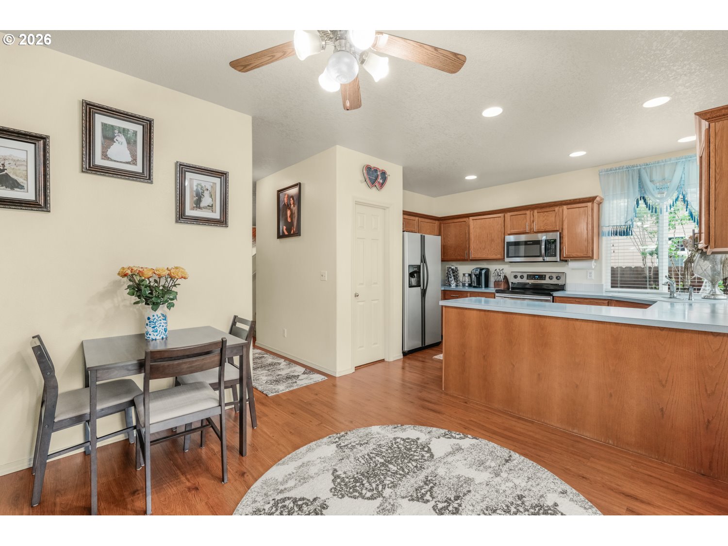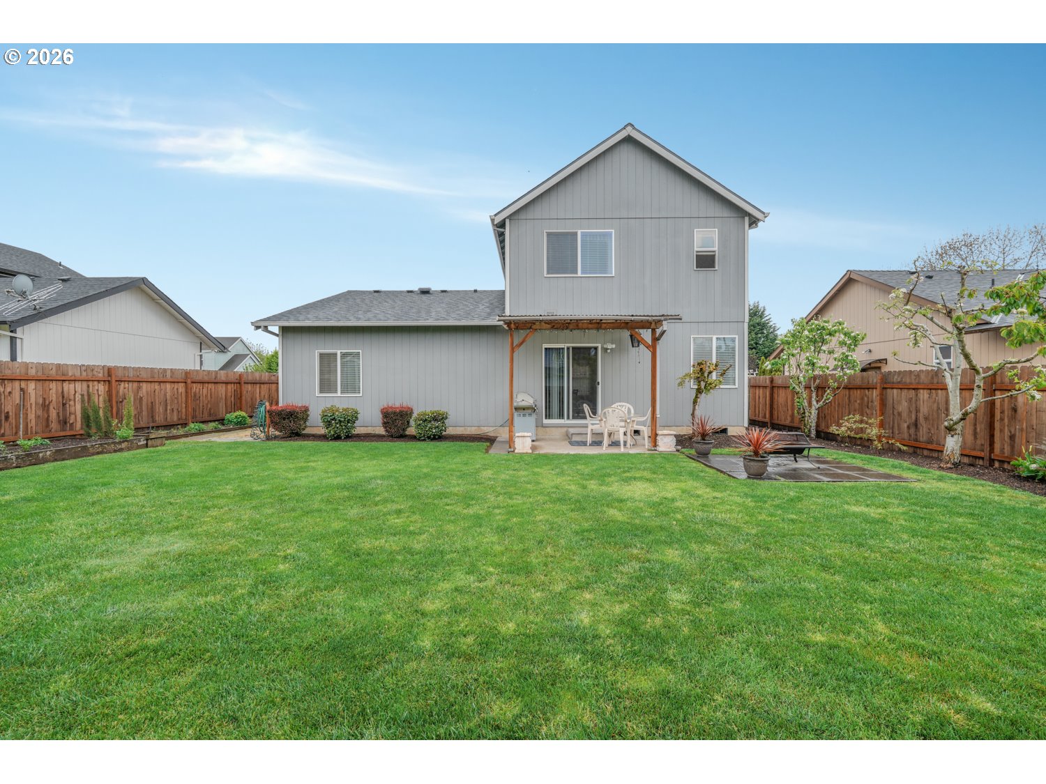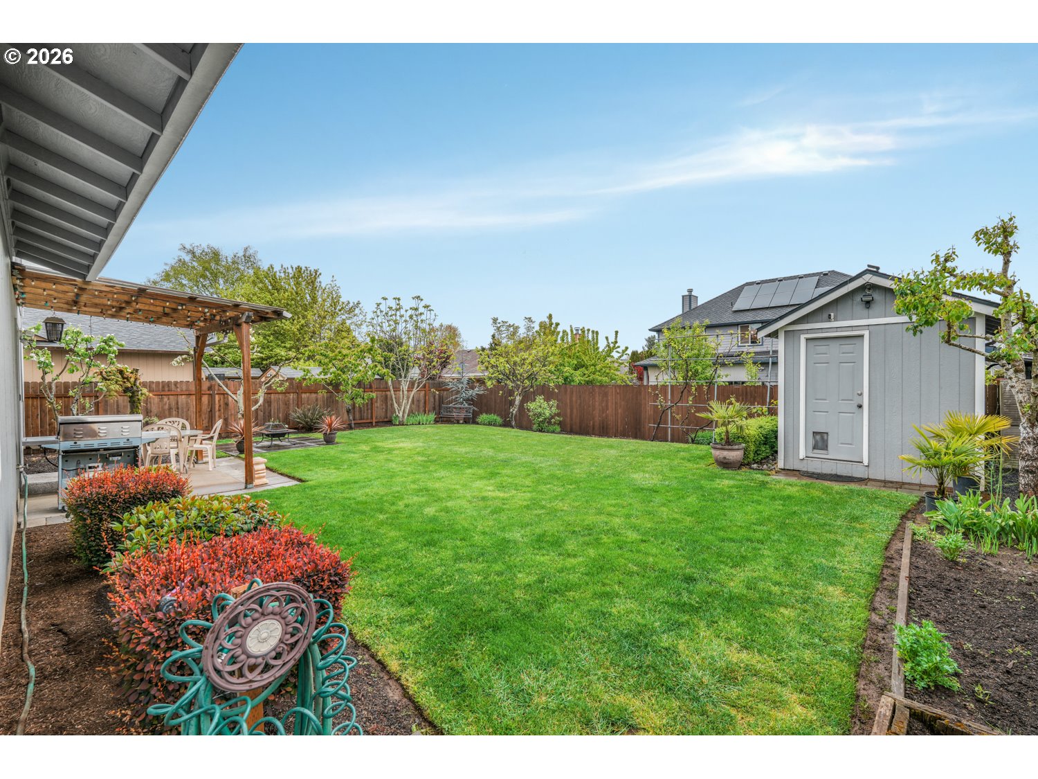 Welcome to this beautifully maintained 3-bedroom, 2.5-bath home offering comfort, space, and timeless charm. With soaring 9-foot ceilings and warm laminate flooring throughout the main living areas, the home feels bright, open, and inviting from the moment you step inside. Enjoy the flexibility of both a formal living room and a spacious family room for entertaining guests or relaxing with loved ones. The kitchen is thoughtfully designed with stainless steel appliances and a pantry for extra storage, all flowing seamlessly into the dining area that opens to the covered patio. Upstairs, you’ll find generously sized bedrooms, including a primary suite with its own private half bath. The home has been well cared for, with a brand new roof providing peace of mind for years to come. The private, fully fenced backyard is an ideal setting for outdoor living. Whether you're gardening, enjoying fresh fruit from your own trees, or hosting gatherings under the covered patio, this space offers something for everyone. A tool shed adds convenience, while the front landscaping with palm trees creates welcoming curb appeal.Located just minutes from parks, golf courses, shopping, and schools, this home combines everyday convenience with a peaceful neighborhood setting.
