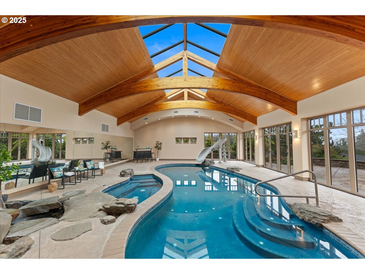 (503) 893-8874Exquisite 5960sf luxury estate on a private 2-acre hilltop with sweeping mountain views. Elevator-accessed floors, gourmet kitchen, soaring great room with two-sided fireplace, opulent primary suite, and expansive view decks. Full daylight basement includes full bath, living & flex space. Resort yard boasts 1985sf pool house with in-ground pool, slide & spa, plus a matching 1978sf shop with RV bay. Oversized 3-car garage, central air, vacuum, and gated entry. Timeless elegance in Mt Kuebler Estates.