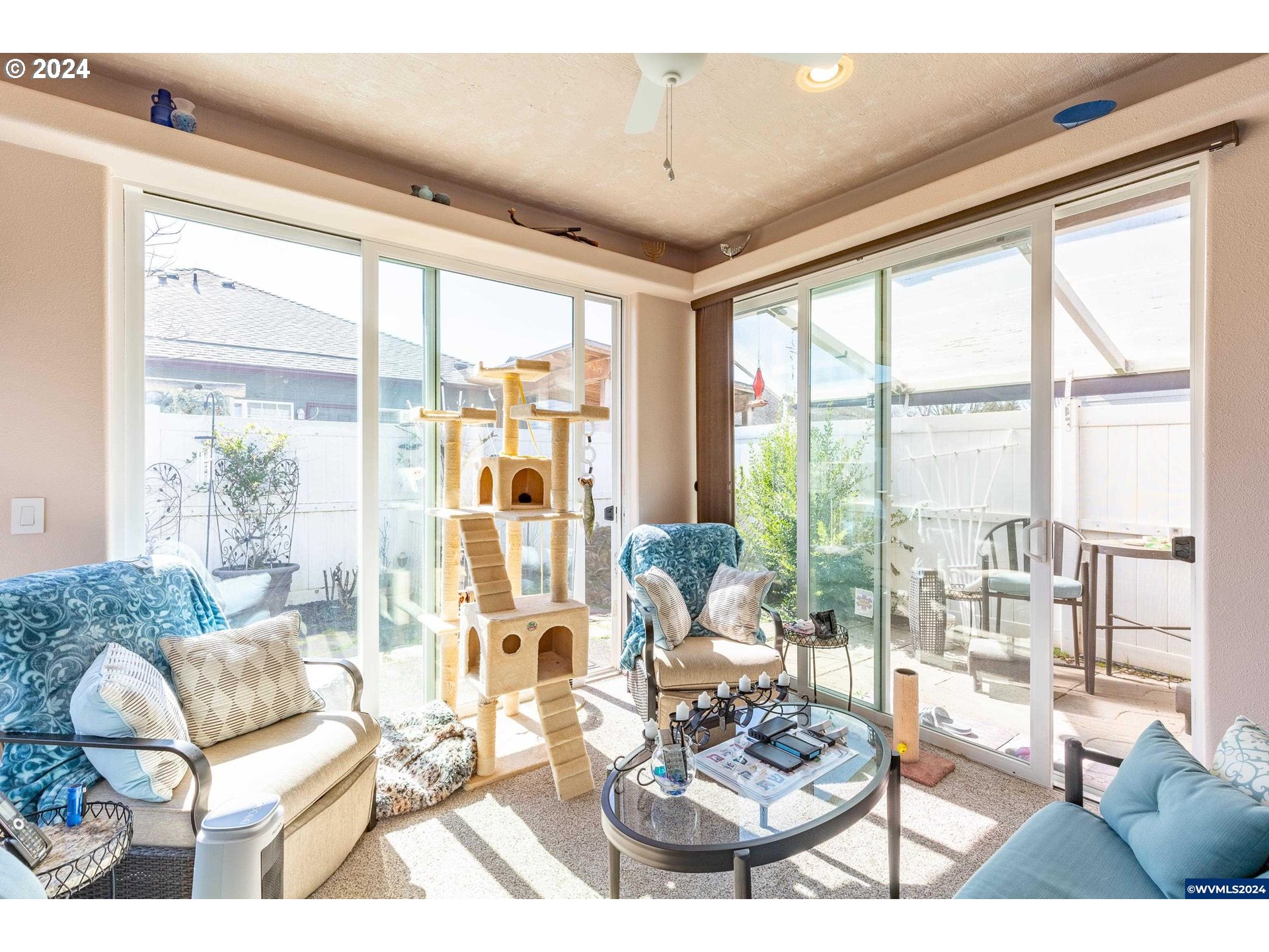 ** Assumable 2.25% VA loan, pay off $265k, possible low closing costs** Efficient ADA-accessible single-level home in Jan Ree boasts pride of ownership. High-end finishes, 3-pane windows, insulation, solar panels, instant hot water, and silent floors ensure comfort. The formal living space features soaring ceilings and a fireplace. Deluxe primary suite offers a walk-in closet, separate shower, and a dual-sided fireplace. A bright sunroom allows enjoyment of Oregon's seasons.