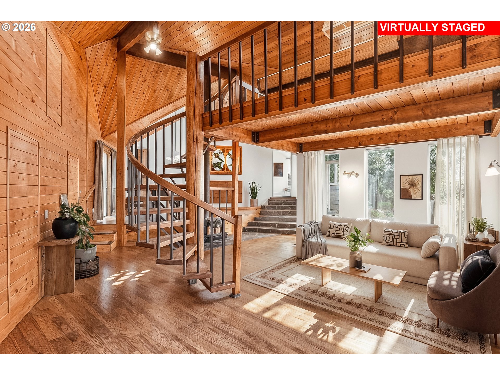 (503) 893-8874Set on a private half-acre property this one-of-a-kind home blends rustic farmhouse warmth with distinctive architectural design and modern updates. Vaulted pine plank ceilings, wood-cased windows, and hardwood floors across the main level create a rich, inviting character, while engineered hardwood floors continue throughout the upper level. Enjoy beautiful views of Mount Hood and the city from multiple vantage points. The spacious living room features hardwood floors, a wood stove, and direct access to a relaxing sauna. The kitchen combines charm and function with a copper sink, tile floors, stainless steel appliances, pantry, breakfast nook, and a stained-glass serving window that opens to the dining area. The main level includes two bedrooms (or bedroom + office), including one with a wood-burning fireplace, plus a laundry room with built-in storage. A beautifully crafted spiral staircase leads to a separate loft space tucked into its own section of the home and ideal for a studio or creative workspace. In the main upper level, you’ll find a second loft area with city views, along with the primary bedroom featuring double closets (including a walk-in with organizers) and an additional bedroom. The detached exterior flex space with power adds exceptional versatility, ideal for a future ADU (buyer to verify), guest quarters, home office, gym, or dedicated studio. Combined with the expansive patio, covered carport, room for a hot tub pad, and generous yard, the property is perfectly suited for indoor-outdoor entertaining or multi-generational living. Recent updates include a new furnace and A/C (2019), roof (2015), water heater (2022), and washer/dryer (2021). Conveniently located just minutes from stores, shopping, dining and easy access to I-5, this property offers privacy, personality, and versatility in a rare setting.
