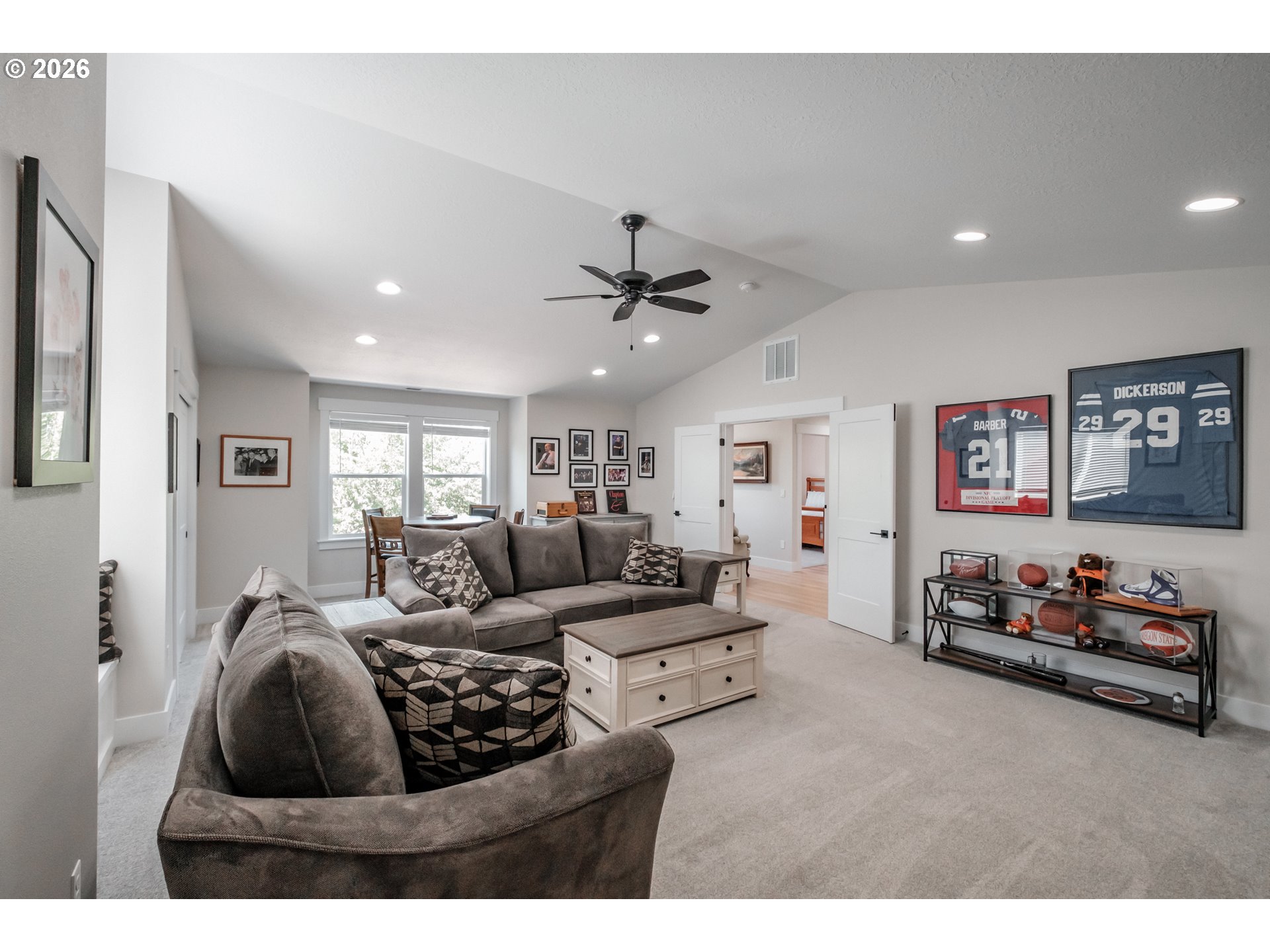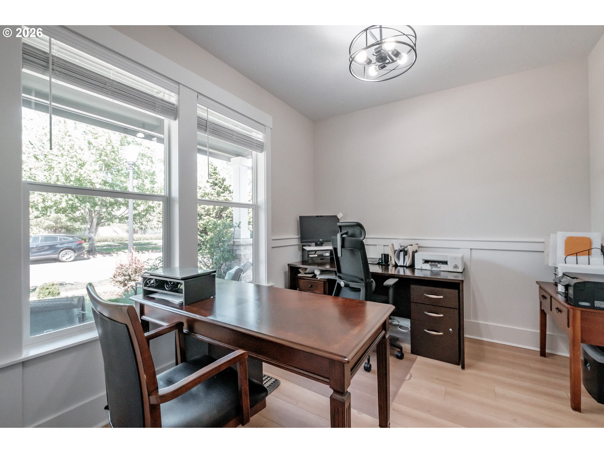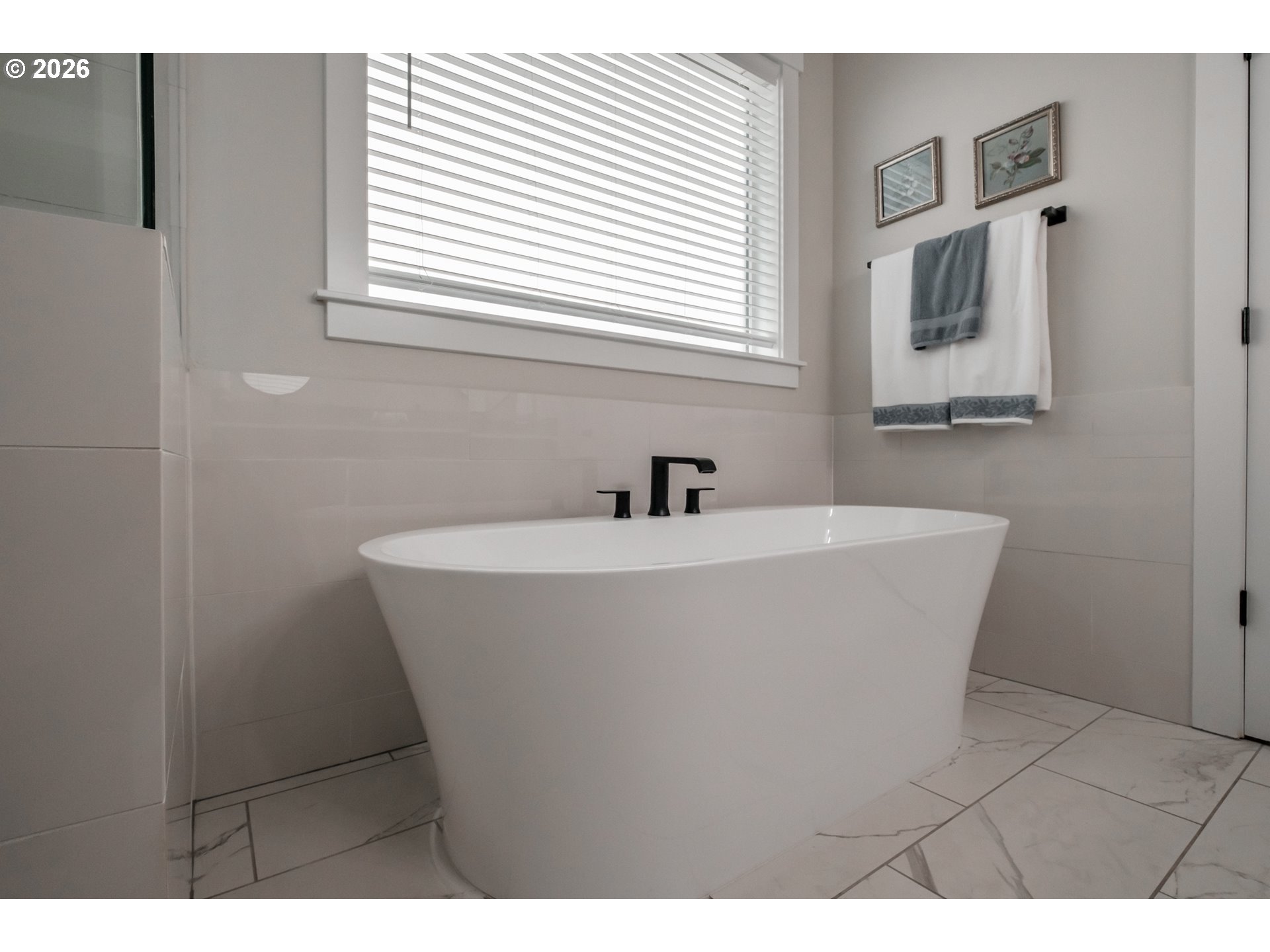 Exceptional custom-built home in Tukwila Estates, ideally positioned on the 9th fairway of this prestigious OGA golf course community with wide open views and a true resort style setting. Light filled great room with dramatic wood beams, expansive windows and a floor to ceiling stone gas fireplace. Gourmet kitchen with quartz counters, large island, subway tile, GE Café S.S appliances and pantry, open to the main living space and designed for entertaining. Dining area opens to an extended covered patio with recessed lighting overlooking the fairway and a beautifully maintained, usable backyard. Main level office and spacious primary suite with vaulted ceiling and custom accent wall. Spa inspired primary bath with dual vanity, freestanding soaking tub, oversized glass walk-in shower and closet with built in dressing vanity. Upstairs offers a large media, additional bedrooms and an updated secondary bath. Dual climate control for each level, custom window coverings and finished garage with extra storage. HOA maintained landscaping, clubhouse, community pool, walking trails, and tennis and pickleball courts. Live where every day feels like a getaway!